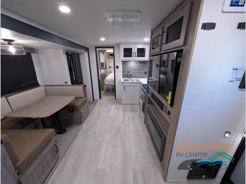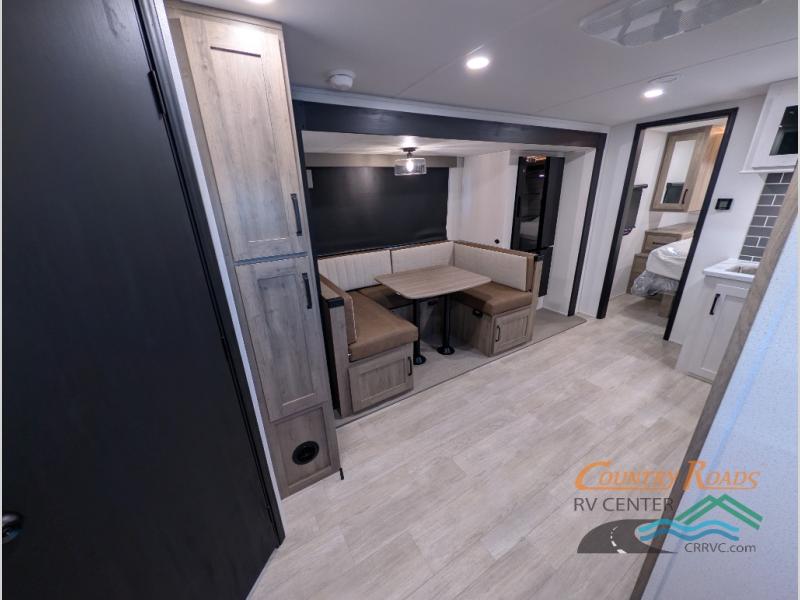Your friends and family will love camping with you in this trailer that offers sleeping space for eight with the queen bed, the double-size bunks and the U-shaped dinette once it is easily set up for sleeping space. The cook will love the full kitchen with its cooktop, microwave, electric refrigerator plus hidden pantry behind the entertainment center. A full bath with a 30" x 36" shower will let you freshen up each day, and you'll love having your own space in the front private bedroom!