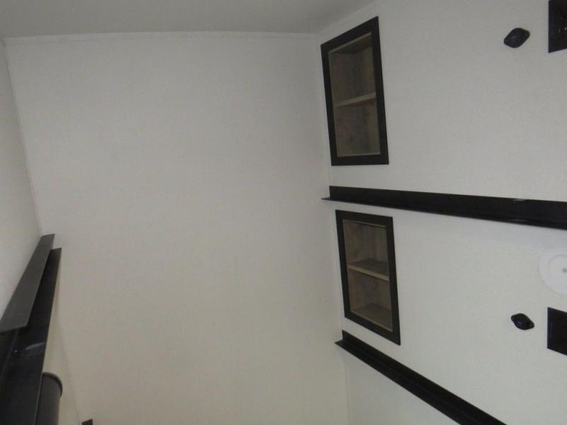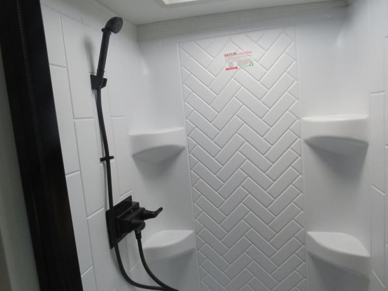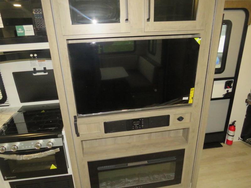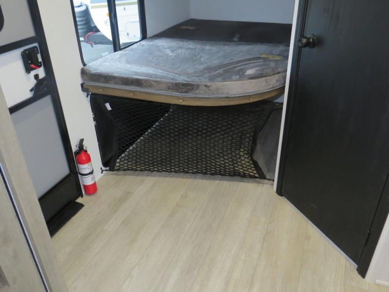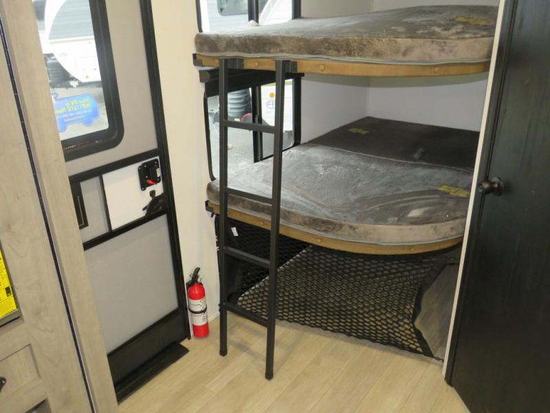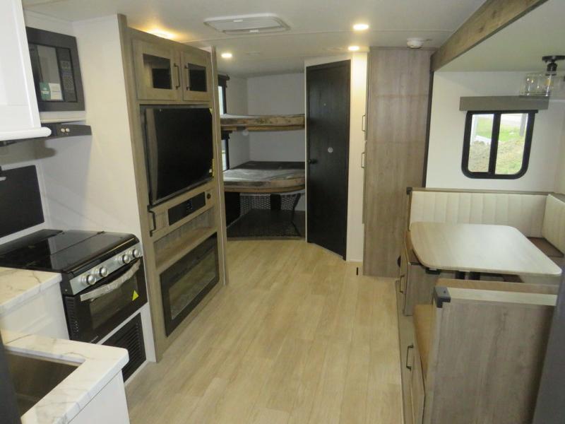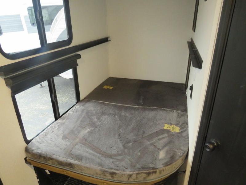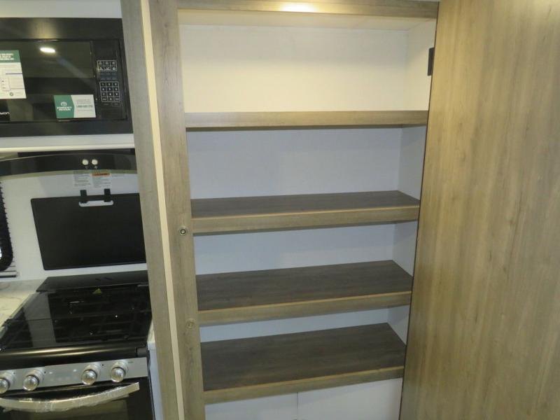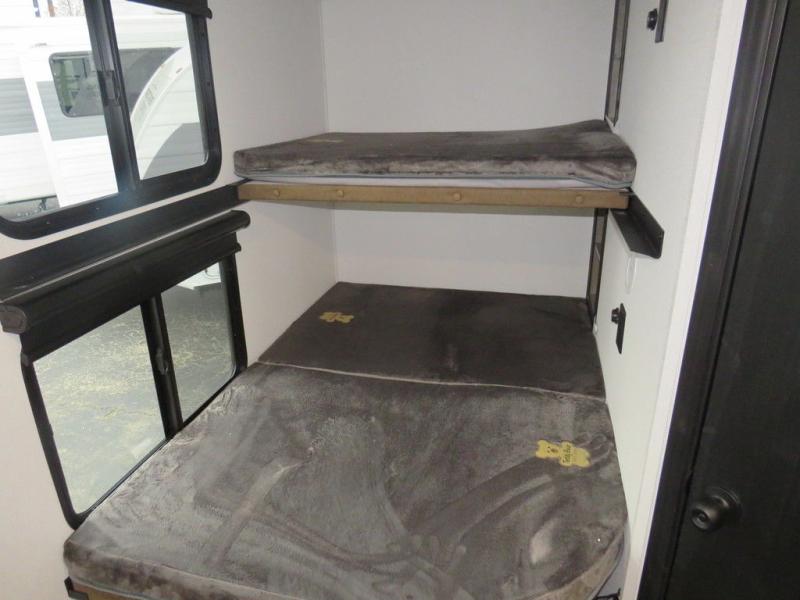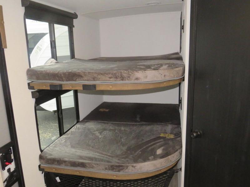 Your friends and family will love camping with you in this trailer that offers sleeping space for eight with the queen bed, the double-size bunks and the U-shaped dinette once it is easily set up for sleeping space. The cook will love the full kitchen with its cooktop, microwave, electric refrigerator plus hidden pantry behind the entertainment center. A full bath with a 30" x 36" shower will let you freshen up each day, and you'll love having your own space in the front private bedroom!