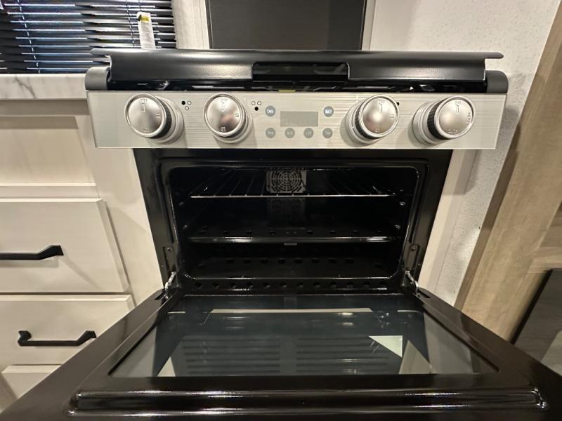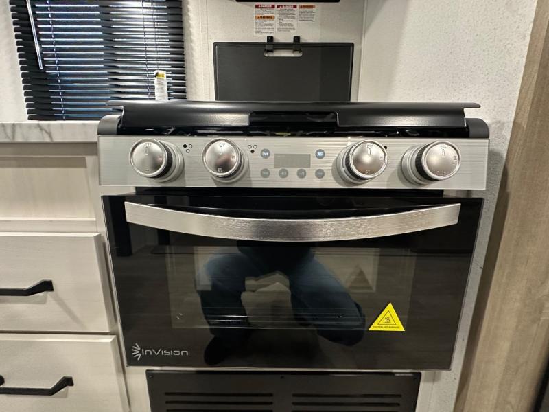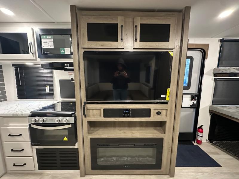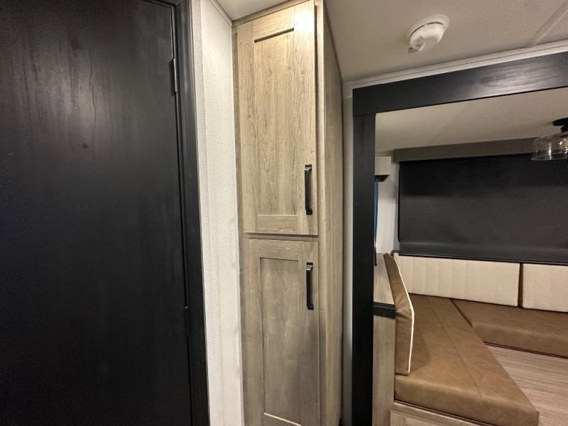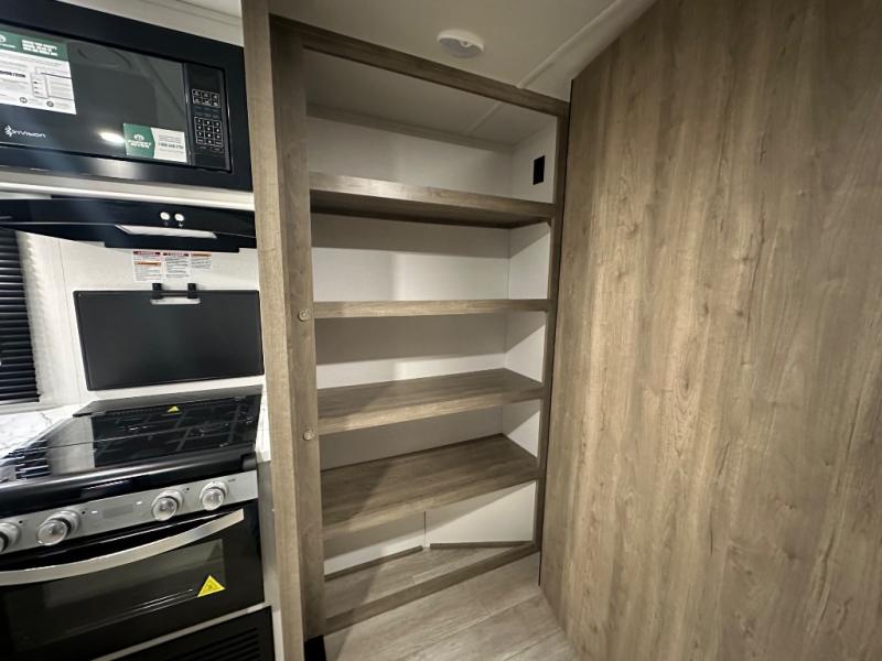 Your friends and family will love camping with you in this trailer that offers sleeping space for eight with the queen bed, the double-size bunks and the U-shaped dinette once it is easily set up for sleeping space. The cook will love the full kitchen with its cooktop, microwave, electric refrigerator plus hidden pantry behind the entertainment center. A full bath with a 30" x 36" shower will let you freshen up each day, and you'll love having your own space in the front private bedroom!