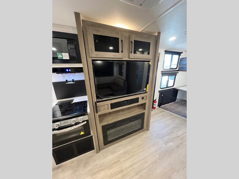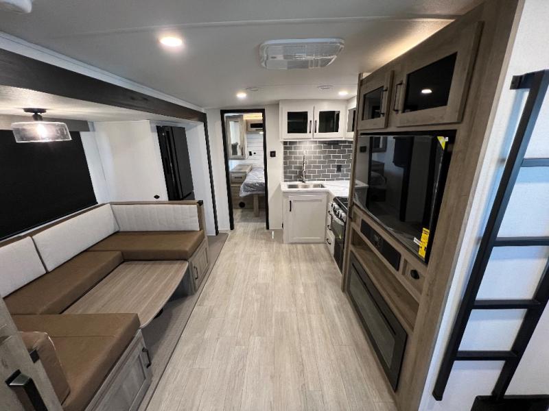 Your friends and family will love camping with you in this trailer that offers sleeping space for eight with the queen bed, the double-size bunks and the U-shaped dinette once it is easily set up for sleeping space. The cook will love the full kitchen with its cooktop, microwave, electric refrigerator plus hidden pantry behind the entertainment center. A full bath with a 30" x 36" shower will let you freshen up each day, and you'll love having your own space in the front private bedroom!