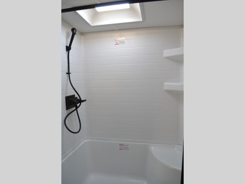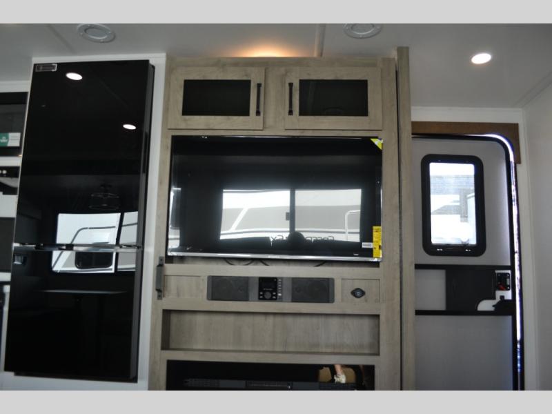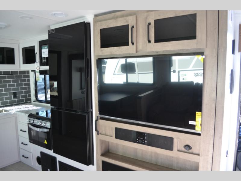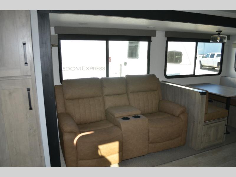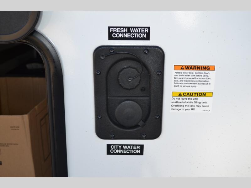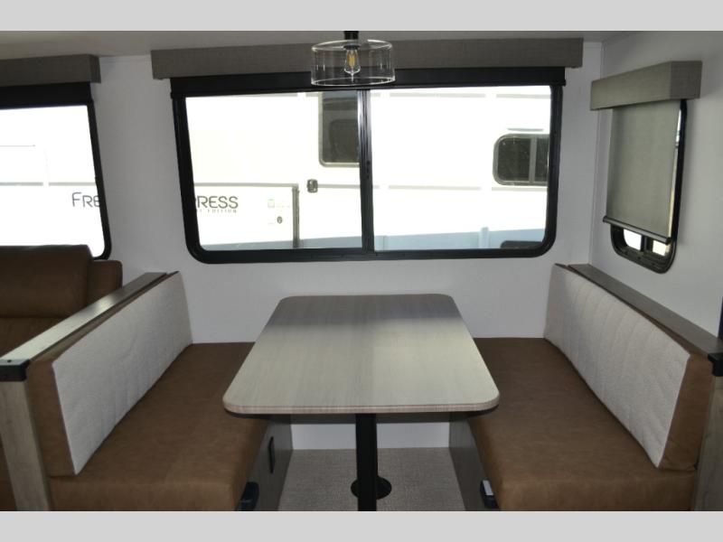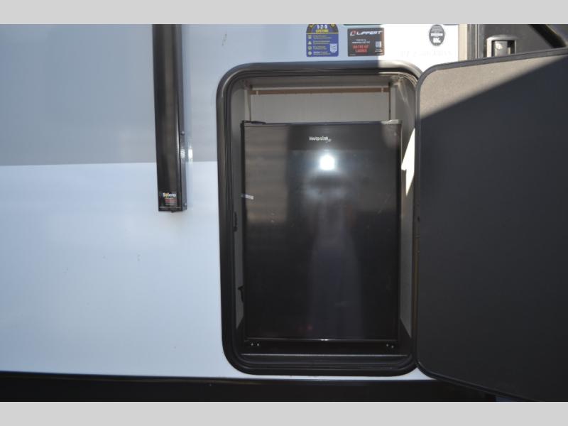 The large slide out in this trailer offers seating and sleeping space on a sofa sleeper and a booth dinette plus adds more floor space to the main living and kitchen area. The rear full bathroom has a 30" x 48" shower with a seat and a linen closet for towels and such, and the front bedroom includes a queen bed and clothing storage plus windows for views of your campsite. And the chef of your group can make meals in the full kitchen, complete with a cooktop, microwave and electric refrigerator! The 21' power awning provides an outdoor living area protected from the elements, and the exterior offers a drop frame pass-thru for ample storage space!