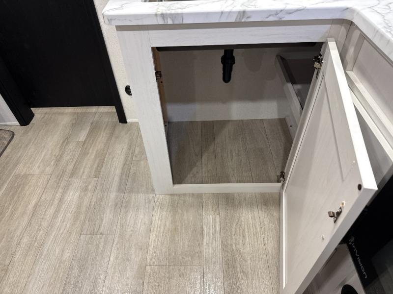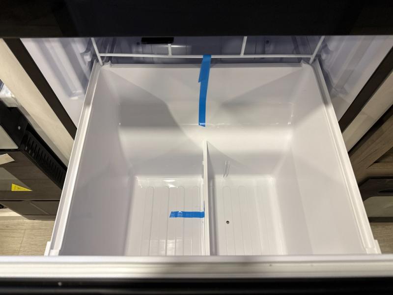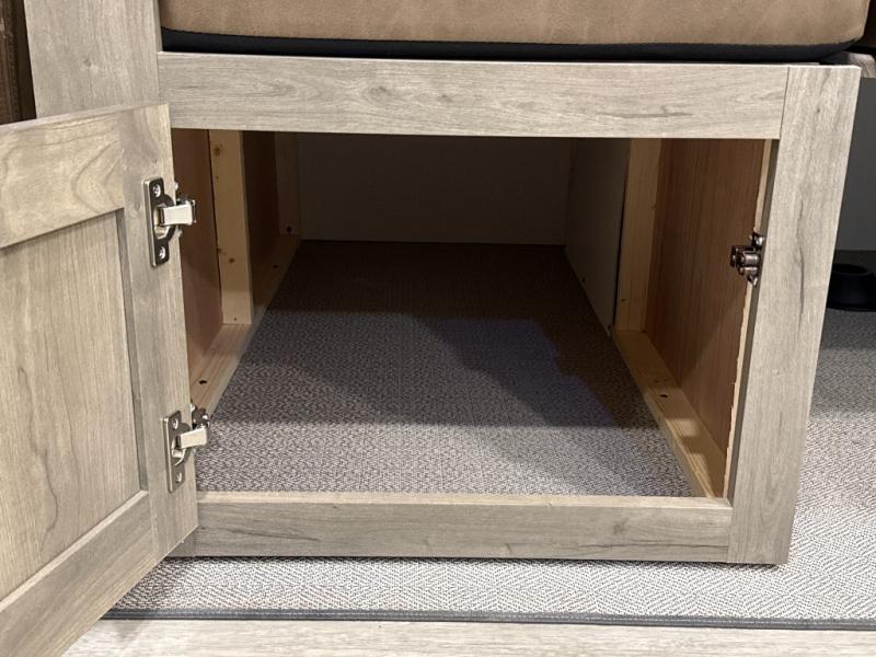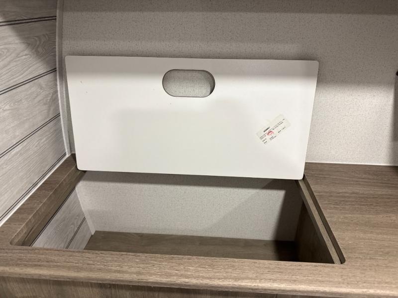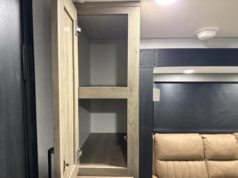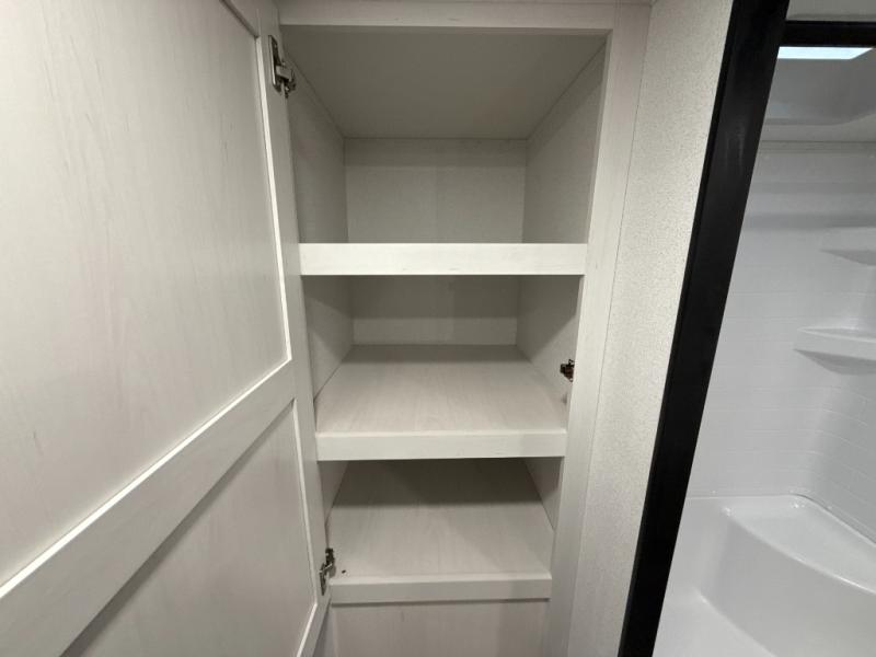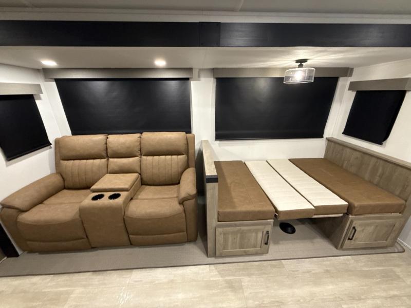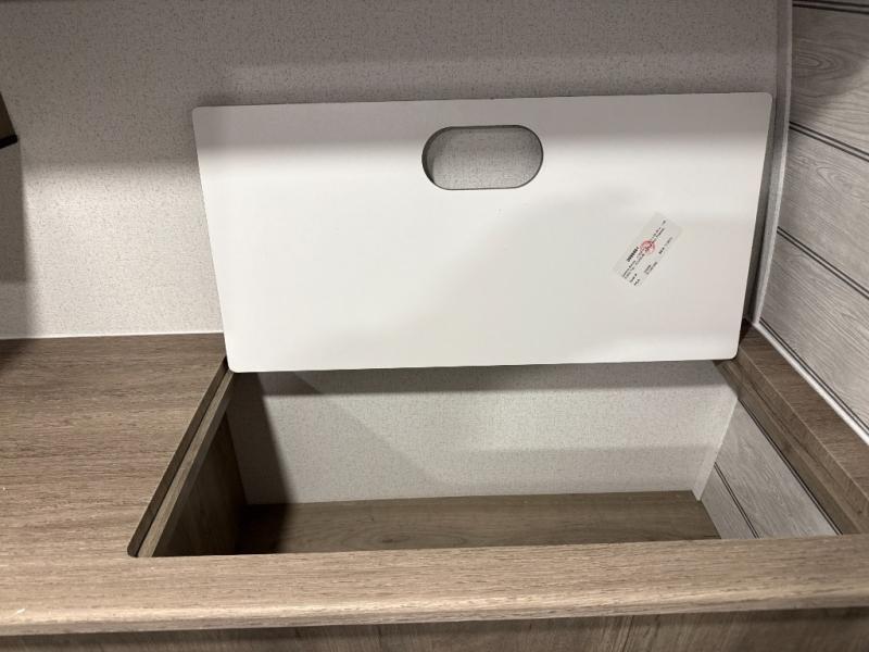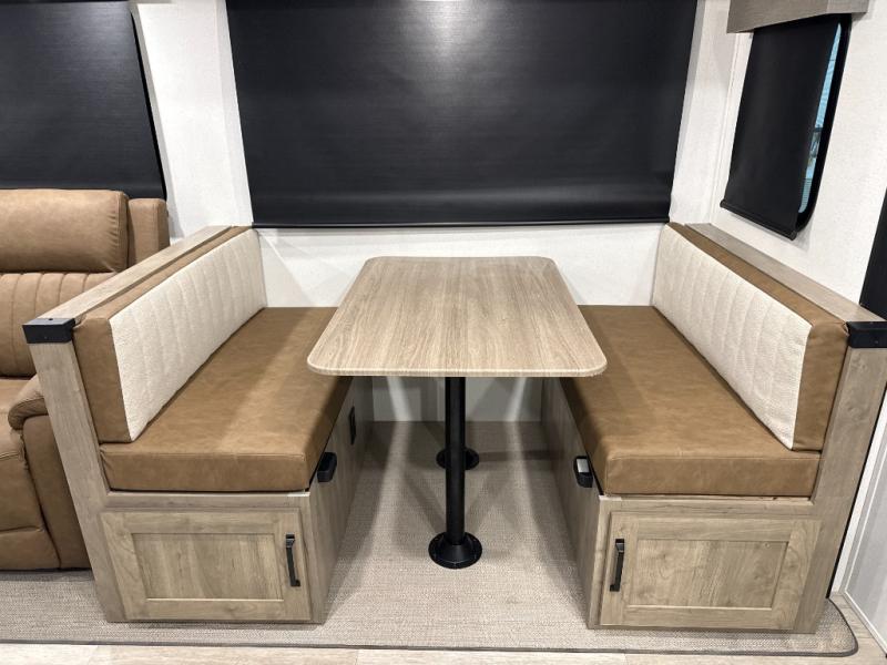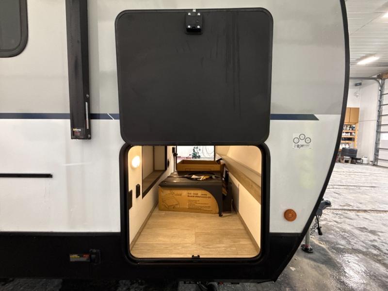 The large slide out in this trailer offers seating and sleeping space on a sofa sleeper and a booth dinette plus adds more floor space to the main living and kitchen area. The rear full bathroom has a 30" x 48" shower with a seat and a linen closet for towels and such, and the front bedroom includes a queen bed and clothing storage plus windows for views of your campsite. And the chef of your group can make meals in the full kitchen, complete with a cooktop, microwave and electric refrigerator! The 21' power awning provides an outdoor living area protected from the elements, and the exterior offers a drop frame pass-thru for ample storage space!