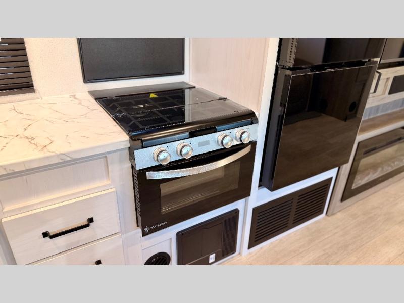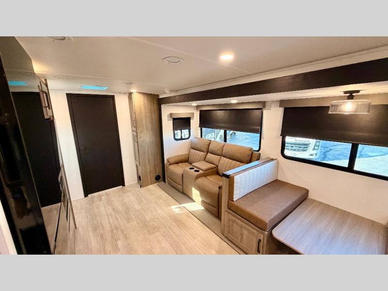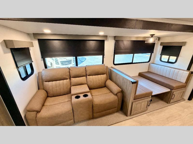 The large slide out in this trailer offers seating and sleeping space on a sofa sleeper and a booth dinette plus adds more floor space to the main living and kitchen area. The rear full bathroom has a 30" x 48" shower with a seat and a linen closet for towels and such, and the front bedroom includes a queen bed and clothing storage plus windows for views of your campsite. And the chef of your group can make meals in the full kitchen, complete with a cooktop, microwave and electric refrigerator! The 21' power awning provides an outdoor living area protected from the elements, and the exterior offers a drop frame pass-thru for ample storage space!
