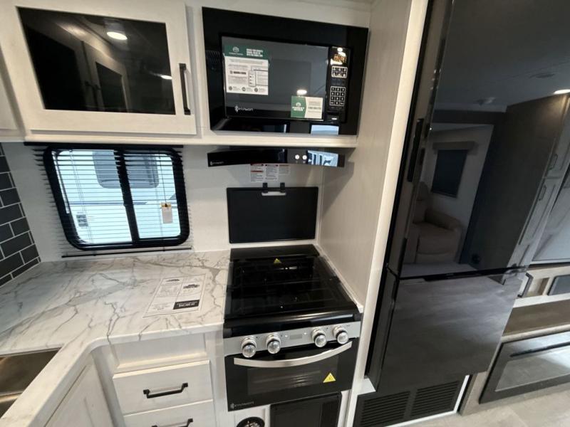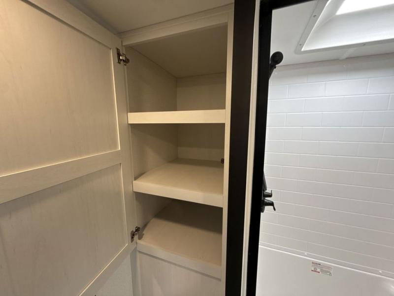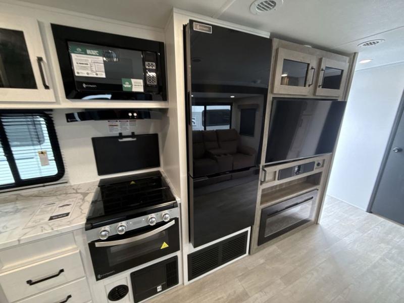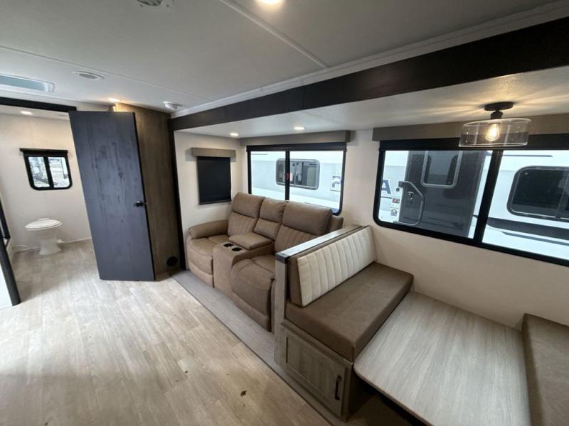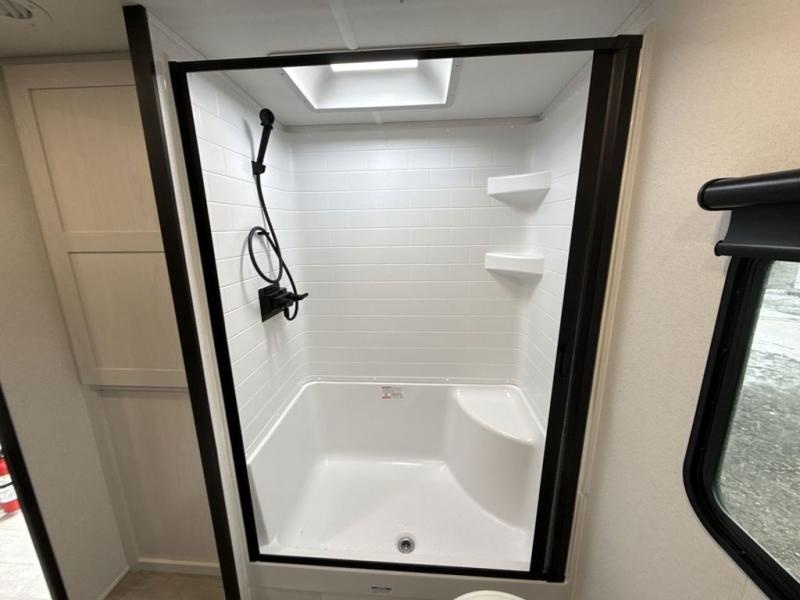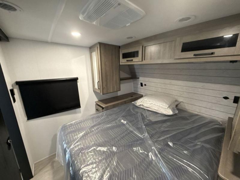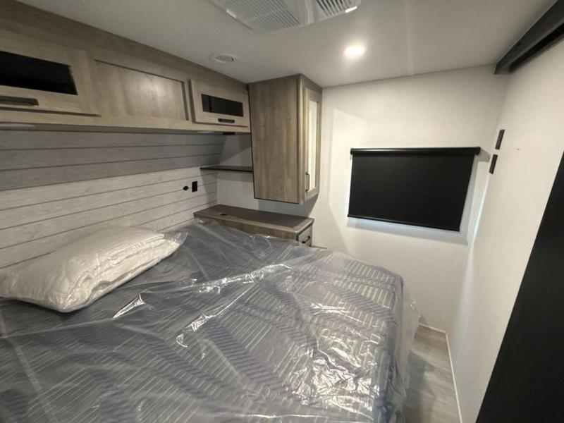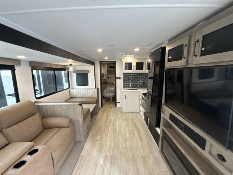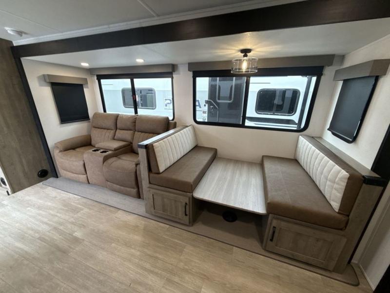 The large slide out in this trailer offers seating and sleeping space on a sofa sleeper and a booth dinette plus adds more floor space to the main living and kitchen area. The rear full bathroom has a 30" x 48" shower with a seat and a linen closet for towels and such, and the front bedroom includes a queen bed and clothing storage plus windows for views of your campsite. And the chef of your group can make meals in the full kitchen, complete with a cooktop, microwave and electric refrigerator! The 21' power awning provides an outdoor living area protected from the elements, and the exterior offers a drop frame pass-thru for ample storage space!