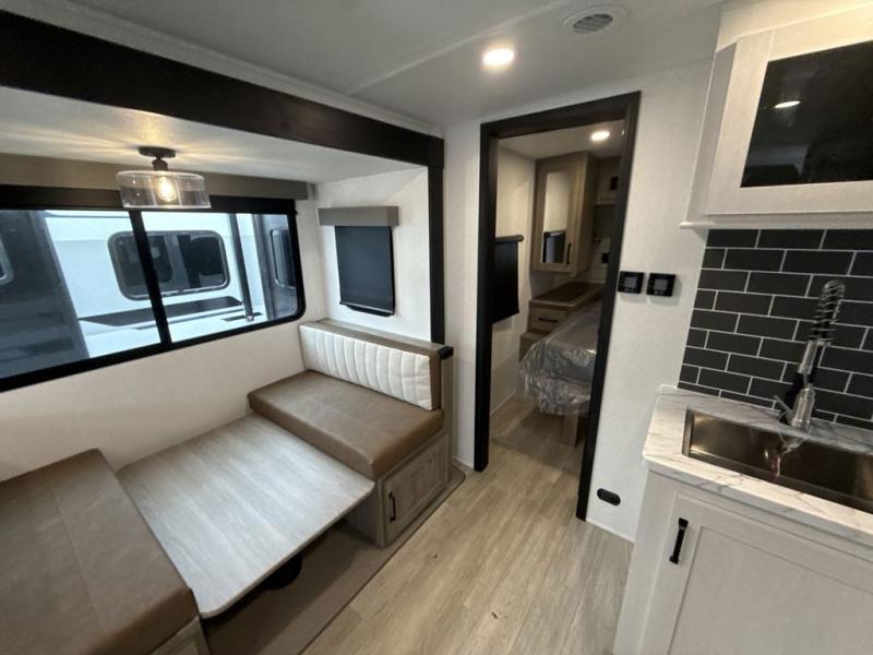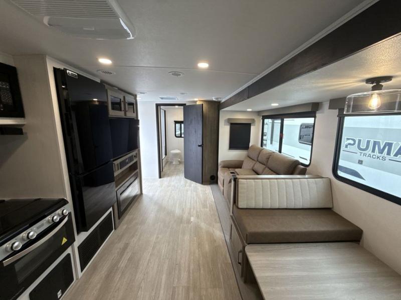 Each Puma Tracks travel trailer by Forest River is constructed with a fully enclosed/heated underbelly for added protection against the elements, plus a fully laminated roof and rear wall for durability. The slam latch baggage doors with magnets will make it easier than ever to pack up your camp gear, and the power awning with LED lights will provide shade during the day and inviting ambiance at night. Head inside to enjoy the roller shades, smoked glass kitchen cabinet doors, stainless-steel sink, and LED lights to keep your space well lit. Some of the available options include a bedroom A/C, a Wi-Fi booster, heated holding tanks, and more!