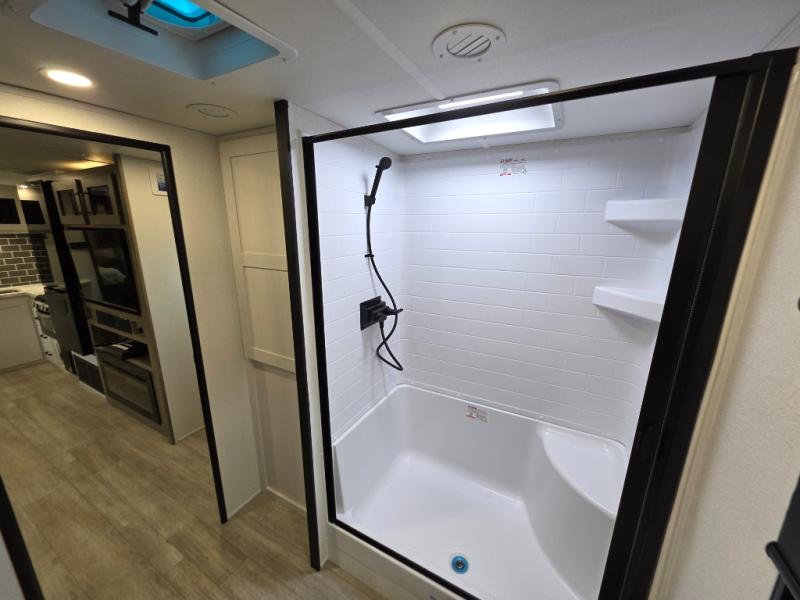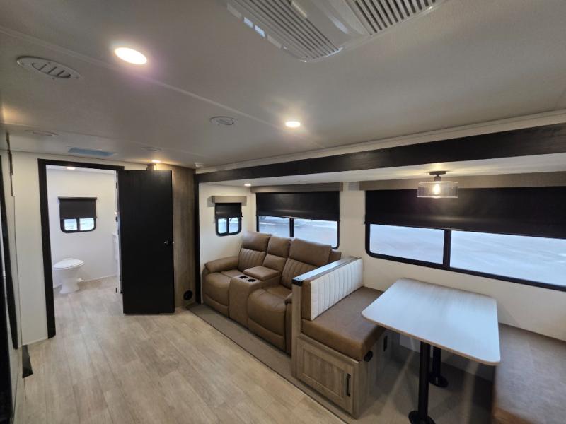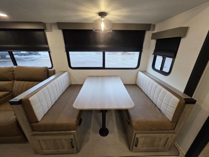 The large slide out in this trailer offers seating and sleeping space on a sofa sleeper and a booth dinette plus adds more floor space to the main living and kitchen area. The rear full bathroom has a 30" x 48" shower with a seat and a linen closet for towels and such, and the front bedroom includes a queen bed and clothing storage plus windows for views of your campsite. And the chef of your group can make meals in the full kitchen, complete with a cooktop, microwave and electric refrigerator! The 21' power awning provides an outdoor living area protected from the elements, and the exterior offers a drop frame pass-thru for ample storage space!