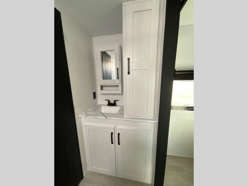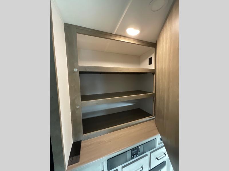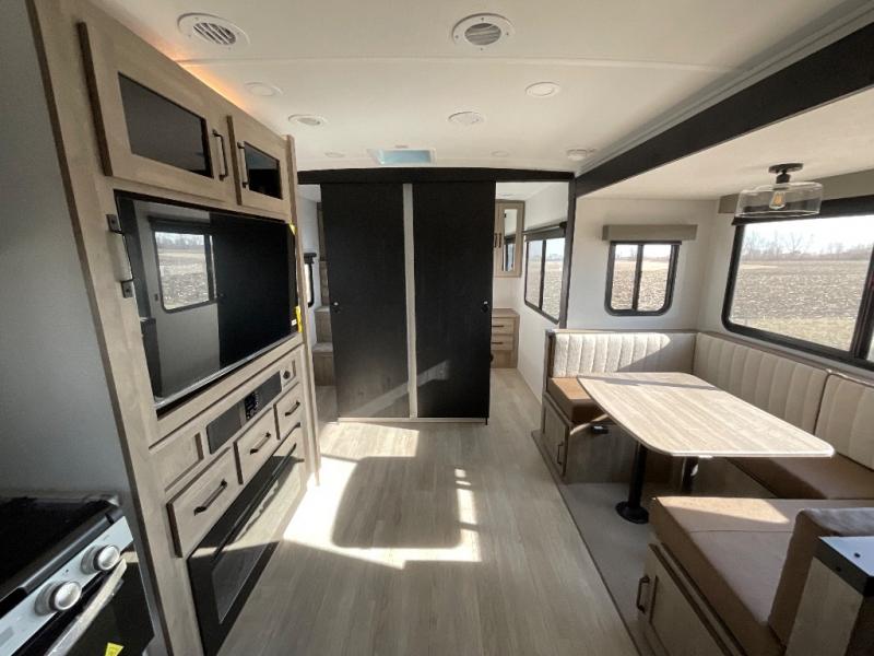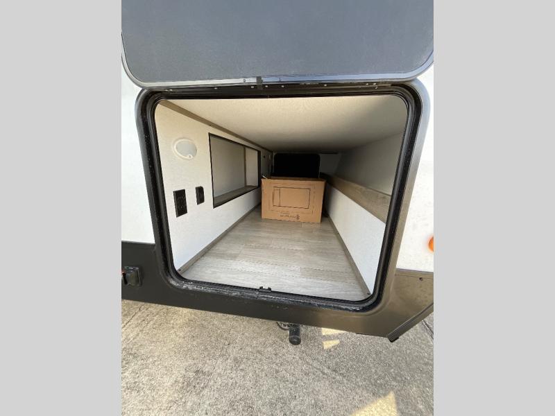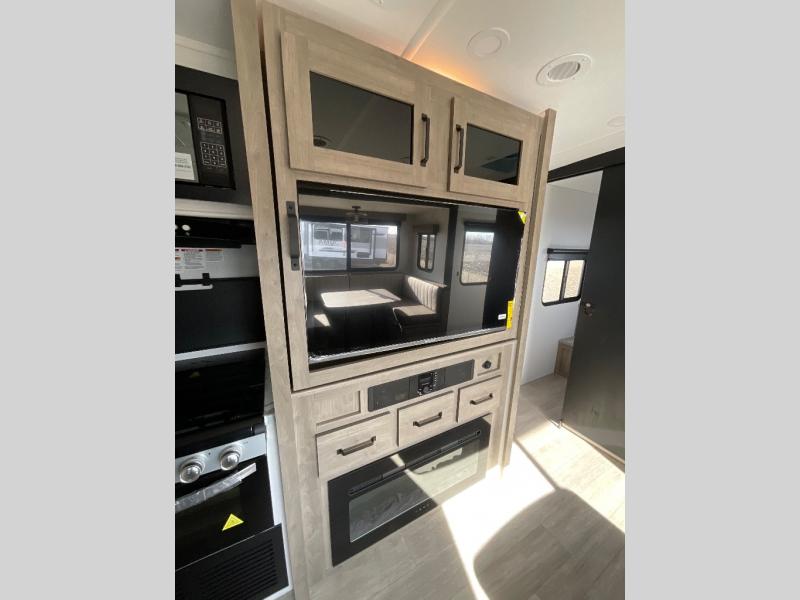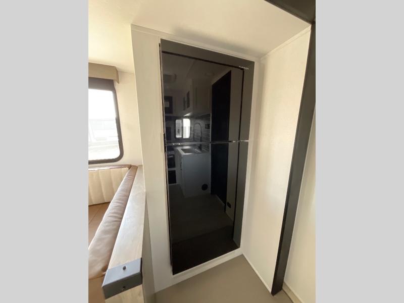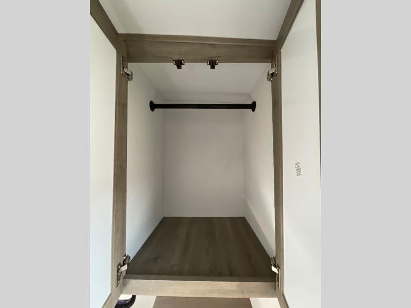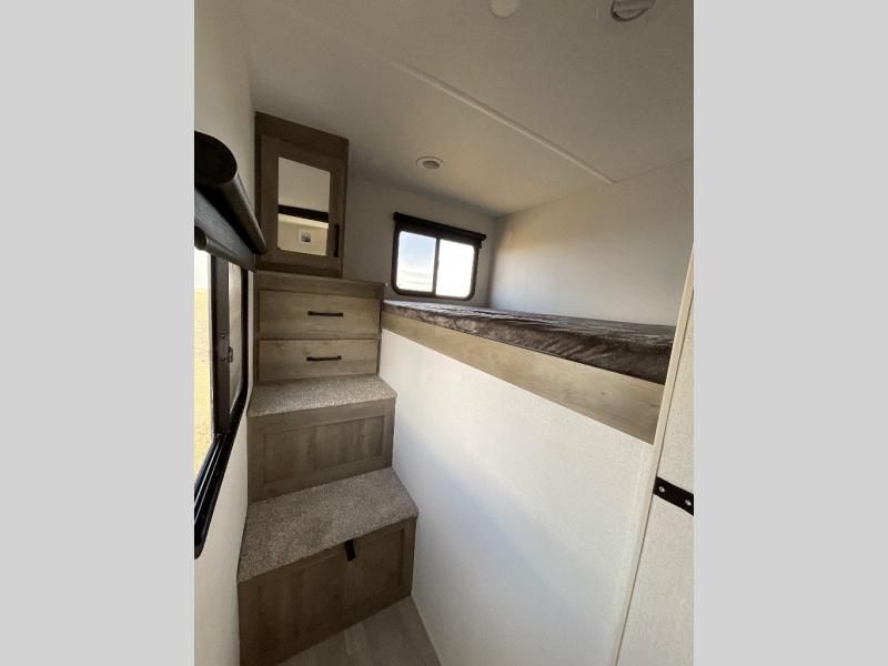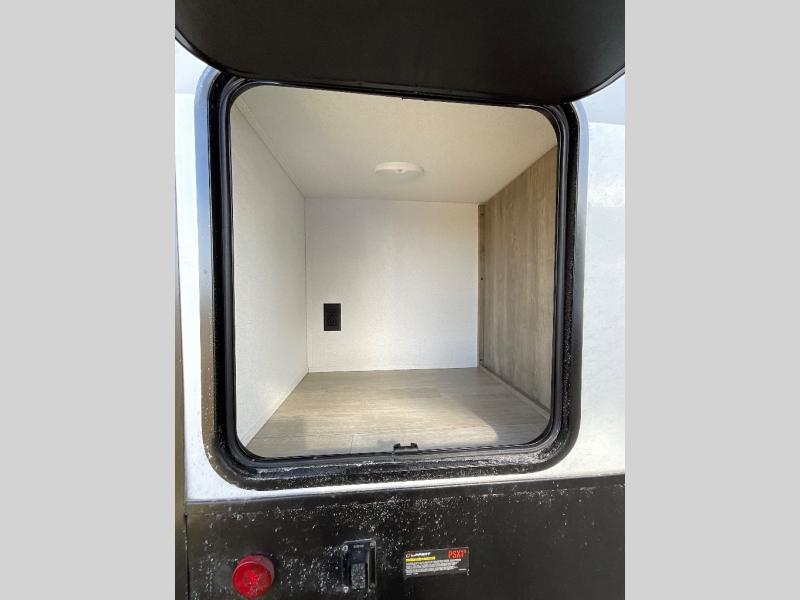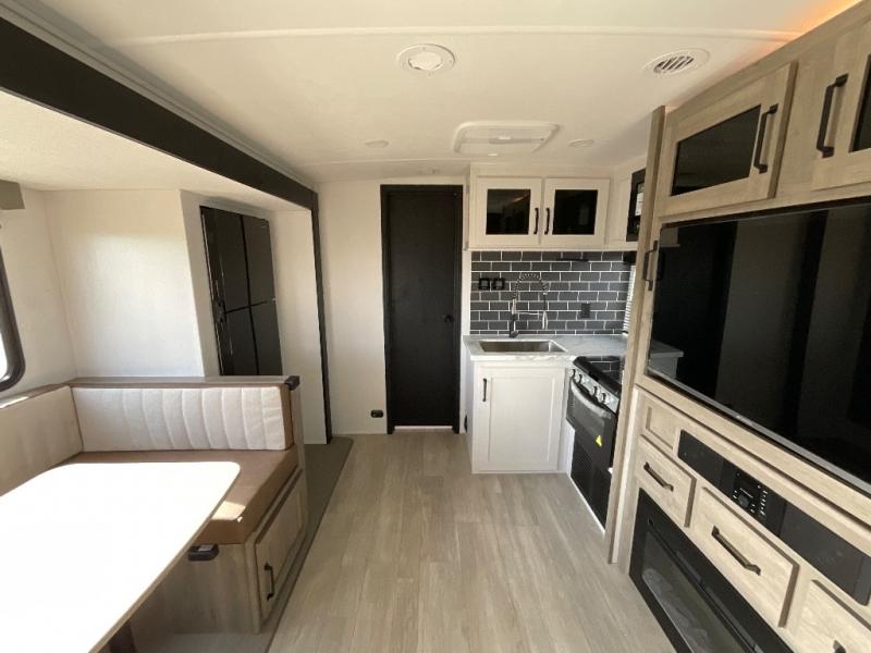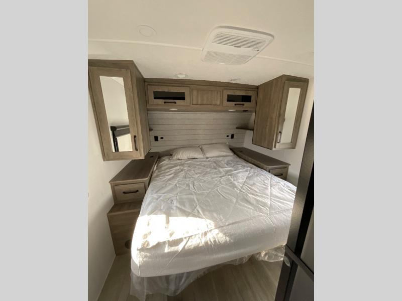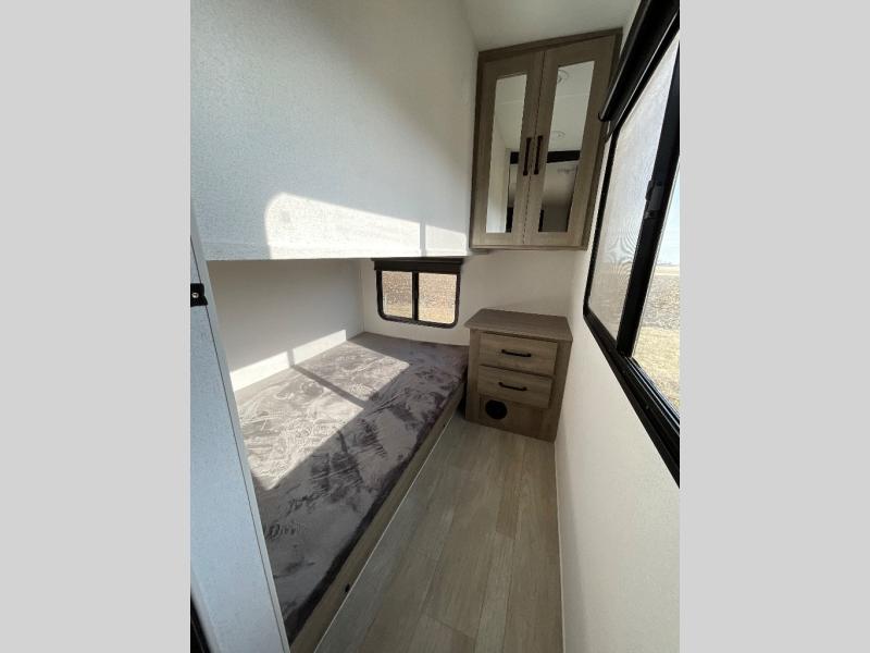 Camping with friends and family just got easier in this spacious travel trailer for six! You'll have your own master bedroom up front with a queen bed, dual wardrobes, and your own private entrance into the walk-thru bath. The unique private bunkhouse in the back features privacy doors and a bunk on each side, along with a nightstand and wardrobe, giving your guests or older children their own space! In the morning, everyone can meet in the combined kitchen and living area as the chef of your group makes breakfast, and there is a U-shaped dinette slide where you can dine together. This unit also includes an entertainment center with a TV, fireplace, plus a hidden pantry behind the TV for snacks, board games, movies and more!