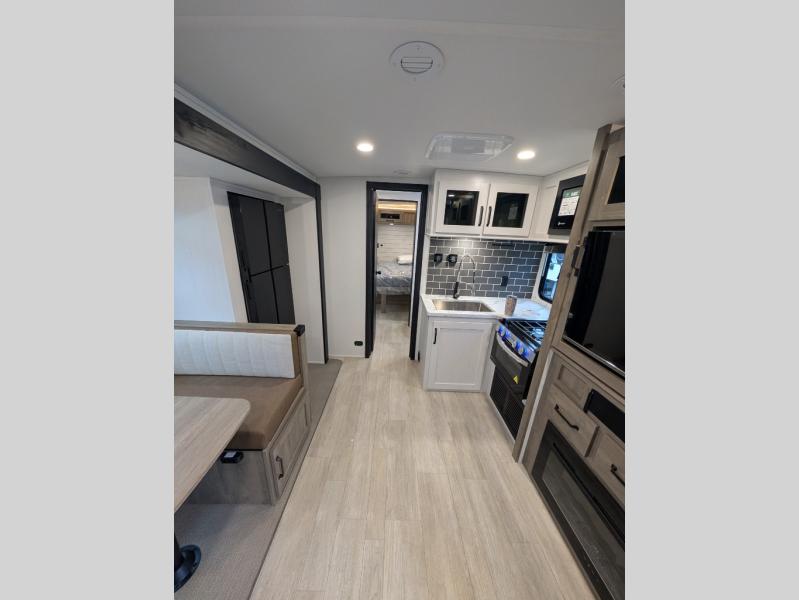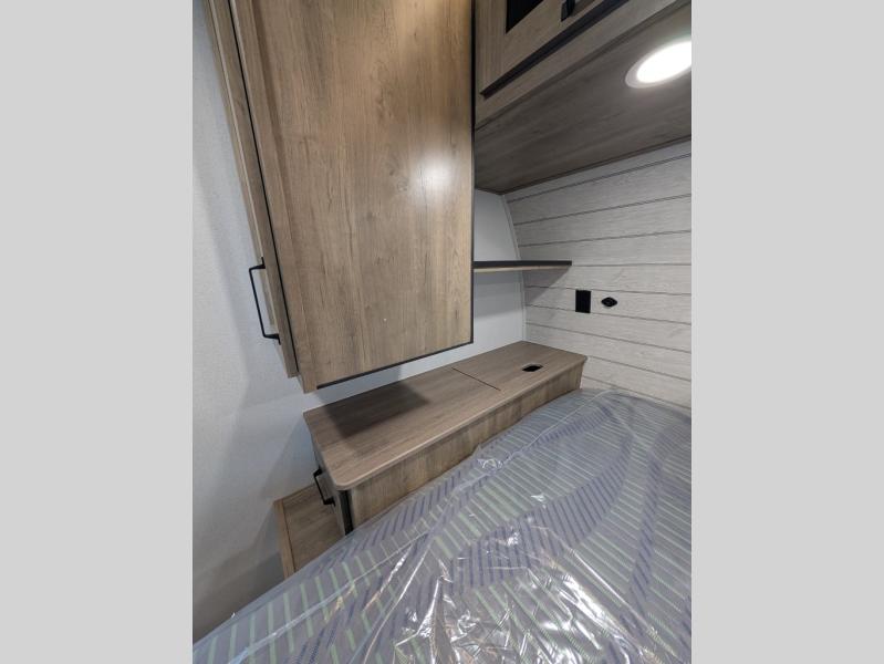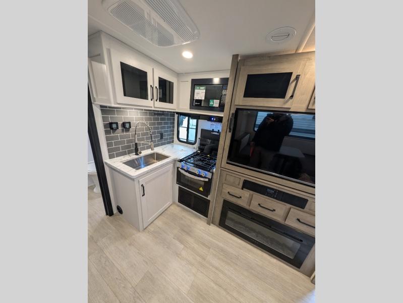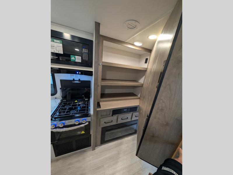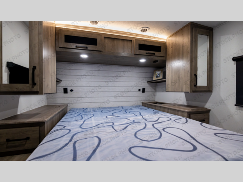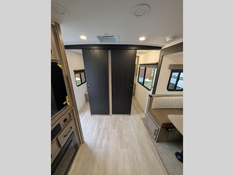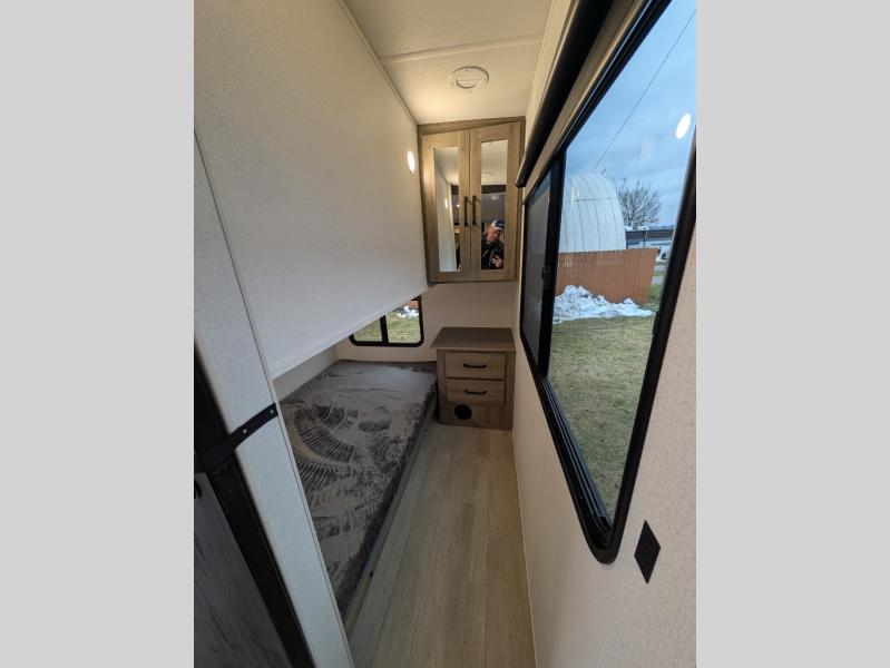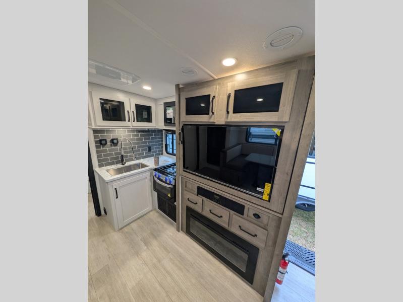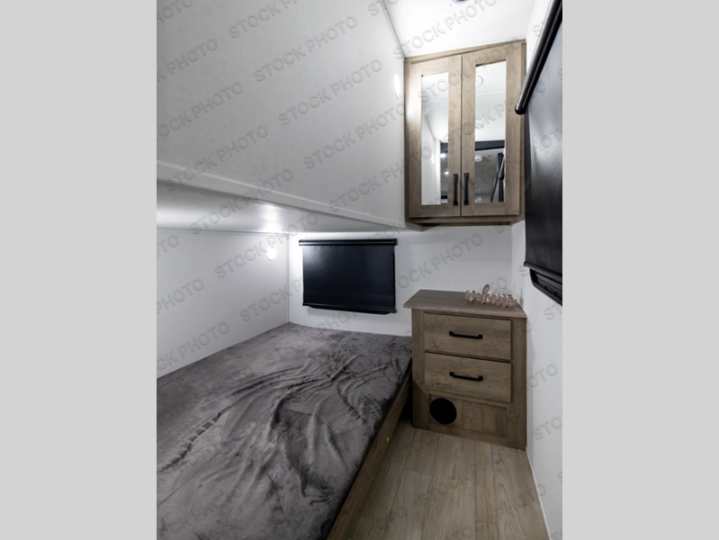 Camping with friends and family just got easier in this spacious travel trailer for six! You'll have your own master bedroom up front with a queen bed, dual wardrobes, and your own private entrance into the walk-thru bath. The unique private bunkhouse in the back features privacy doors and a bunk on each side, along with a nightstand and wardrobe, giving your guests or older children their own space! In the morning, everyone can meet in the combined kitchen and living area as the chef of your group makes breakfast, and there is a U-shaped dinette slide where you can dine together. This unit also includes an entertainment center with a TV, fireplace, plus a hidden pantry behind the TV for snacks, board games, movies and more!