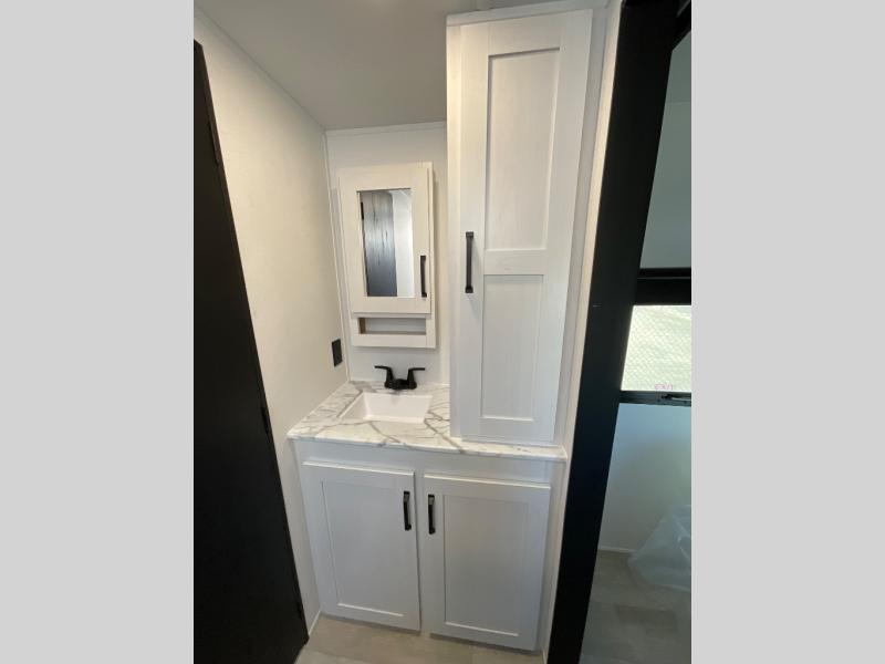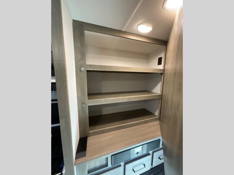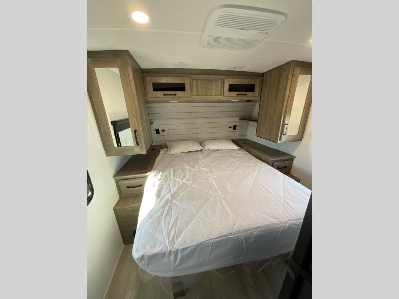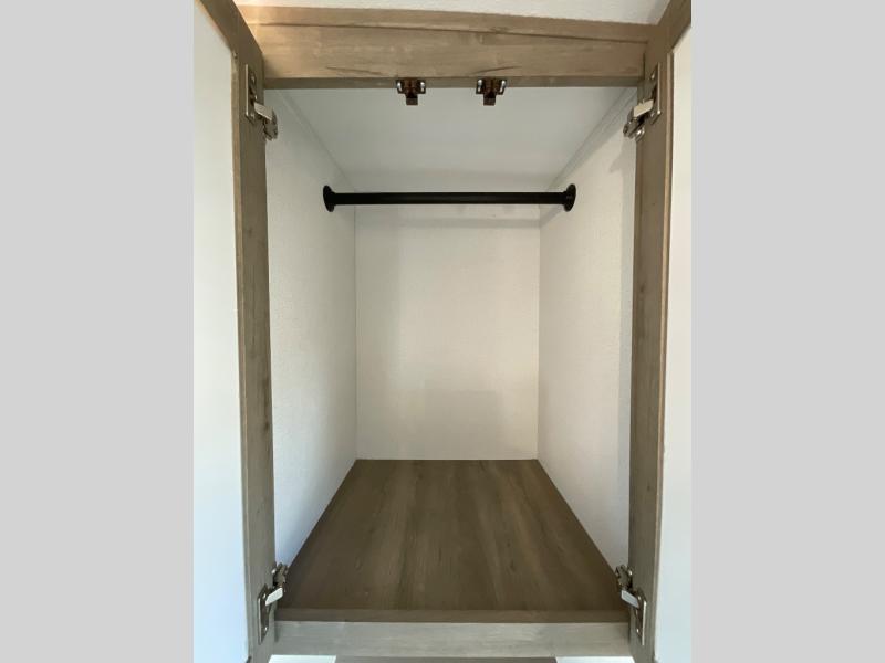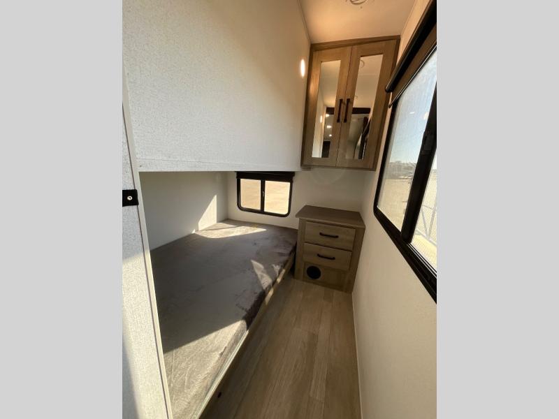 Camping with friends and family just got easier in this spacious travel trailer for six! You'll have your own master bedroom up front with a queen bed, dual wardrobes, and your own private entrance into the walk-thru bath. The unique private bunkhouse in the back features privacy doors and a bunk on each side, along with a nightstand and wardrobe, giving your guests or older children their own space! In the morning, everyone can meet in the combined kitchen and living area as the chef of your group makes breakfast, and there is a U-shaped dinette slide where you can dine together. This unit also includes an entertainment center with a TV, fireplace, plus a hidden pantry behind the TV for snacks, board games, movies and more!
