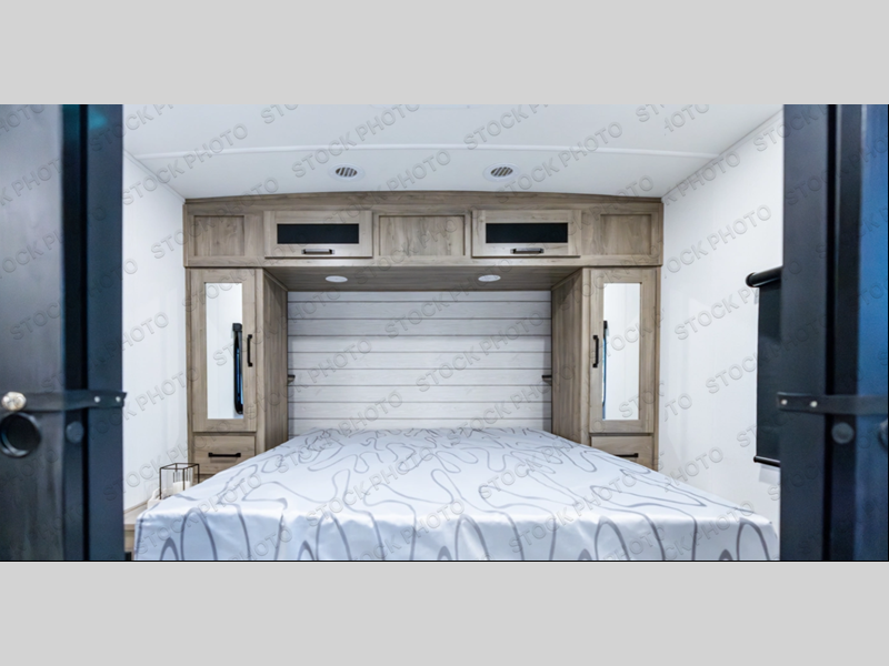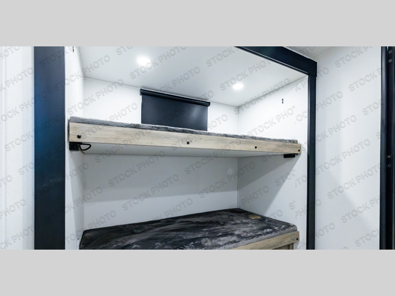 If you enjoy camping with a larger group, this travel trailer is perfect since you can sleep nine to ten each night! The rear bunkhouse includes four 34" x 70" bunk beds, with two of the bunks found within a slide out for more floor space. A second slide out is found in the combined kitchen and living room, giving your crew more space to dine at the booth dinette, relax on the sofa sleeper, and cook in the full kitchen. Up front, an RV queen bed and dual wardrobes are found in the bedroom, and there is TV prep here if you want the option to watch movies in bed!