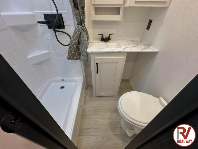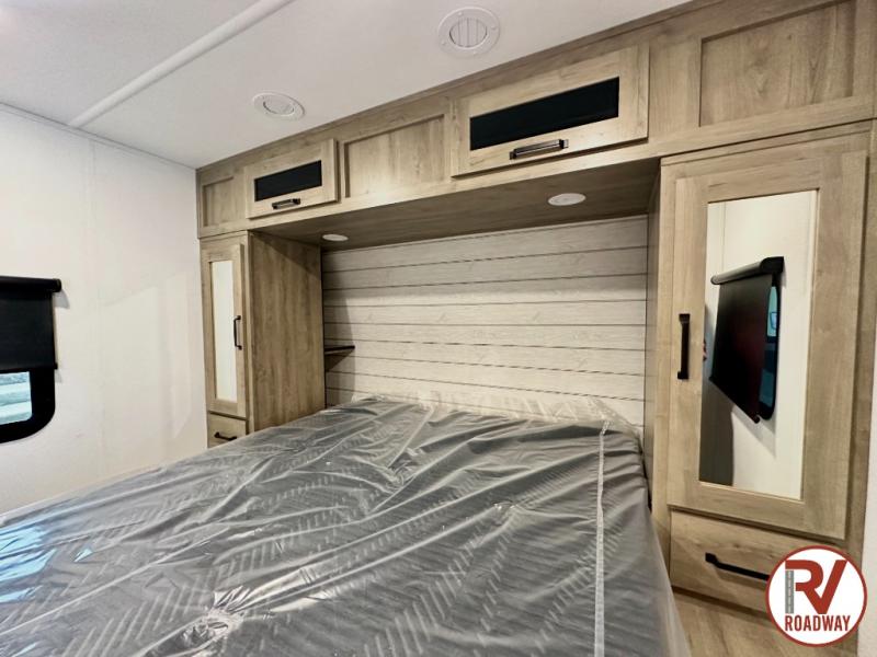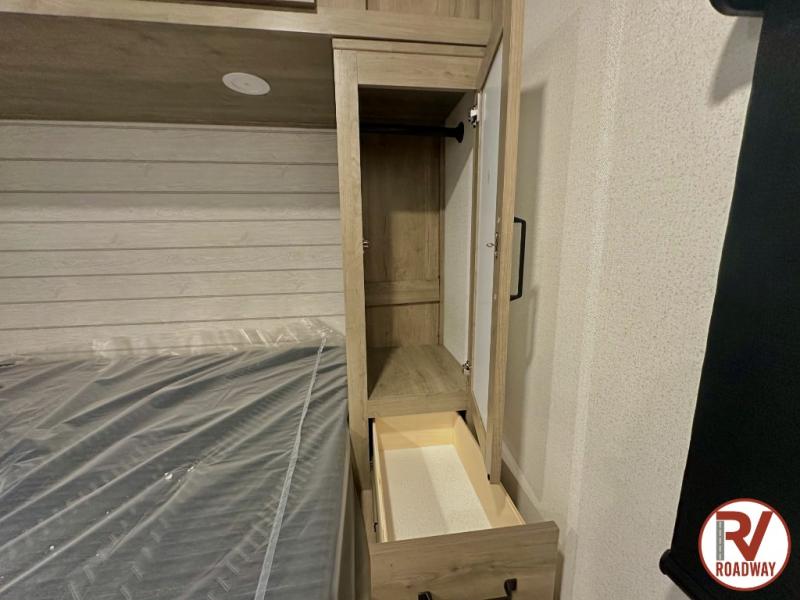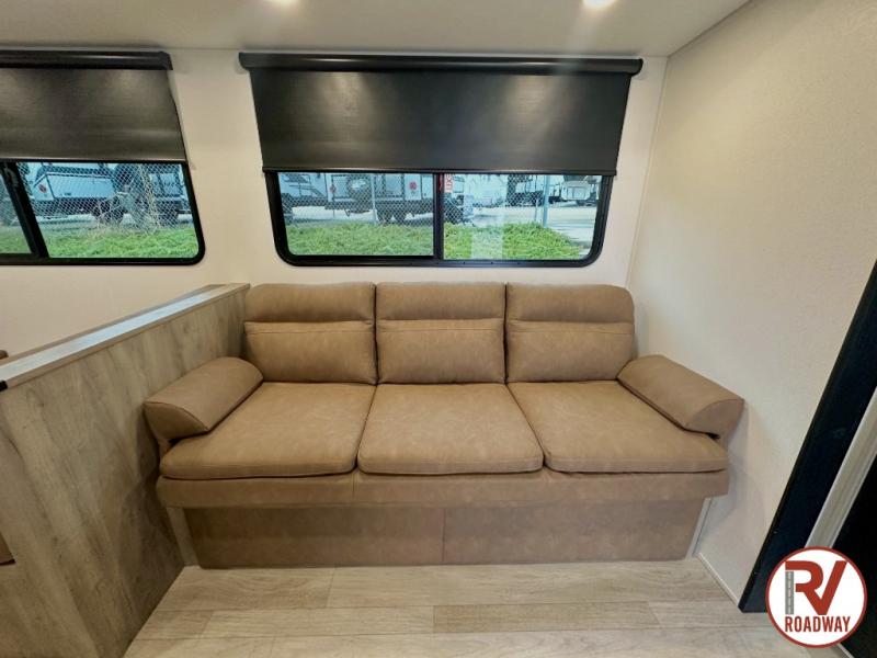 If you enjoy camping with a larger group, this travel trailer is perfect since you can sleep nine to ten each night! The rear bunkhouse includes four 34" x 70" bunk beds, with two of the bunks found within a slide out for more floor space. A second slide out is found in the combined kitchen and living room, giving your crew more space to dine at the booth dinette, relax on the sofa sleeper, and cook in the full kitchen. Up front, an RV queen bed and dual wardrobes are found in the bedroom, and there is TV prep here if you want the option to watch movies in bed!