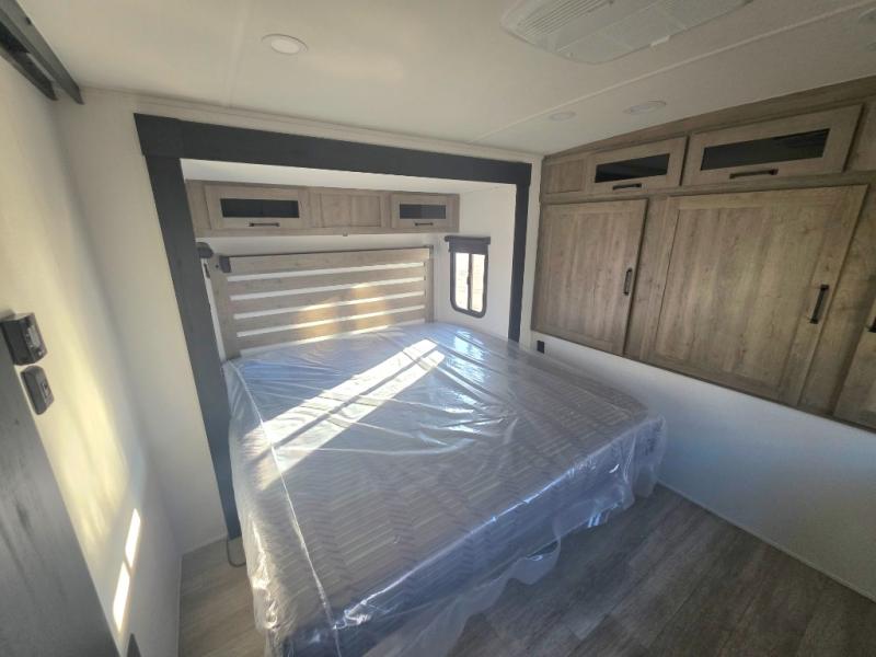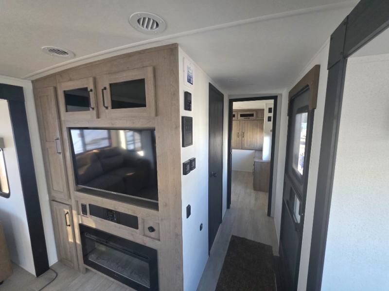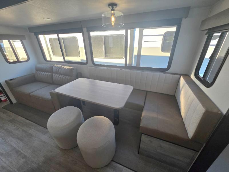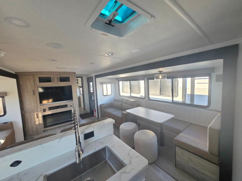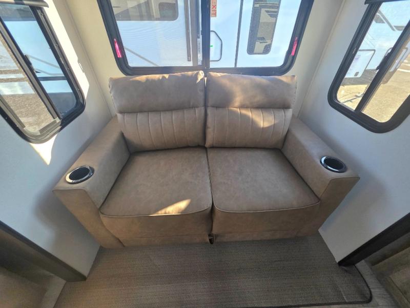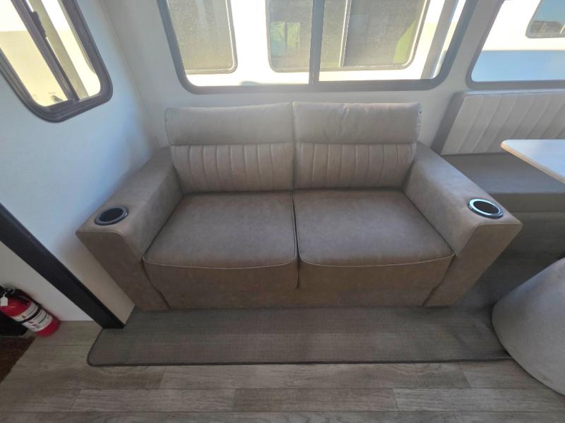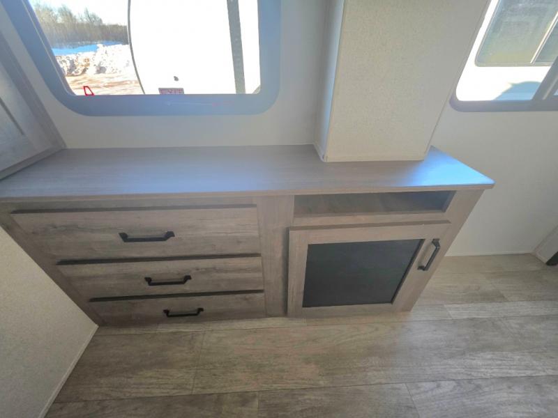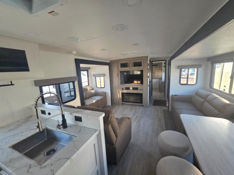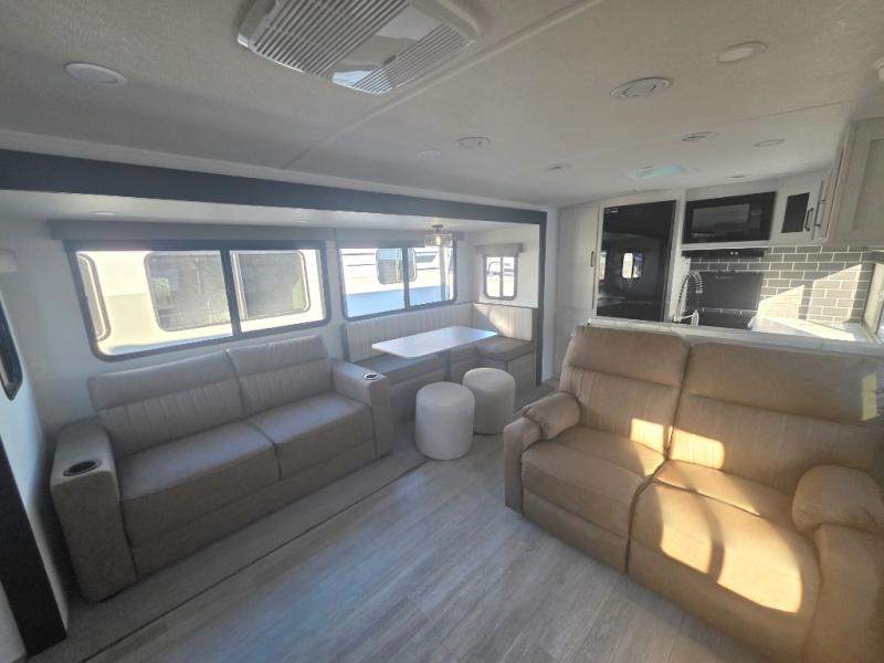 One look at this spacious travel trailer and you'll be sold! The rear kitchen features a U-shaped counter, an 11-cu. ft. refrigerator, plus a pantry for dry goods and snacks. There is a 1/2 dinette with bench seating, plus a tri-fold sofa and two theater seats. Everyone can take turns cleaning up in the full bath that includes a shower with a seat, then head outdoors to relax under the patio awnings with LED lights. When it's time for bed, you will enjoy the king bed slide out in the front bedroom. You'll also find a dresser and a closet here, plus a wardrobe with washer and dryer prep if you choose to add those appliances!