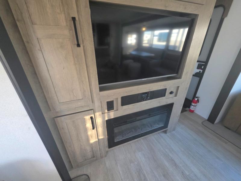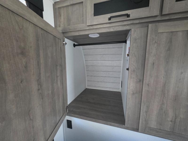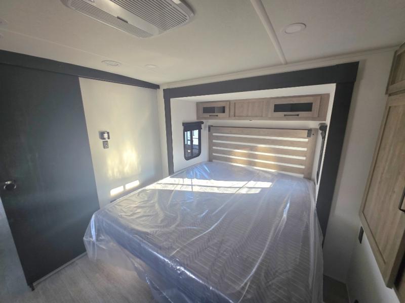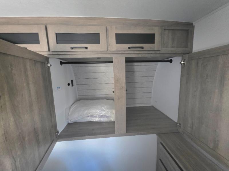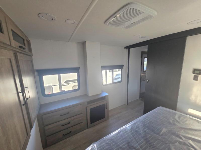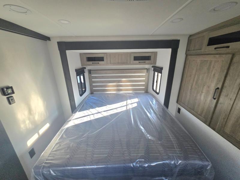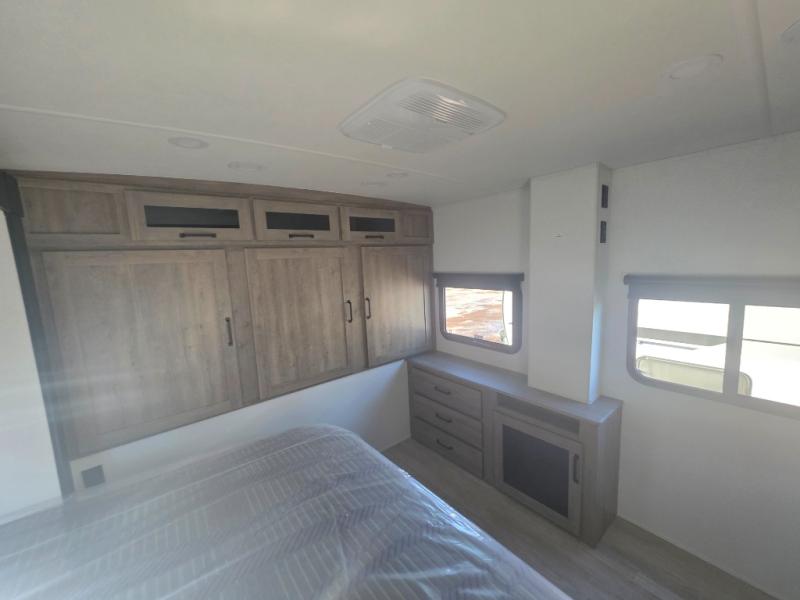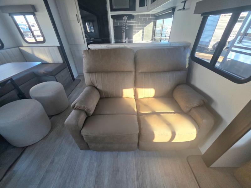 One look at this spacious travel trailer and you'll be sold! The rear kitchen features a U-shaped counter, an 11-cu. ft. refrigerator, plus a pantry for dry goods and snacks. There is a 1/2 dinette with bench seating, plus a tri-fold sofa and two theater seats. Everyone can take turns cleaning up in the full bath that includes a shower with a seat, then head outdoors to relax under the patio awnings with LED lights. When it's time for bed, you will enjoy the king bed slide out in the front bedroom. You'll also find a dresser and a closet here, plus a wardrobe with washer and dryer prep if you choose to add those appliances!