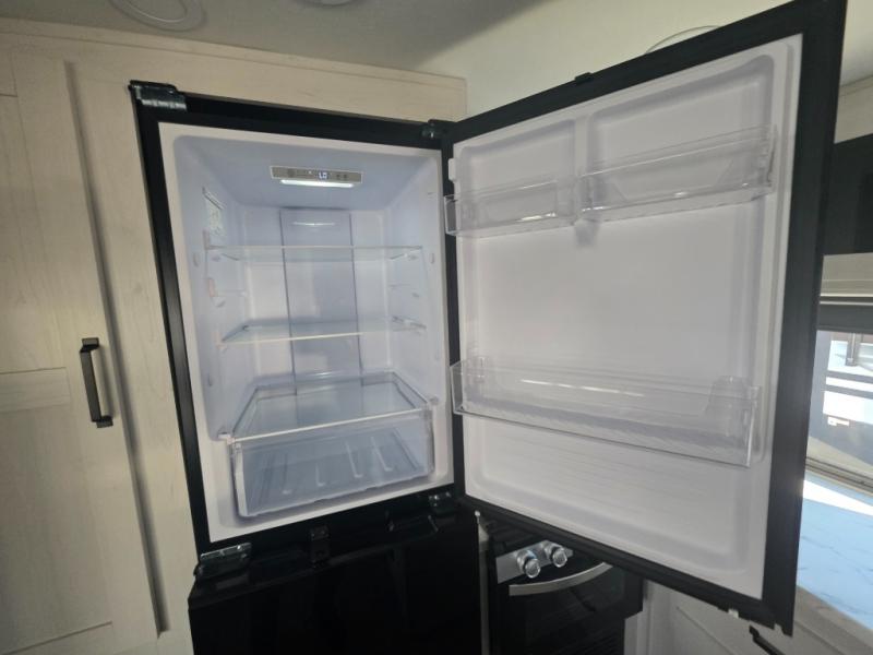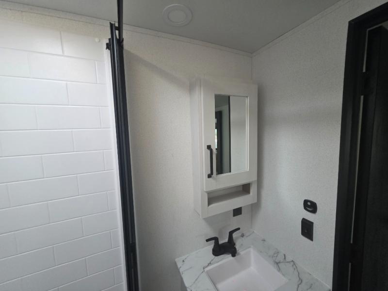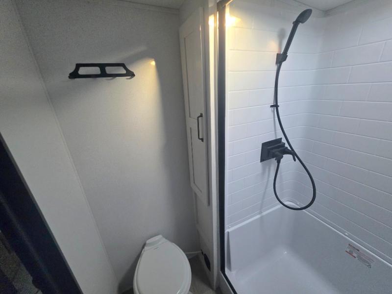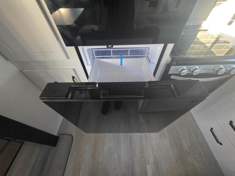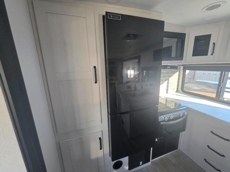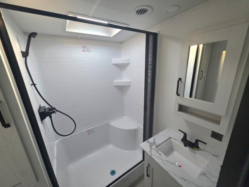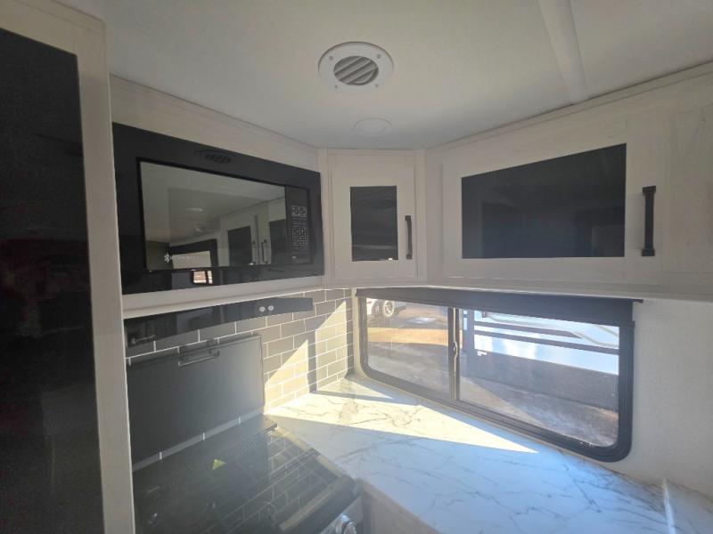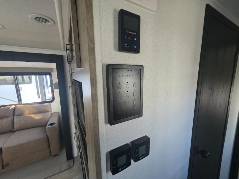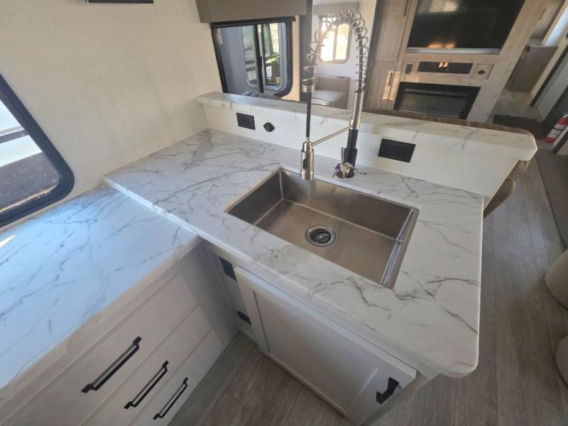 One look at this spacious travel trailer and you'll be sold! The rear kitchen features a U-shaped counter, an 11-cu. ft. refrigerator, plus a pantry for dry goods and snacks. There is a 1/2 dinette with bench seating, plus a tri-fold sofa and two theater seats. Everyone can take turns cleaning up in the full bath that includes a shower with a seat, then head outdoors to relax under the patio awnings with LED lights. When it's time for bed, you will enjoy the king bed slide out in the front bedroom. You'll also find a dresser and a closet here, plus a wardrobe with washer and dryer prep if you choose to add those appliances!