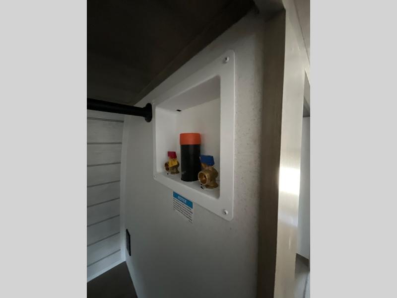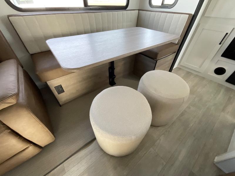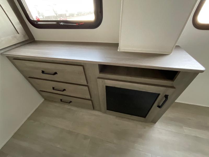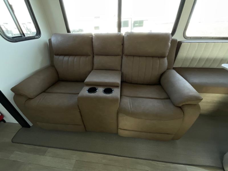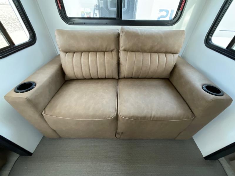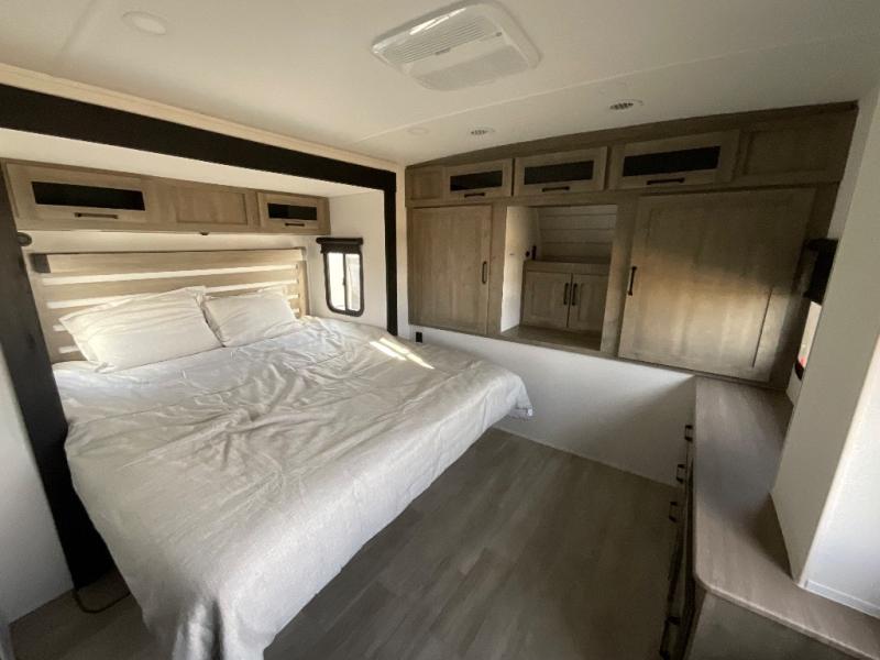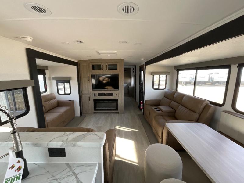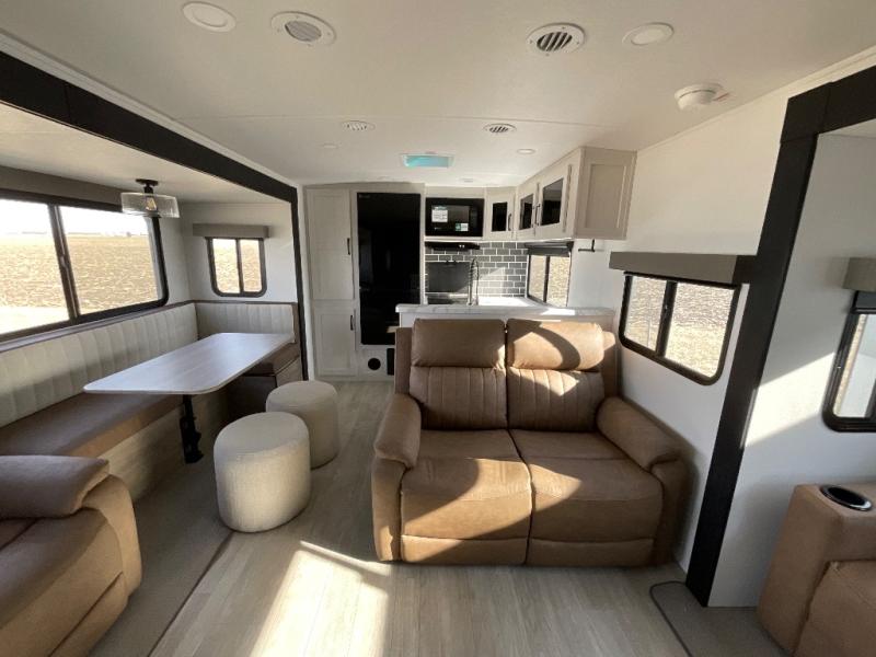 One look at this spacious travel trailer and you'll be sold! The rear kitchen features a U-shaped counter, an 11-cu. ft. refrigerator, plus a pantry for dry goods and snacks. There is a 1/2 dinette with bench seating, plus a tri-fold sofa and two theater seats. Everyone can take turns cleaning up in the full bath that includes a shower with a seat, then head outdoors to relax under the patio awnings with LED lights. When it's time for bed, you will enjoy the king bed slide out in the front bedroom. You'll also find a dresser and a closet here, plus a wardrobe with washer and dryer prep if you choose to add those appliances!