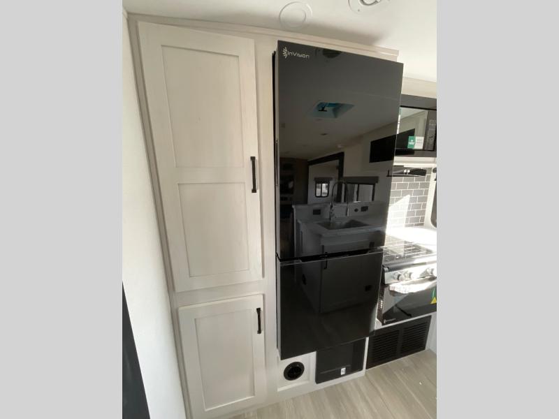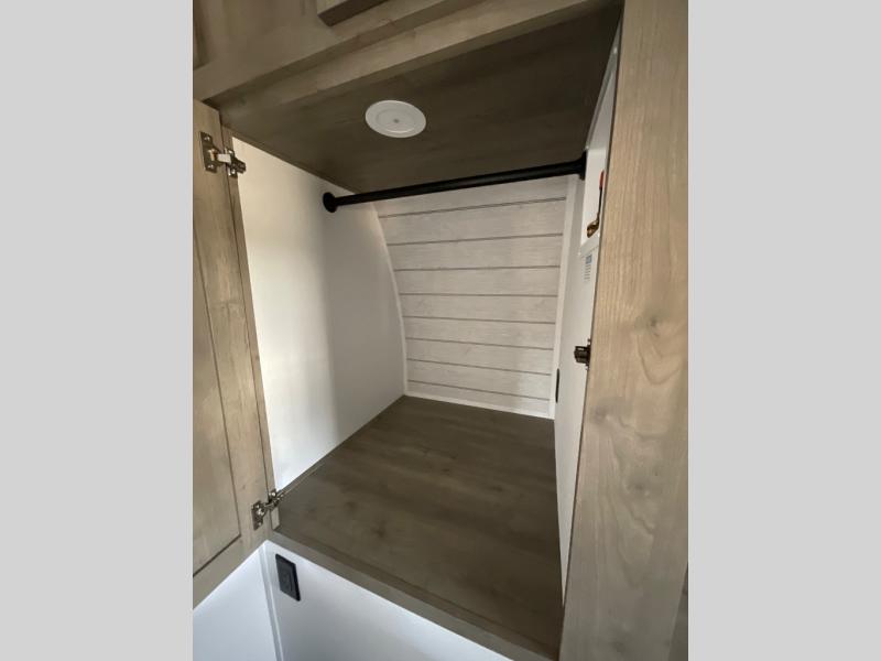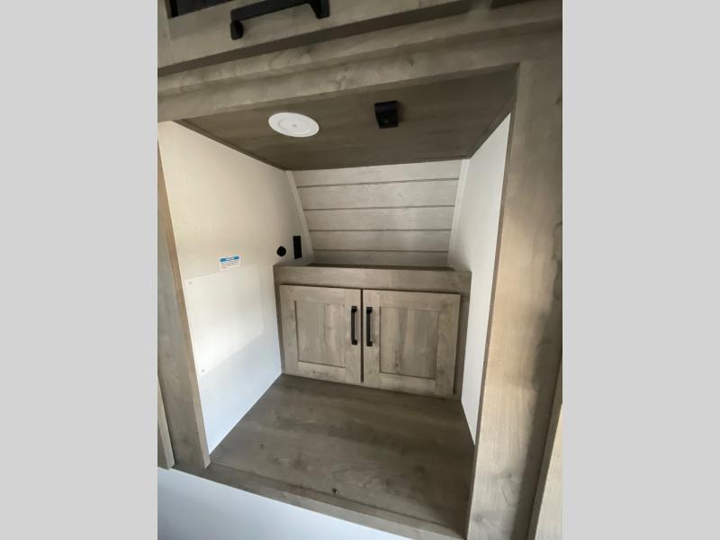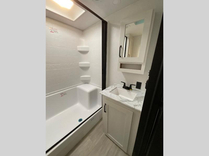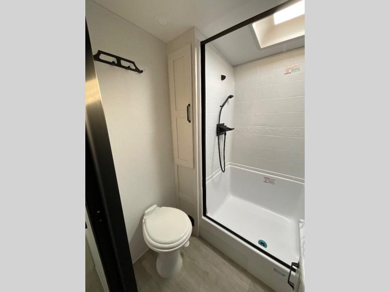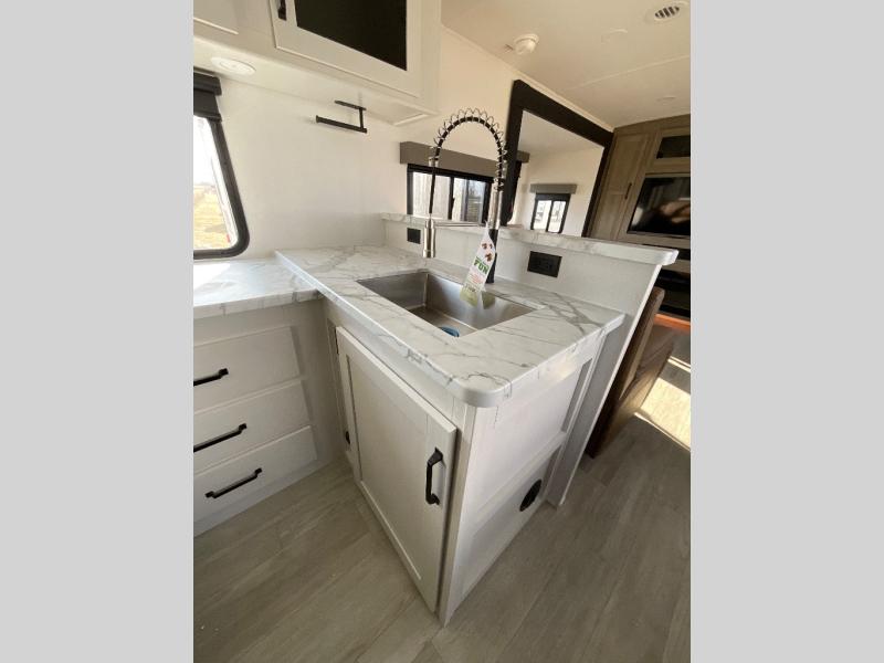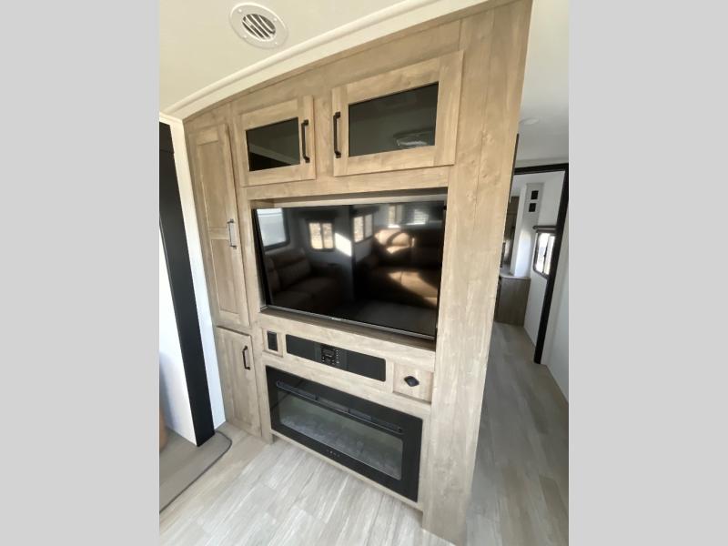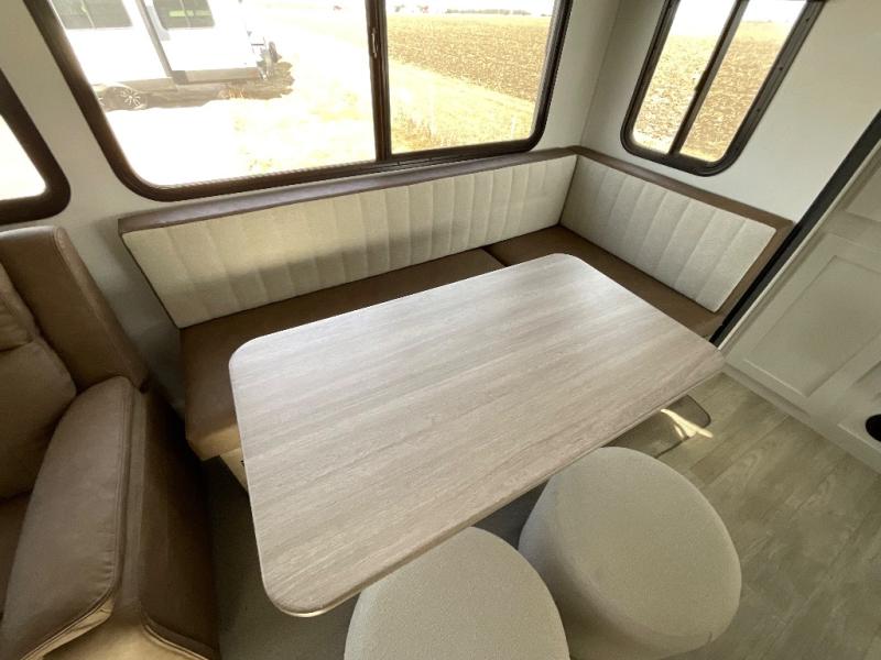 One look at this spacious travel trailer and you'll be sold! The rear kitchen features a U-shaped counter, an 11-cu. ft. refrigerator, plus a pantry for dry goods and snacks. There is a 1/2 dinette with bench seating, plus a tri-fold sofa and two theater seats. Everyone can take turns cleaning up in the full bath that includes a shower with a seat, then head outdoors to relax under the patio awnings with LED lights. When it's time for bed, you will enjoy the king bed slide out in the front bedroom. You'll also find a dresser and a closet here, plus a wardrobe with washer and dryer prep if you choose to add those appliances!