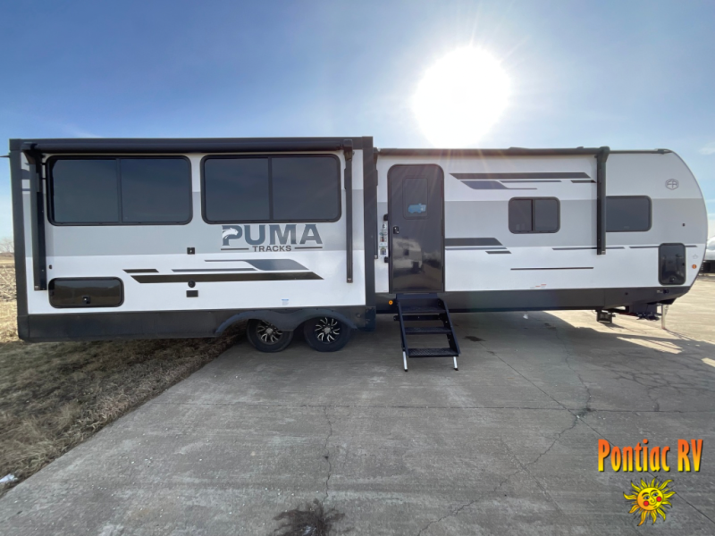Each Puma Tracks travel trailer by Forest River is constructed with a fully enclosed/heated underbelly for added protection against the elements, plus a fully laminated roof and rear wall for durability. The slam latch baggage doors with magnets will make it easier than ever to pack up your camp gear, and the power awning with LED lights will provide shade during the day and inviting ambiance at night. Head inside to enjoy the roller shades, smoked glass kitchen cabinet doors, stainless-steel sink, and LED lights to keep your space well lit. Some of the available options include a bedroom A/C, a Wi-Fi booster, heated holding tanks, and more!