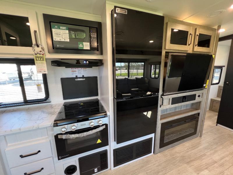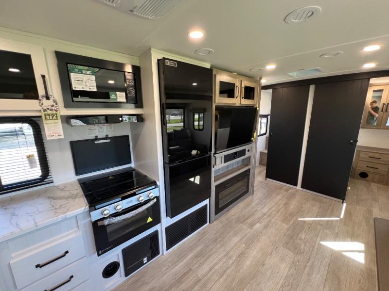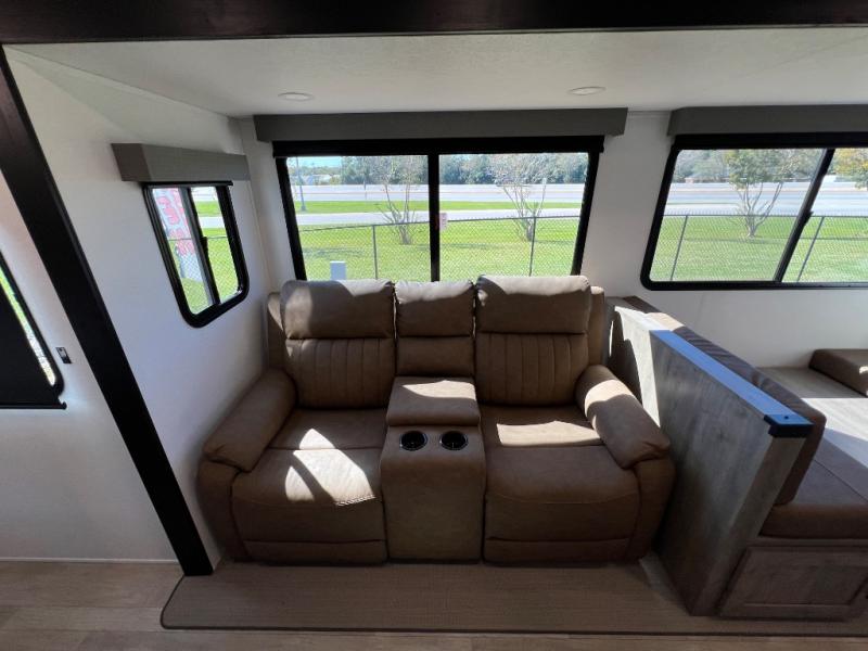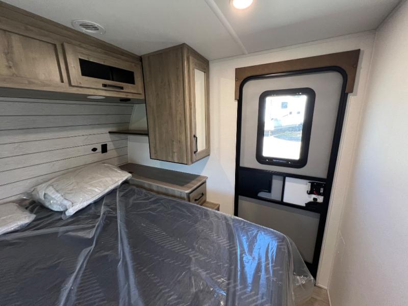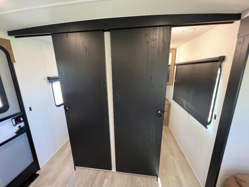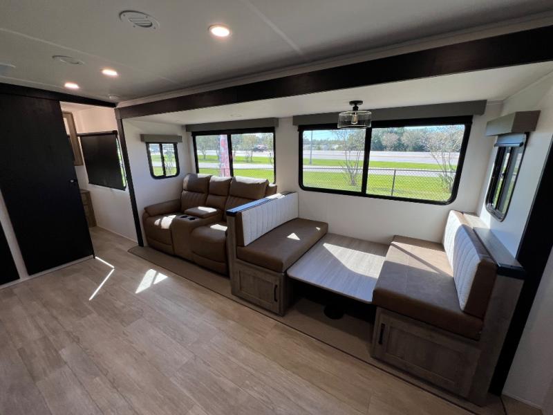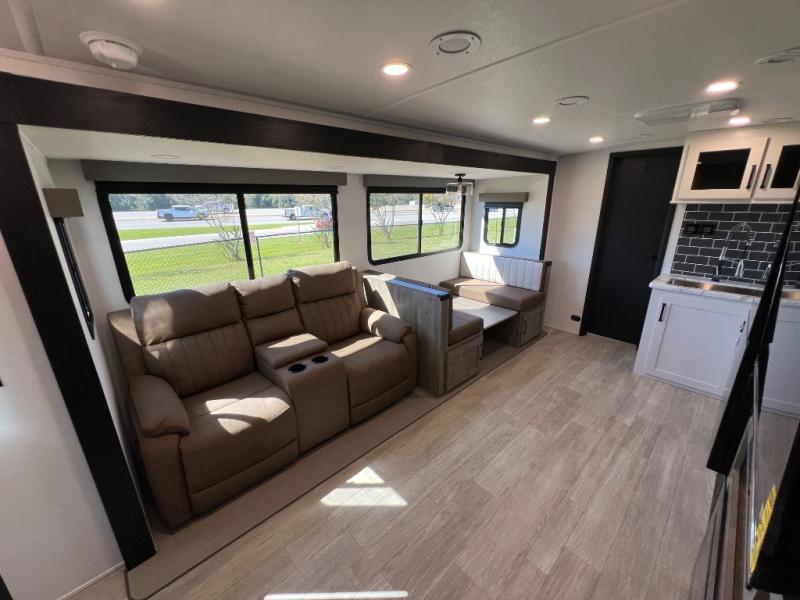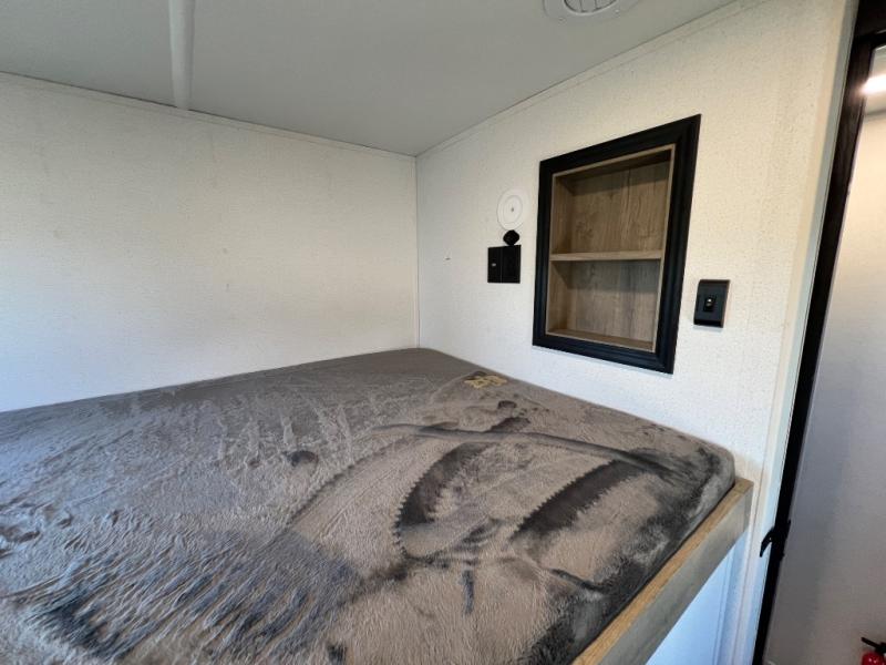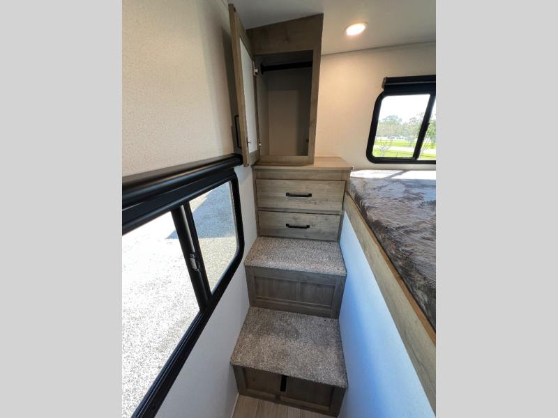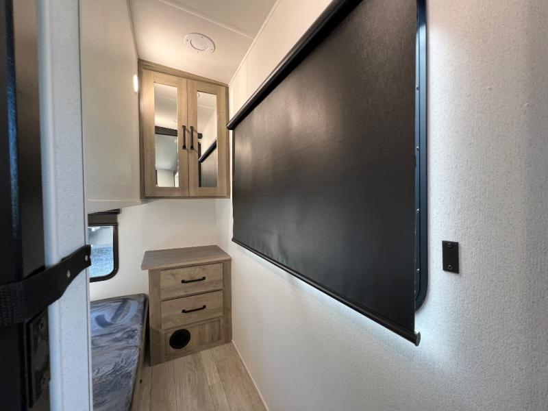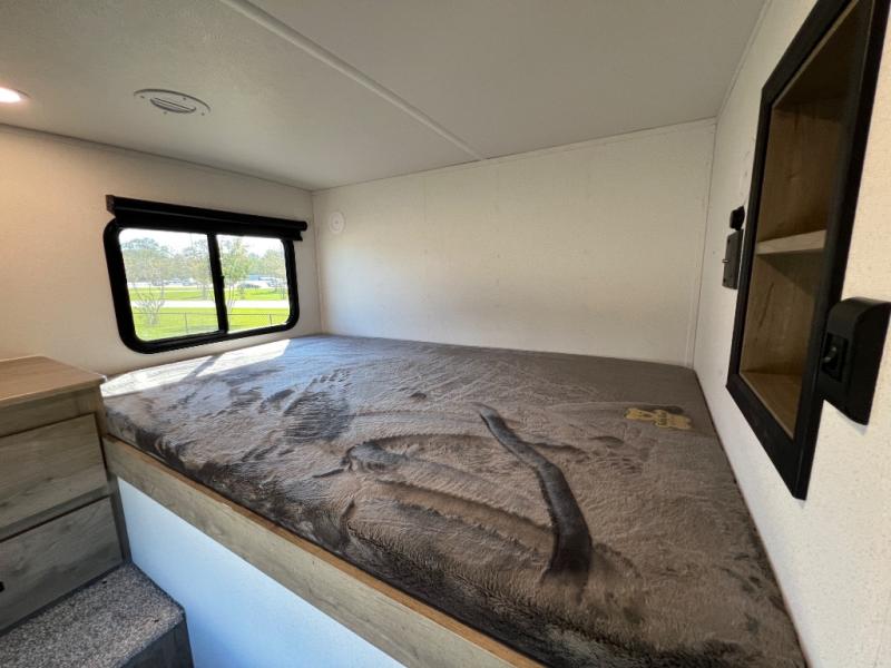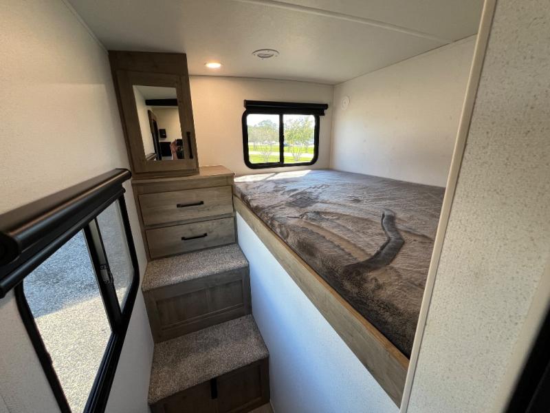 Whether you are looking for a bunkhouse, a private bedroom, or dual entry doors in your next RV, this one might just be the perfect fit with all those features! There are 45" x 72" bunk beds, each with their own wardrobe and their own private entry door, making it perfect for camping with older kids. The galley kitchen offers amenities such as a microwave, cooktop, an 11 cu. ft. refrigerator, and an L-shaped counter for preparing and serving meals. You will also find more storage, an entertainment center and a slide out sofa sleeper and booth dinette that offer more sleeping space when needed.