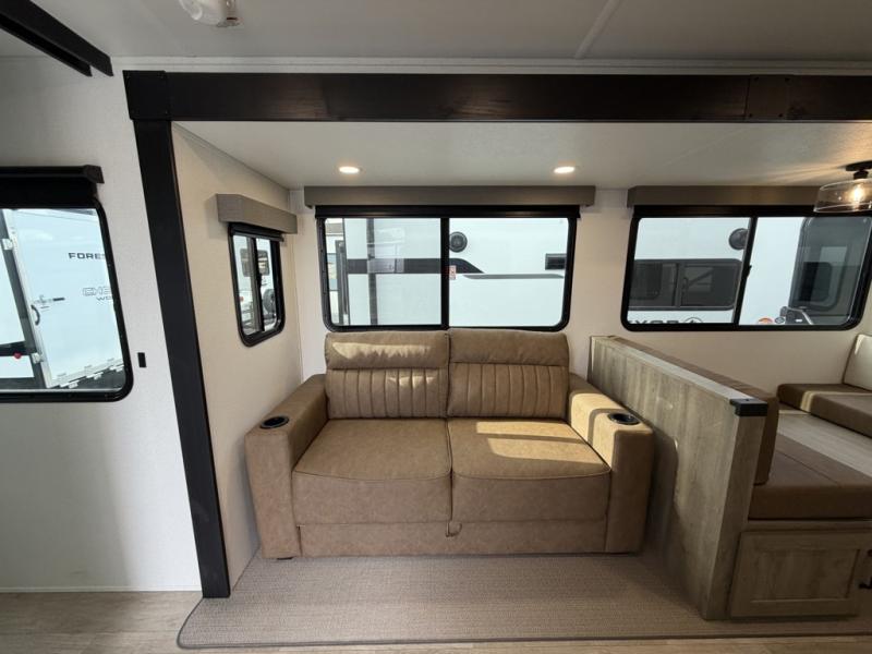 Each Puma Tracks travel trailer by Forest River is constructed with a fully enclosed/heated underbelly for added protection against the elements, plus a fully laminated roof and rear wall for durability. The slam latch baggage doors with magnets will make it easier than ever to pack up your camp gear, and the power awning with LED lights will provide shade during the day and inviting ambiance at night. Head inside to enjoy the roller shades, smoked glass kitchen cabinet doors, stainless-steel sink, and LED lights to keep your space well lit. Some of the available options include a bedroom A/C, a Wi-Fi booster, heated holding tanks, and more!