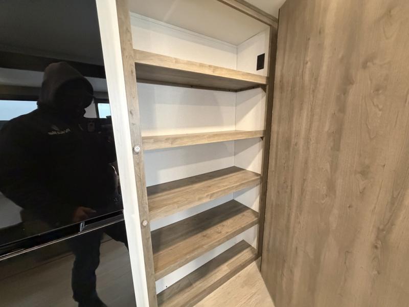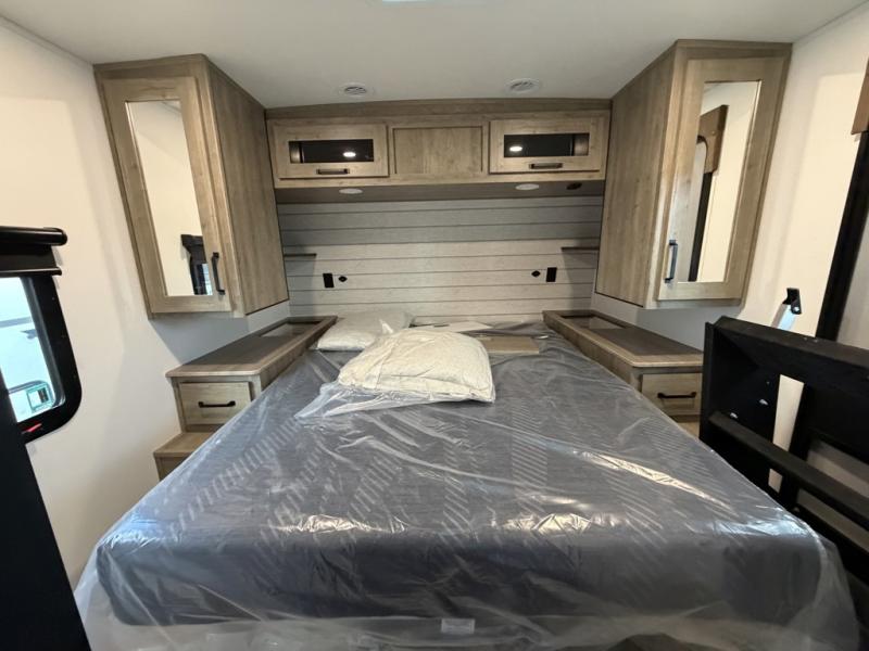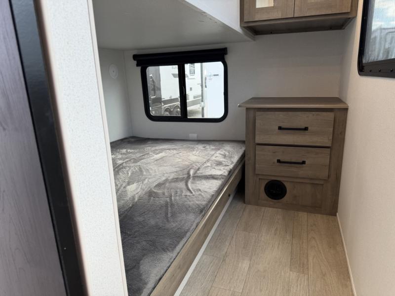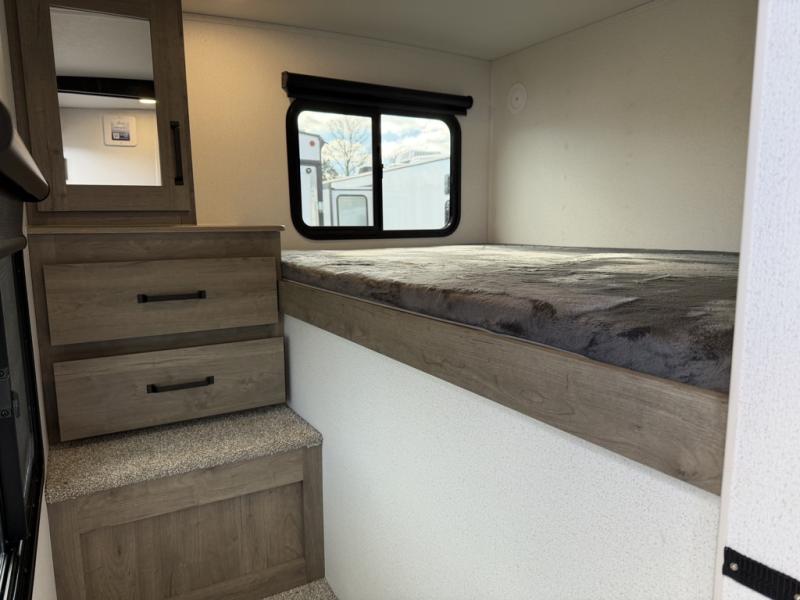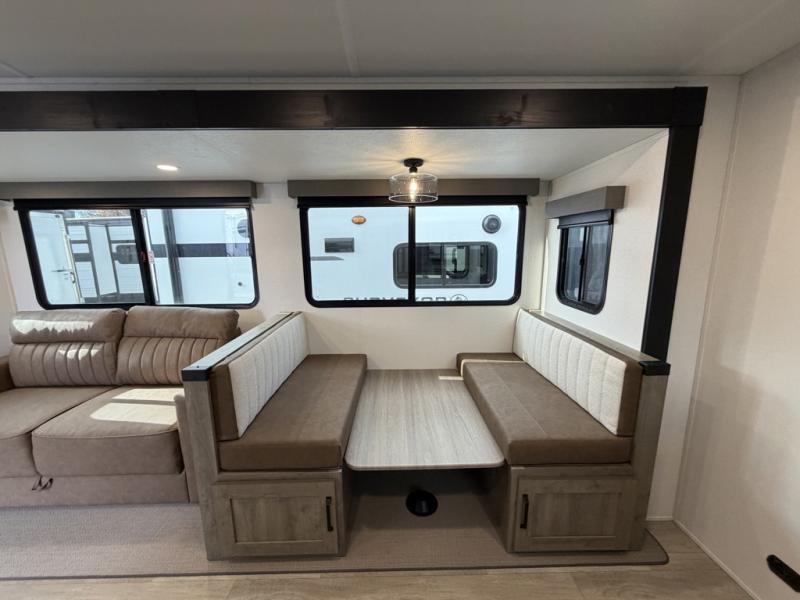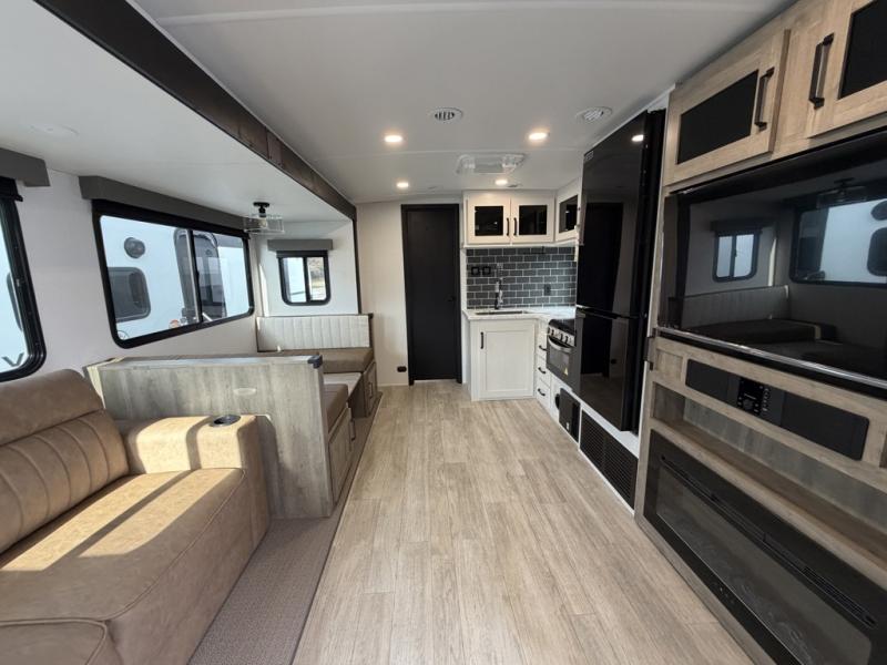 Whether you are looking for a bunkhouse, a private bedroom, or dual entry doors in your next RV, this one might just be the perfect fit with all those features! There are 45" x 72" bunk beds, each with their own wardrobe and their own private entry door, making it perfect for camping with older kids. The galley kitchen offers amenities such as a microwave, cooktop, an 11 cu. ft. refrigerator, and an L-shaped counter for preparing and serving meals. You will also find more storage, an entertainment center and a slide out sofa sleeper and booth dinette that offer more sleeping space when needed.