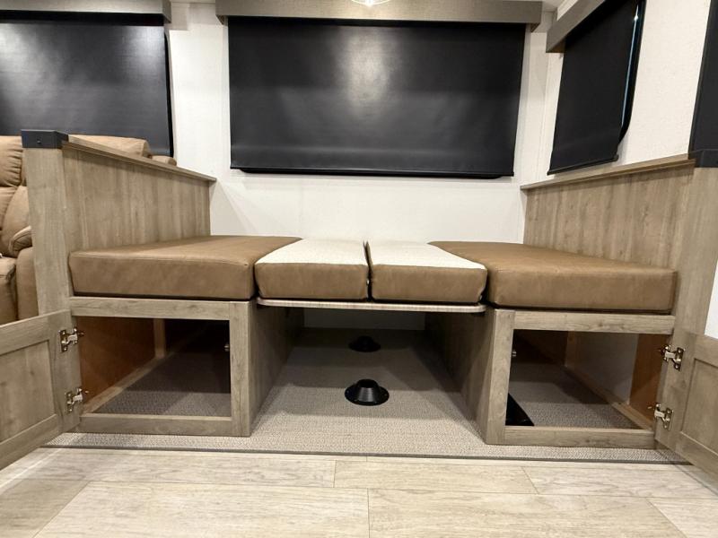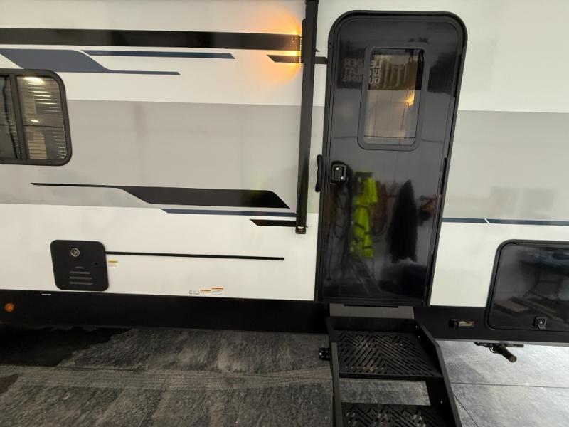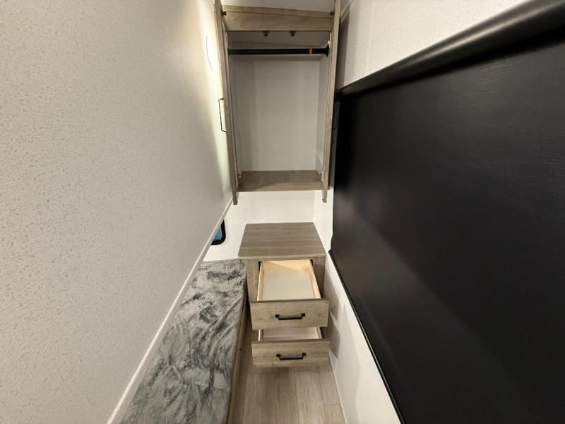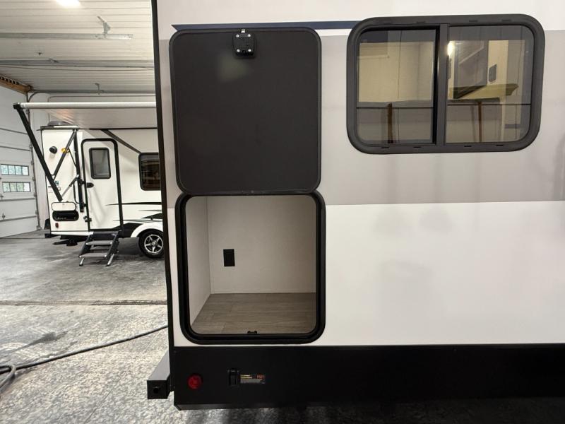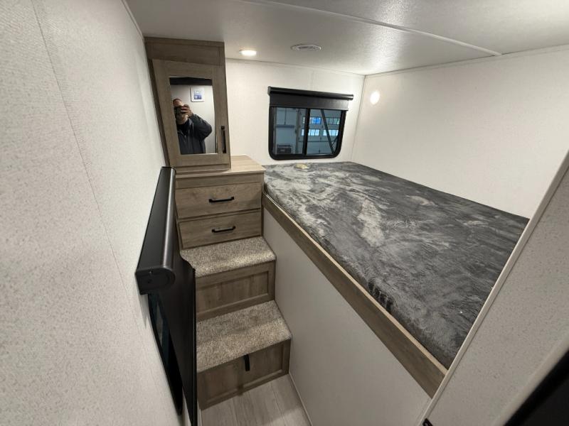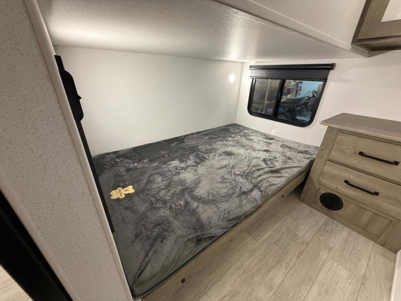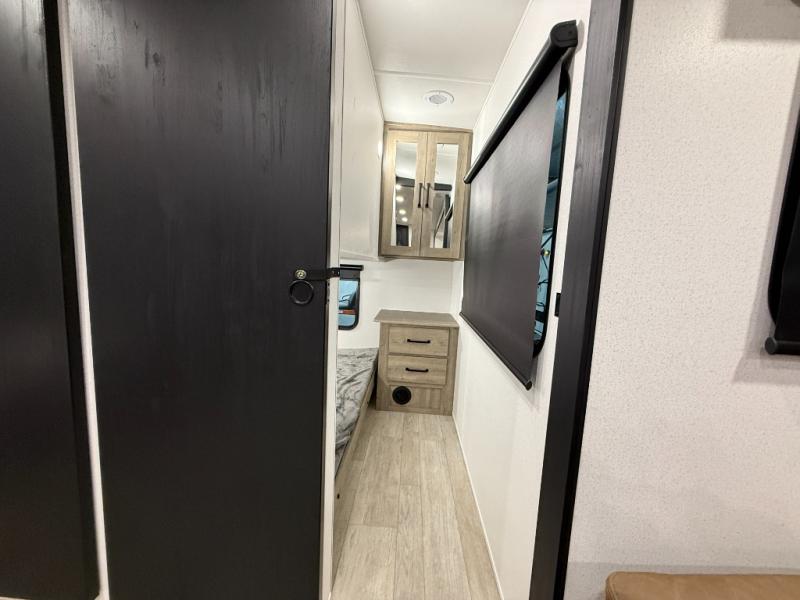 Whether you are looking for a bunkhouse, a private bedroom, or dual entry doors in your next RV, this one might just be the perfect fit with all those features! There are 45" x 72" bunk beds, each with their own wardrobe and their own private entry door, making it perfect for camping with older kids. The galley kitchen offers amenities such as a microwave, cooktop, an 11 cu. ft. refrigerator, and an L-shaped counter for preparing and serving meals. You will also find more storage, an entertainment center and a slide out sofa sleeper and booth dinette that offer more sleeping space when needed.