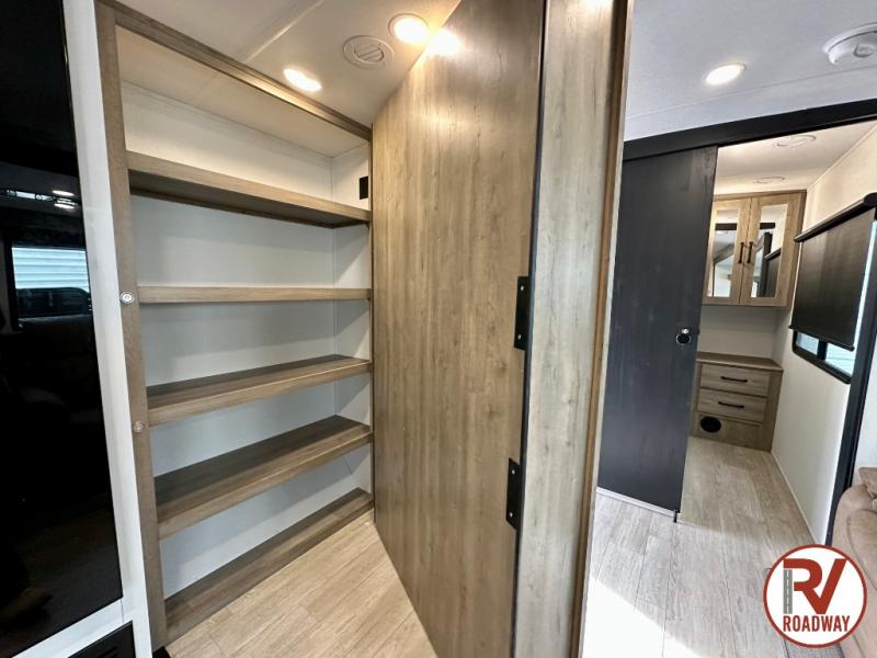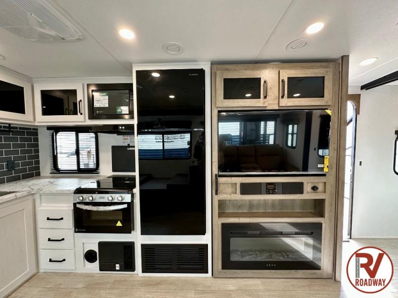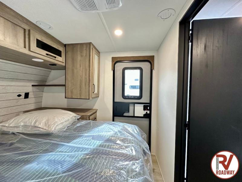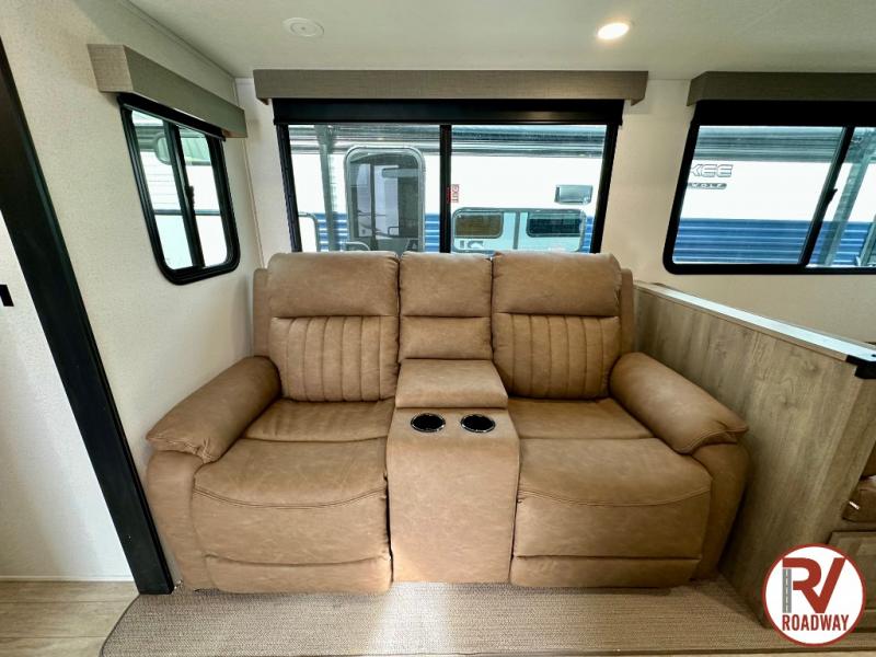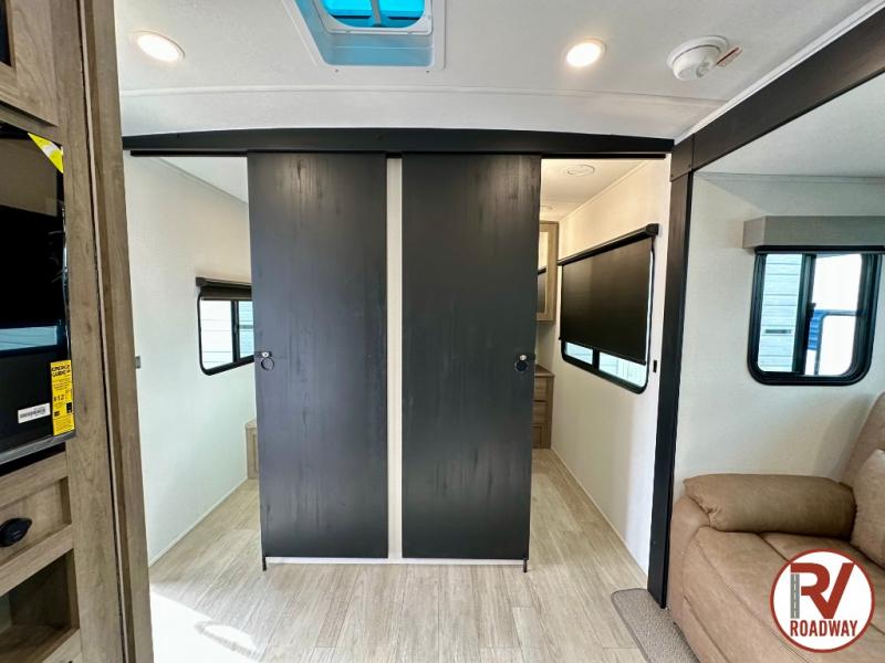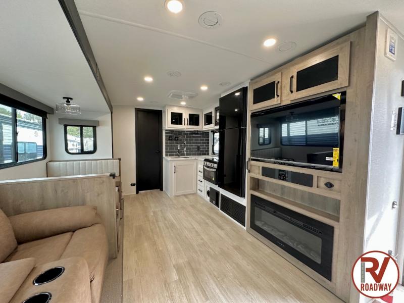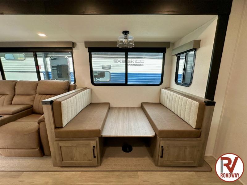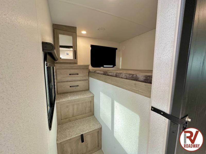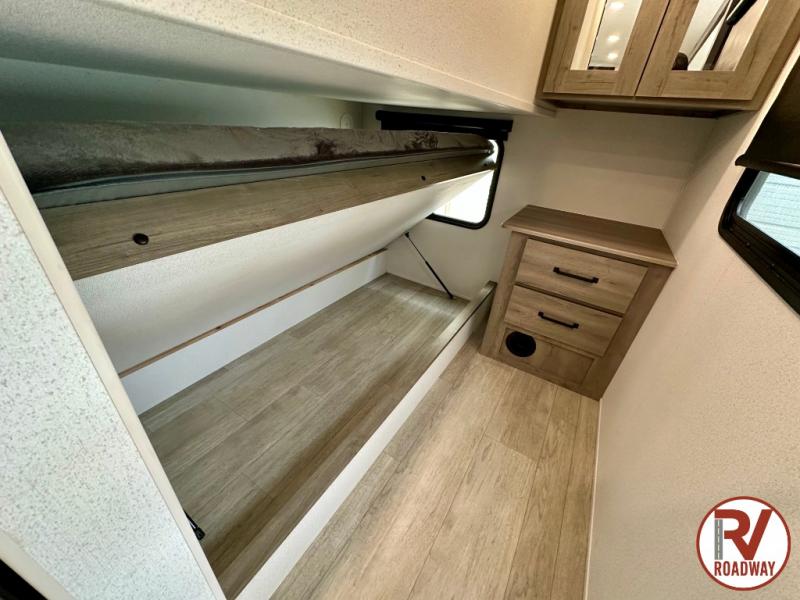 Whether you are looking for a bunkhouse, a private bedroom, or dual entry doors in your next RV, this one might just be the perfect fit with all those features! There are 45" x 72" bunk beds, each with their own wardrobe and their own private entry door, making it perfect for camping with older kids. The galley kitchen offers amenities such as a microwave, cooktop, an 11 cu. ft. refrigerator, and an L-shaped counter for preparing and serving meals. You will also find more storage, an entertainment center and a slide out sofa sleeper and booth dinette that offer more sleeping space when needed.
