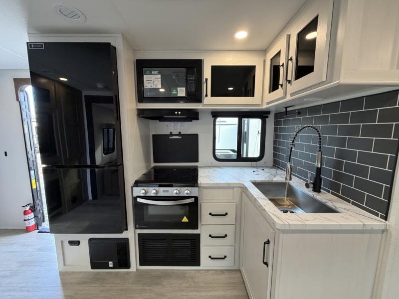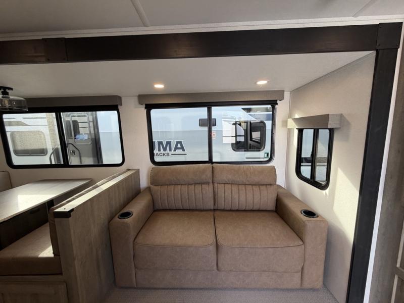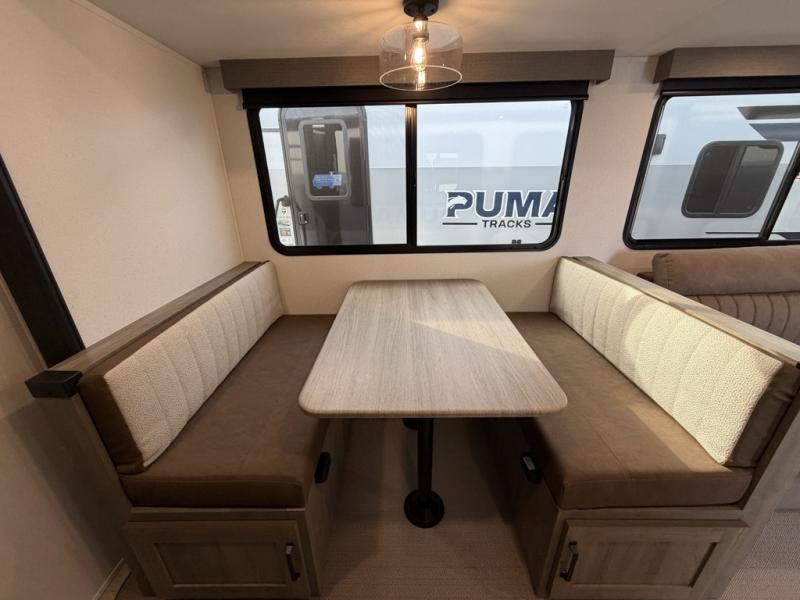Each Puma Tracks travel trailer by Forest River is constructed with a fully enclosed/heated underbelly for added protection against the elements, plus a fully laminated roof and rear wall for durability. The slam latch baggage doors with magnets will make it easier than ever to pack up your camp gear, and the power awning with LED lights will provide shade during the day and inviting ambiance at night. Head inside to enjoy the roller shades, smoked glass kitchen cabinet doors, stainless-steel sink, and LED lights to keep your space well lit. Some of the available options include a bedroom A/C, a Wi-Fi booster, heated holding tanks, and more!