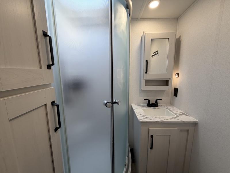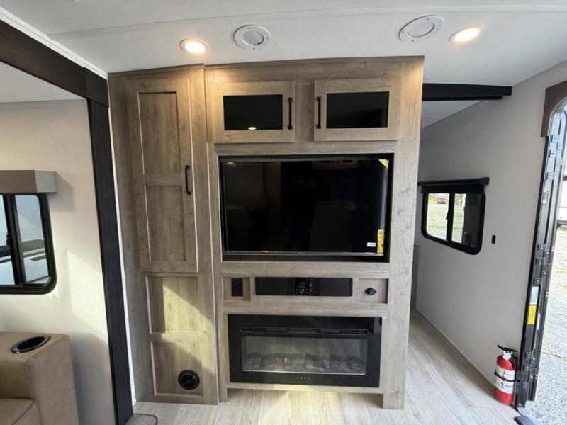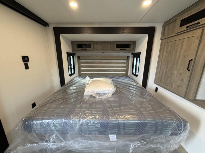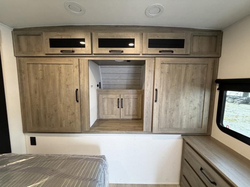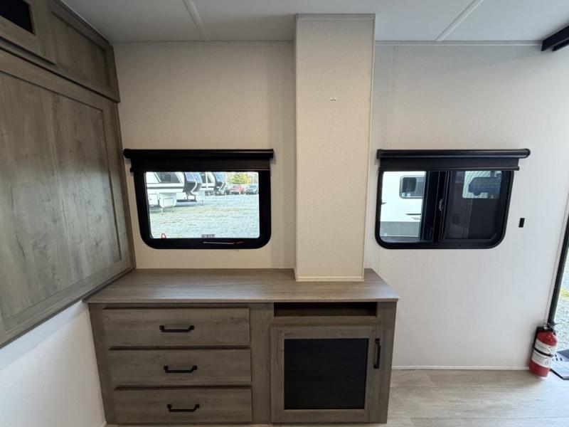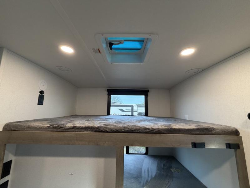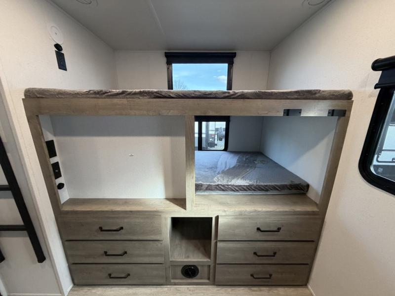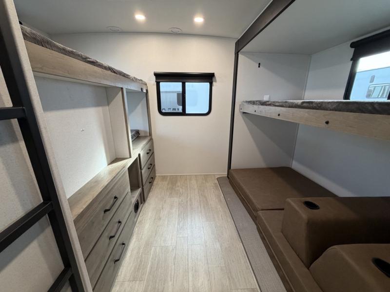 This travel trailer offers so many features that you will love, from a private bunkhouse for overnight guests to having three slide outs giving you a spacious interior throughout! The bunkhouse includes triple bunks, a double-size day bed, and storage space for your guests' things. The full bathroom is centrally located for all to access from the main living and kitchen area where you will find a slide out that includes a booth dinette and a sofa sleeper. The cook will love the kitchen amenities such as the microwave, cooktop, 11 cu. ft. refrigerator, and the L-shaped counter for preparing and serving meals. And don't overlook the front private bedroom with its king bed slide out, dresser, closet, plus a second bedroom closet with washer and dryer prep!