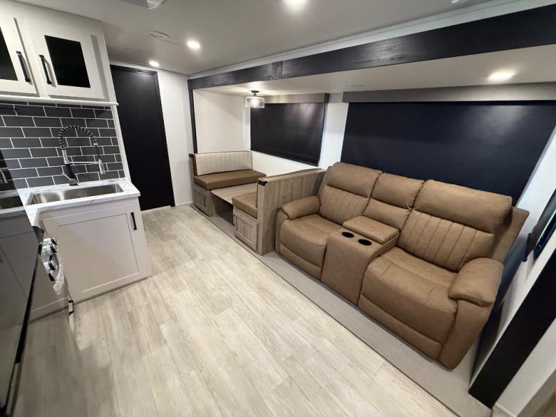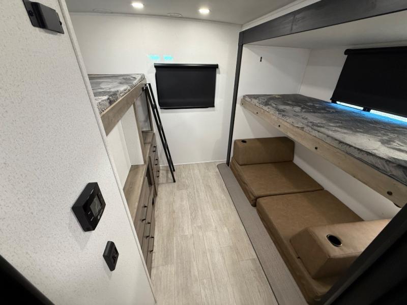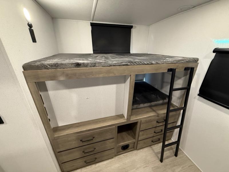 This travel trailer offers so many features that you will love, from a private bunkhouse for overnight guests to having three slide outs giving you a spacious interior throughout! The bunkhouse includes triple bunks, a double-size day bed, and storage space for your guests' things. The full bathroom is centrally located for all to access from the main living and kitchen area where you will find a slide out that includes a booth dinette and a sofa sleeper. The cook will love the kitchen amenities such as the microwave, cooktop, 11 cu. ft. refrigerator, and the L-shaped counter for preparing and serving meals. And don't overlook the front private bedroom with its king bed slide out, dresser, closet, plus a second bedroom closet with washer and dryer prep!