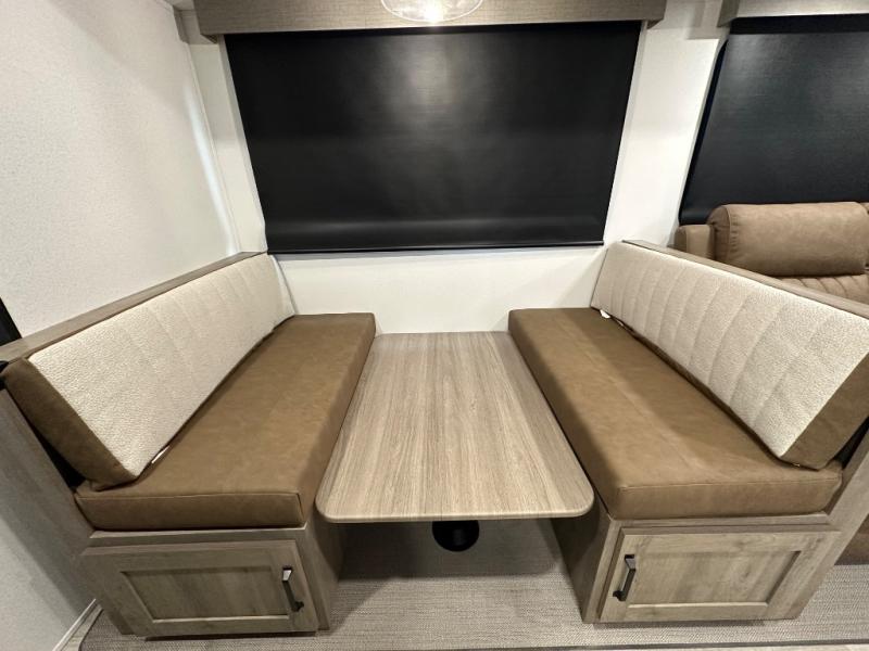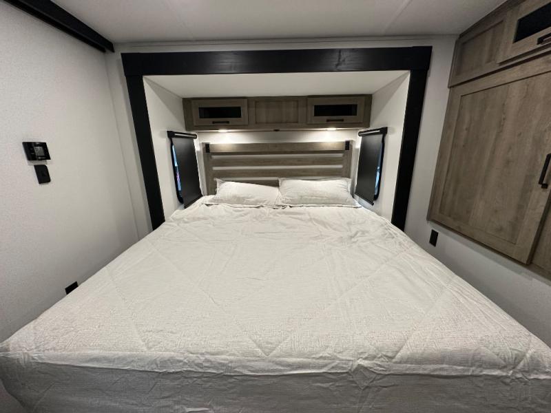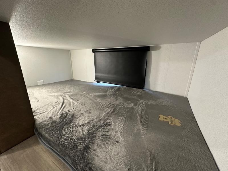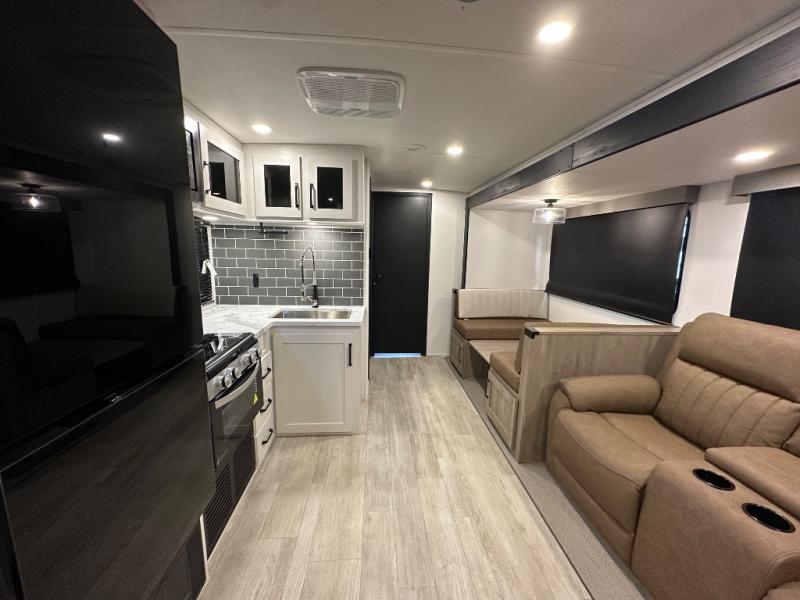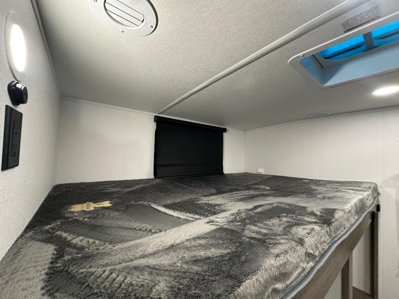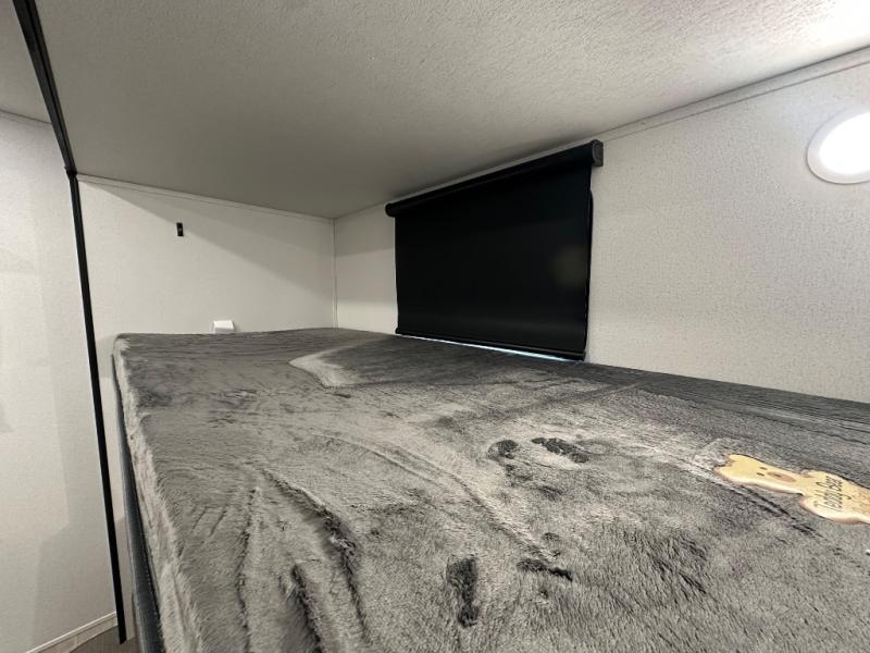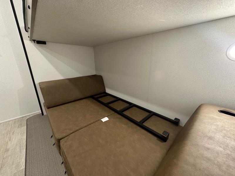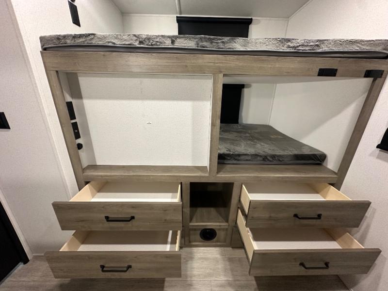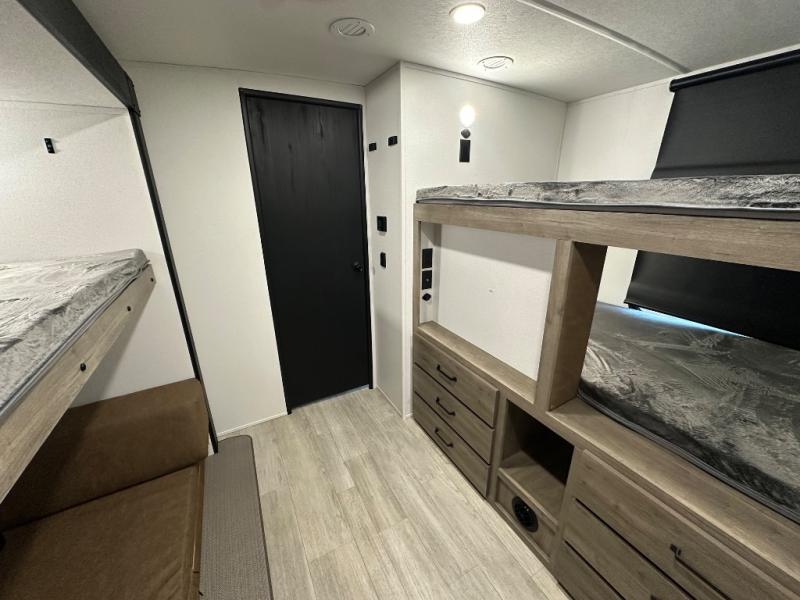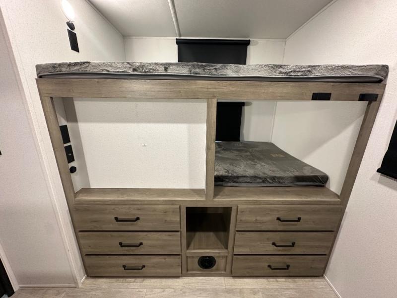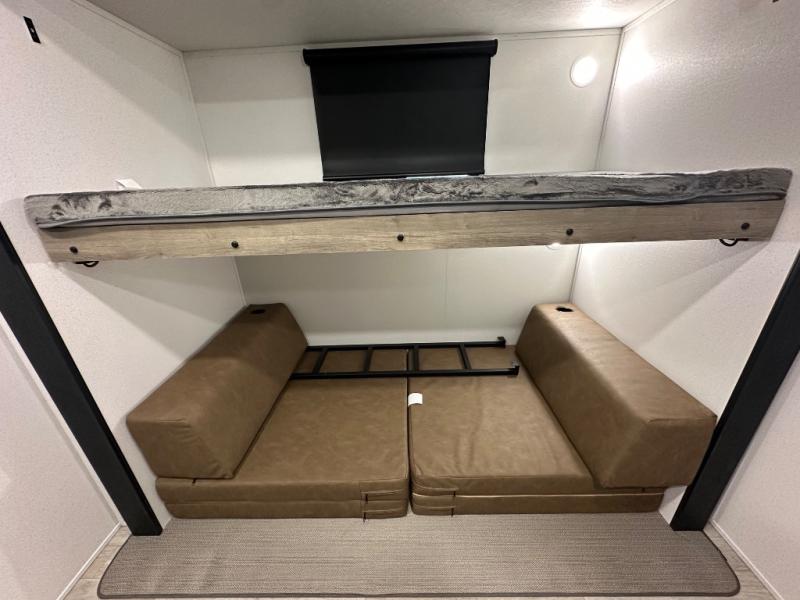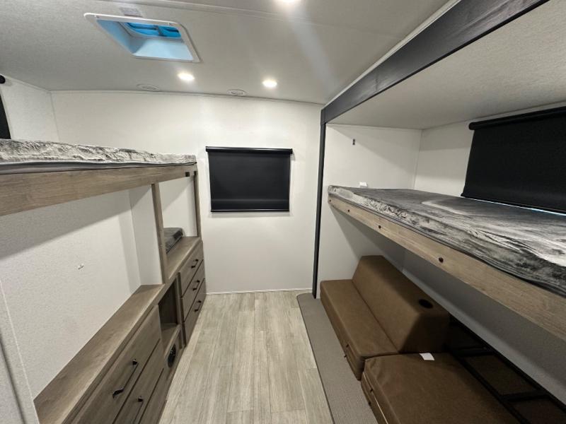 This travel trailer offers so many features that you will love, from a private bunkhouse for overnight guests to having three slide outs giving you a spacious interior throughout! The bunkhouse includes triple bunks, a double-size day bed, and storage space for your guests' things. The full bathroom is centrally located for all to access from the main living and kitchen area where you will find a slide out that includes a booth dinette and a sofa sleeper. The cook will love the kitchen amenities such as the microwave, cooktop, 11 cu. ft. refrigerator, and the L-shaped counter for preparing and serving meals. And don't overlook the front private bedroom with its king bed slide out, dresser, closet, plus a second bedroom closet with washer and dryer prep!