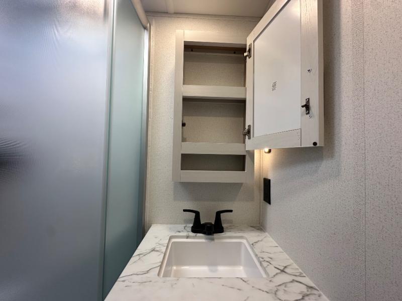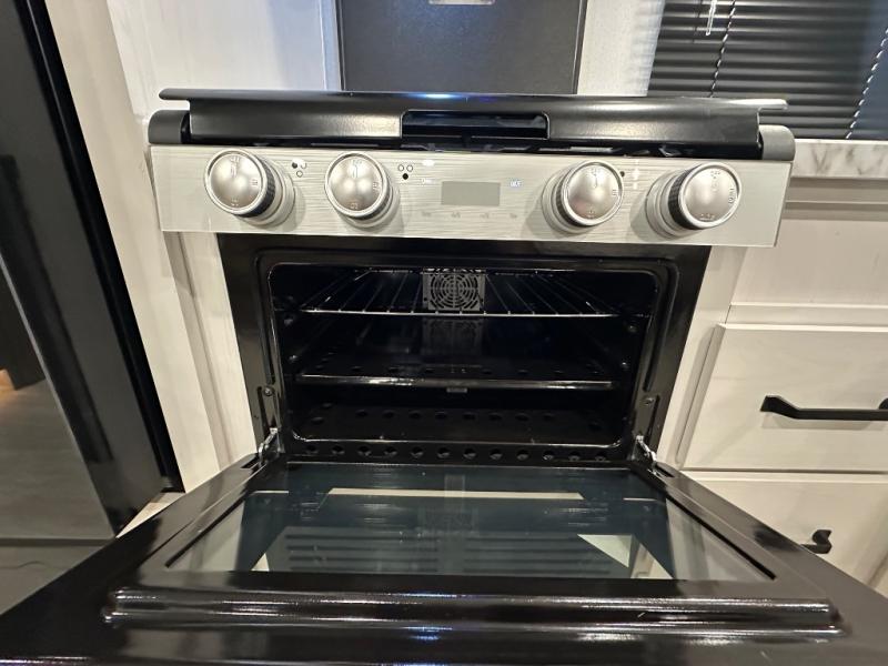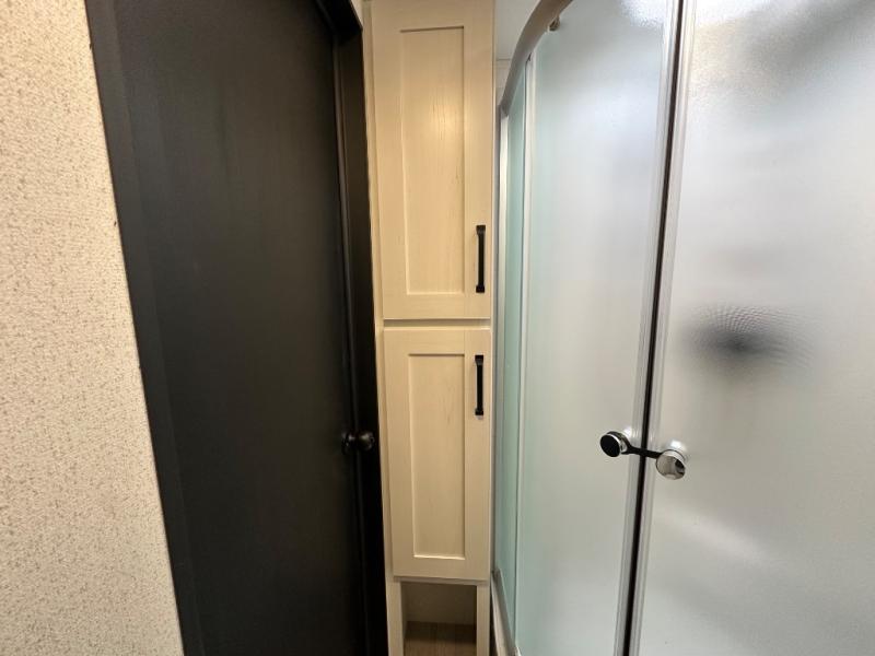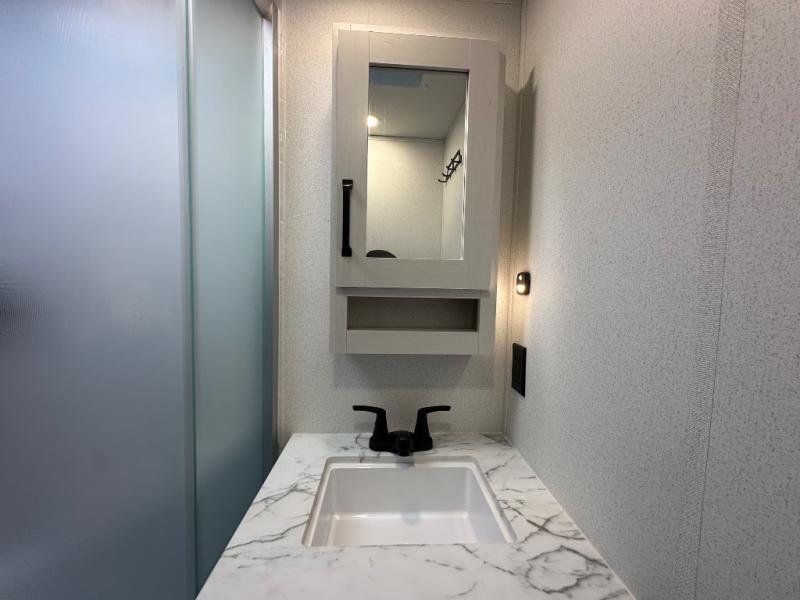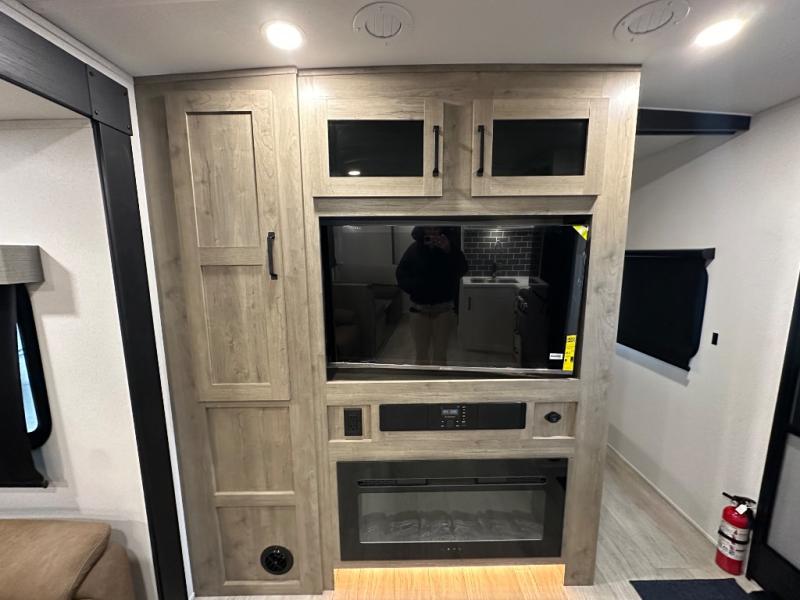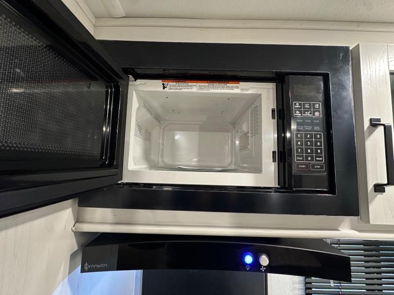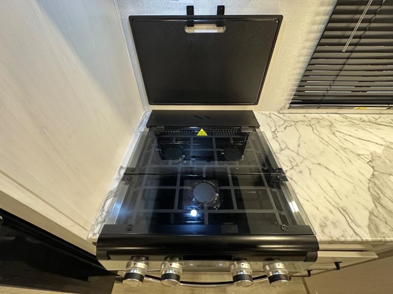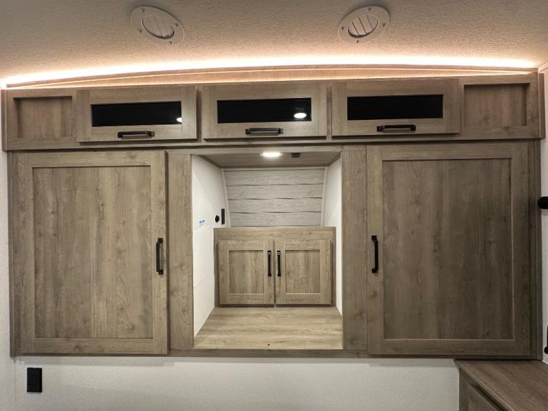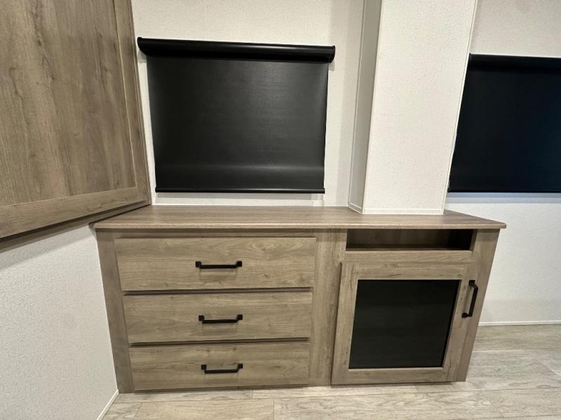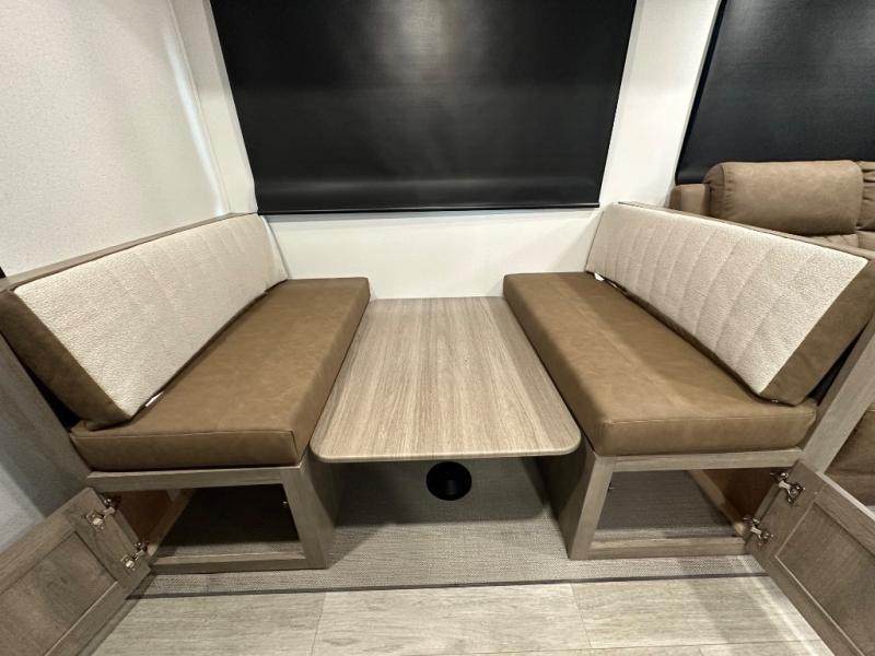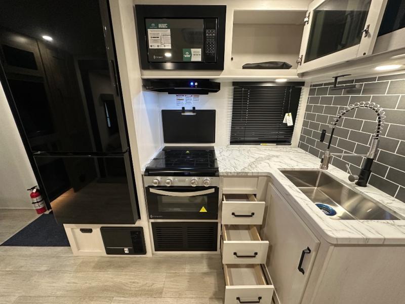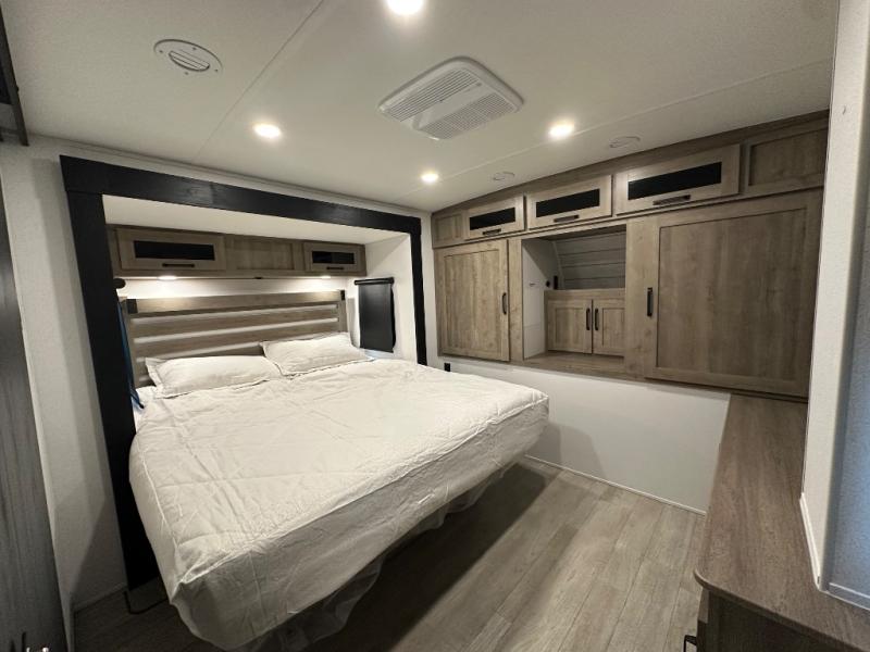 This travel trailer offers so many features that you will love, from a private bunkhouse for overnight guests to having three slide outs giving you a spacious interior throughout! The bunkhouse includes triple bunks, a double-size day bed, and storage space for your guests' things. The full bathroom is centrally located for all to access from the main living and kitchen area where you will find a slide out that includes a booth dinette and a sofa sleeper. The cook will love the kitchen amenities such as the microwave, cooktop, 11 cu. ft. refrigerator, and the L-shaped counter for preparing and serving meals. And don't overlook the front private bedroom with its king bed slide out, dresser, closet, plus a second bedroom closet with washer and dryer prep!