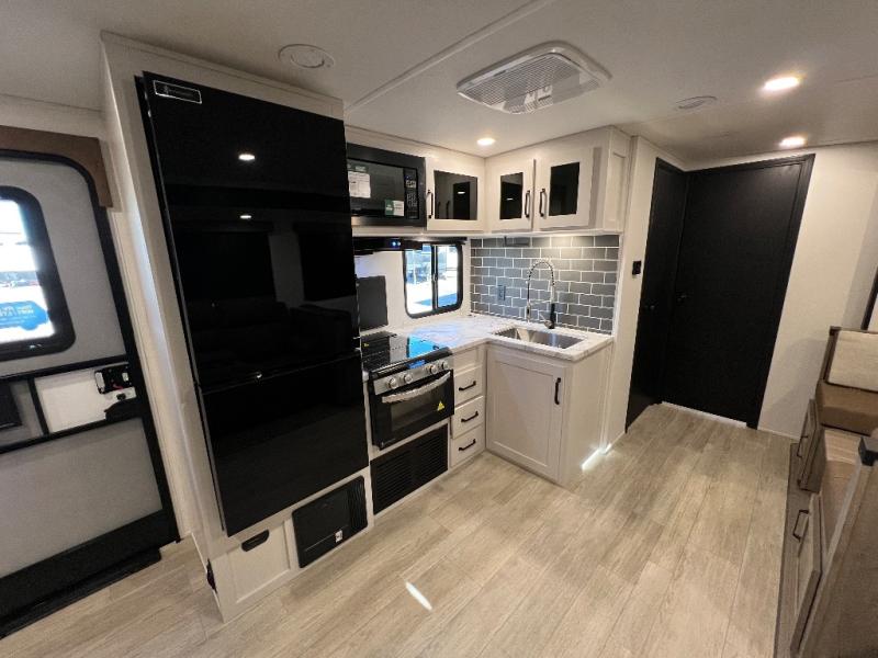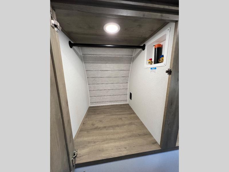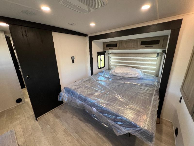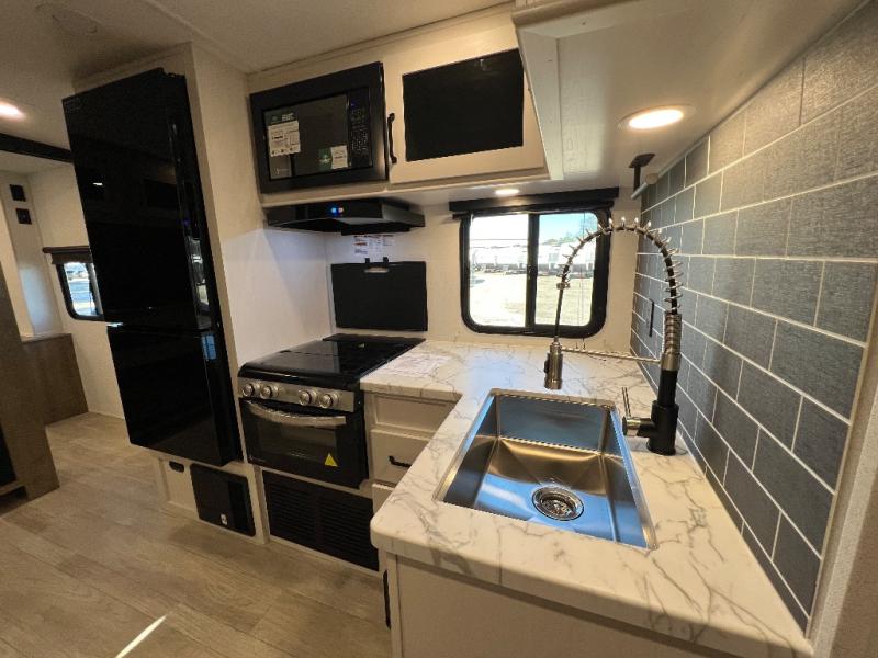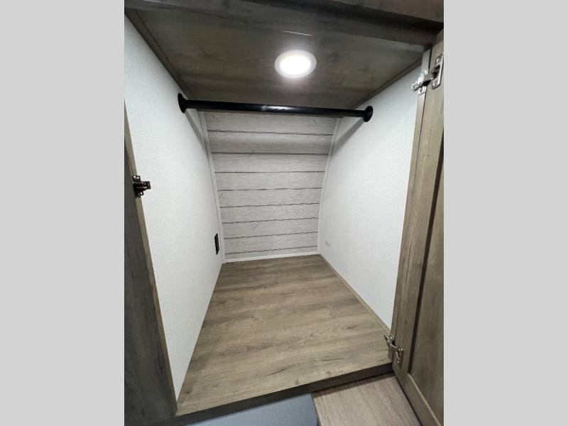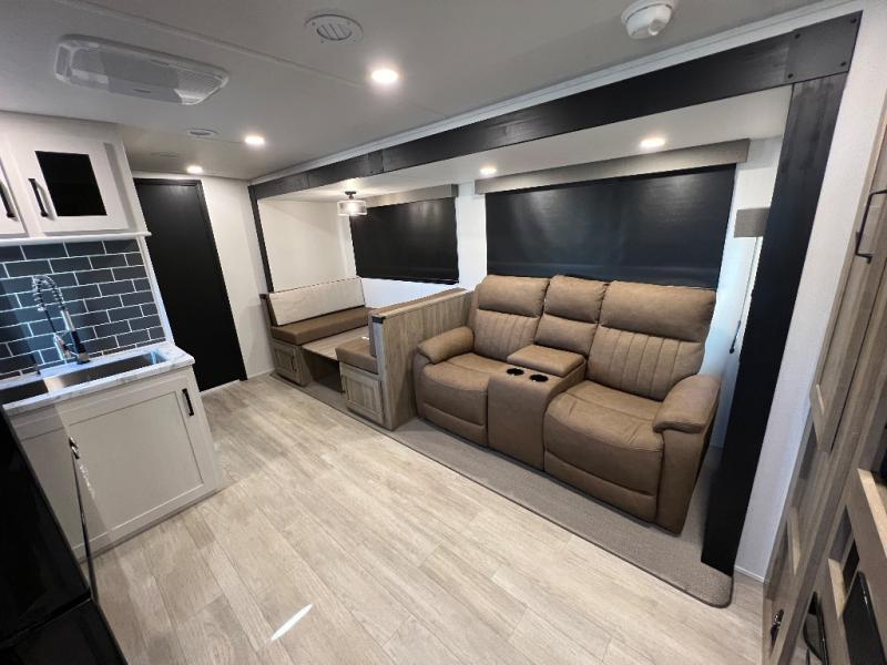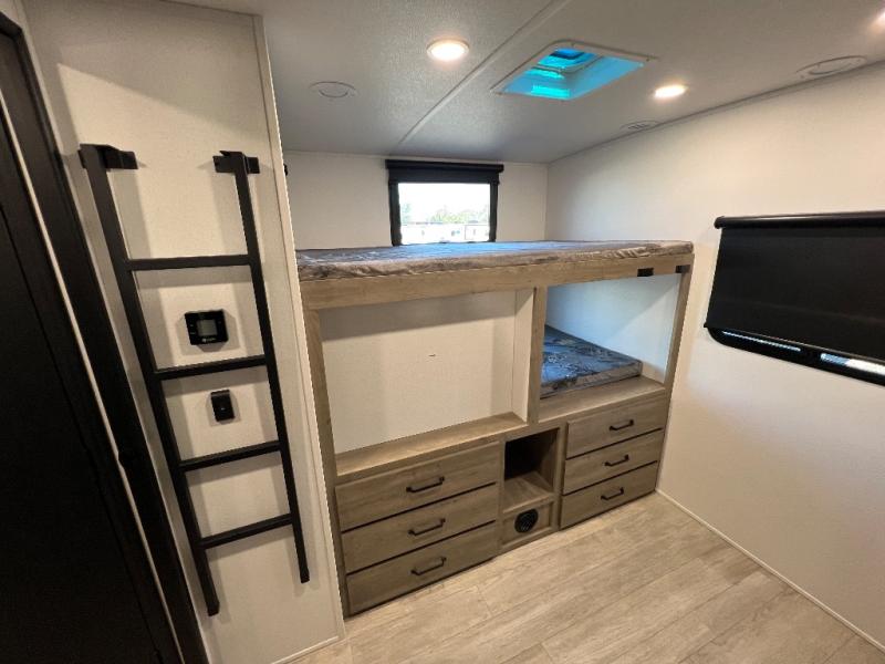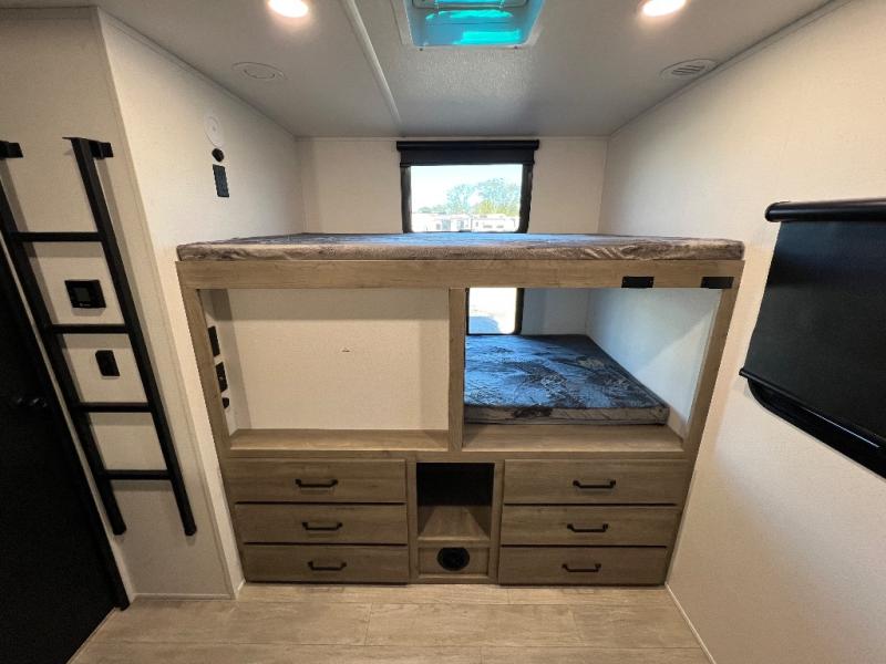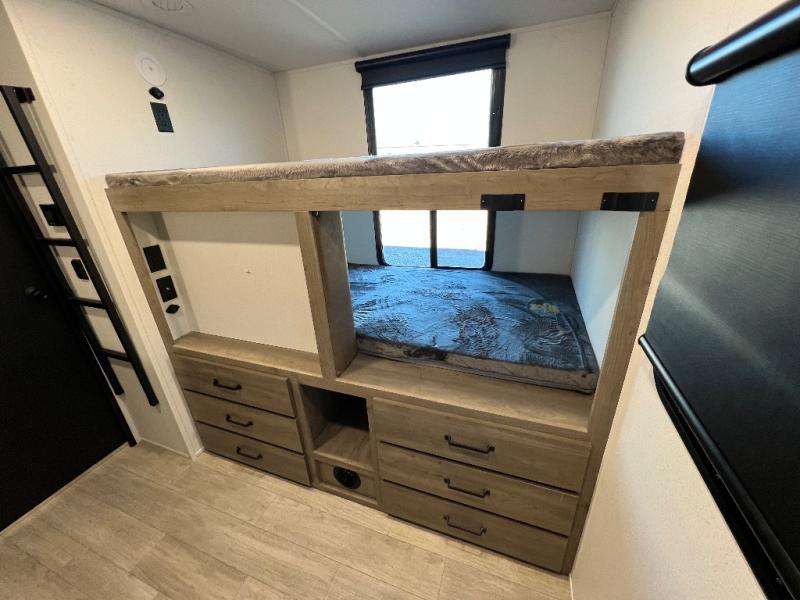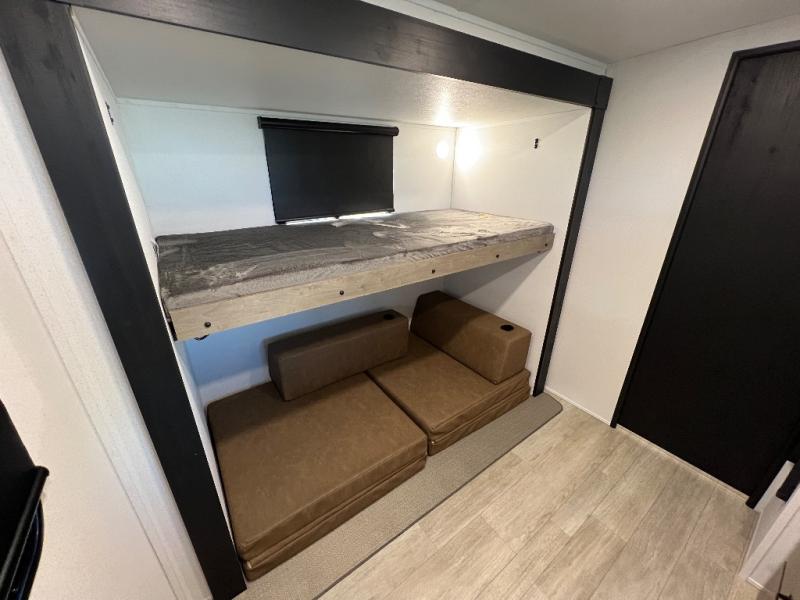 This travel trailer offers so many features that you will love, from a private bunkhouse for overnight guests to having three slide outs giving you a spacious interior throughout! The bunkhouse includes triple bunks, a double-size day bed, and storage space for your guests' things. The full bathroom is centrally located for all to access from the main living and kitchen area where you will find a slide out that includes a booth dinette and a sofa sleeper. The cook will love the kitchen amenities such as the microwave, cooktop, 11 cu. ft. refrigerator, and the L-shaped counter for preparing and serving meals. And don't overlook the front private bedroom with its king bed slide out, dresser, closet, plus a second bedroom closet with washer and dryer prep!