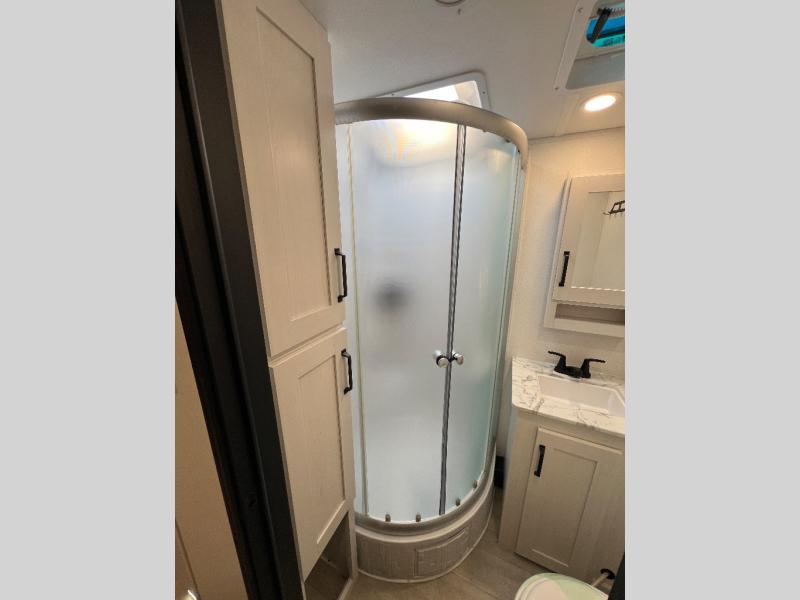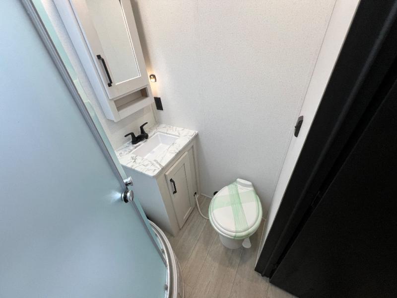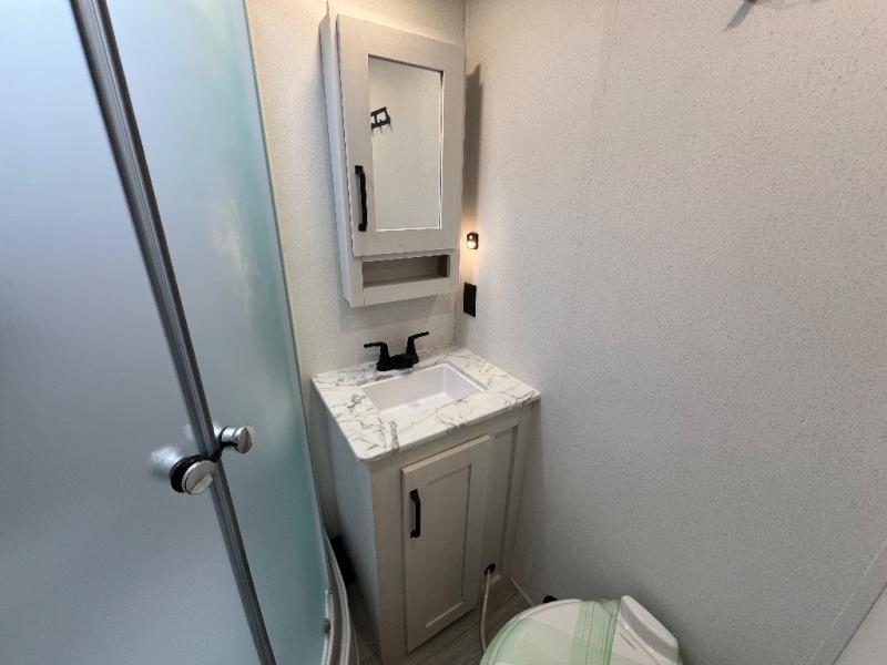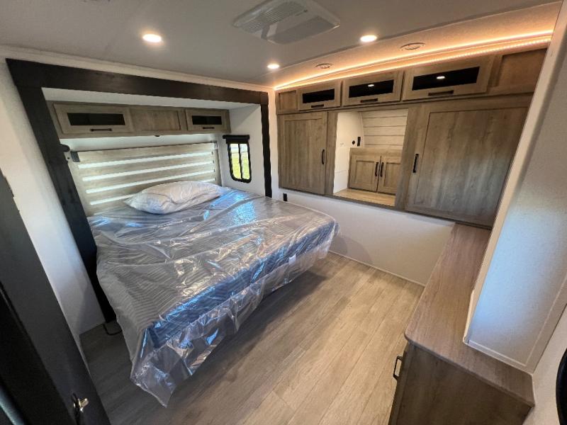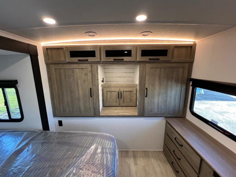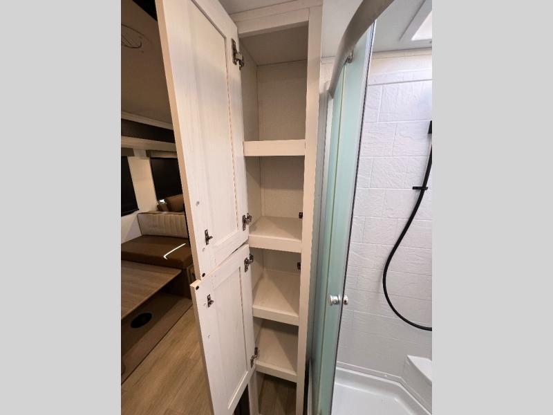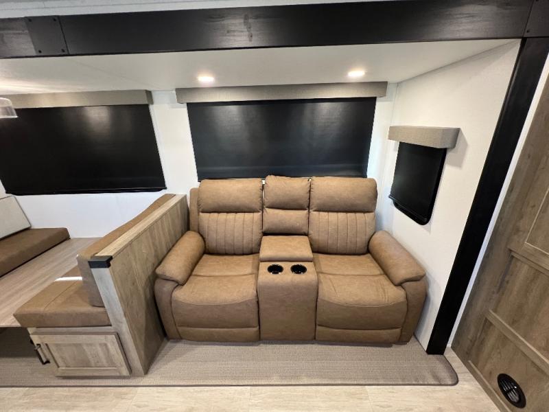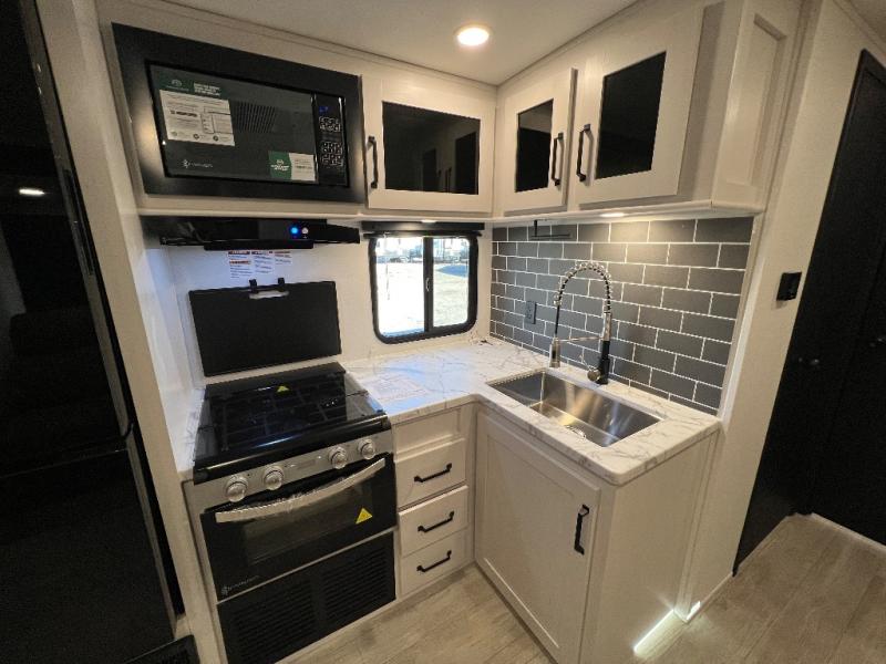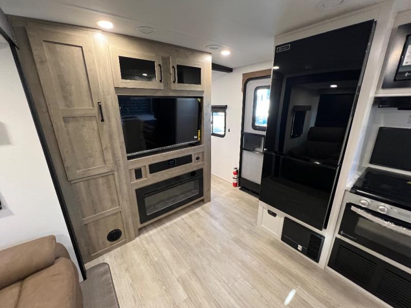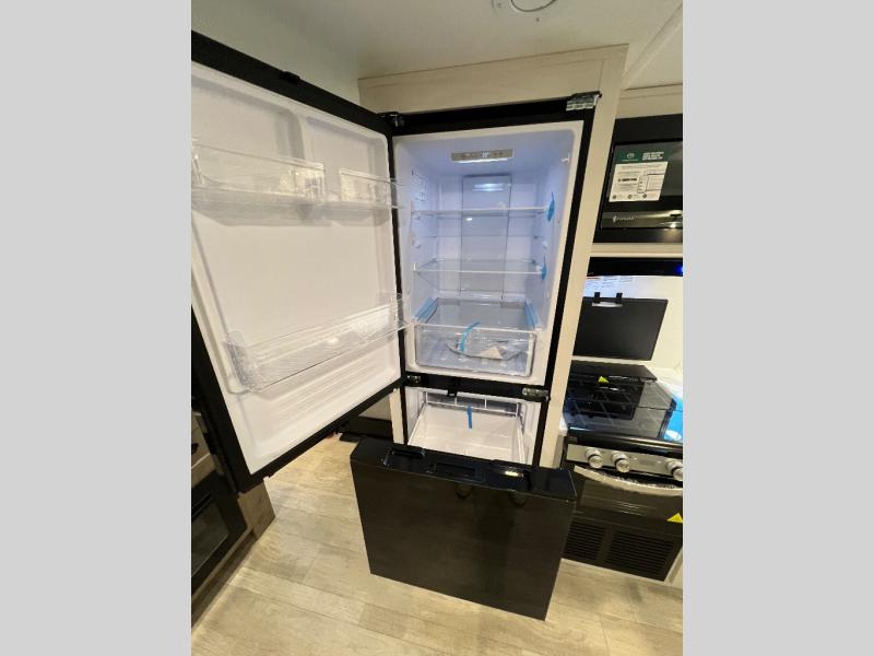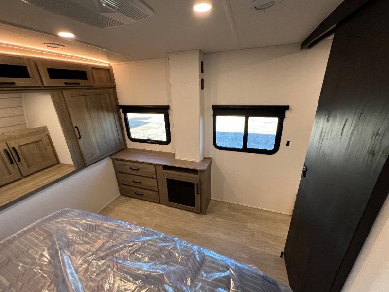This travel trailer offers so many features that you will love, from a private bunkhouse for overnight guests to having three slide outs giving you a spacious interior throughout! The bunkhouse includes triple bunks, a double-size day bed, and storage space for your guests' things. The full bathroom is centrally located for all to access from the main living and kitchen area where you will find a slide out that includes a booth dinette and a sofa sleeper. The cook will love the kitchen amenities such as the microwave, cooktop, 11 cu. ft. refrigerator, and the L-shaped counter for preparing and serving meals. And don't overlook the front private bedroom with its king bed slide out, dresser, closet, plus a second bedroom closet with washer and dryer prep!