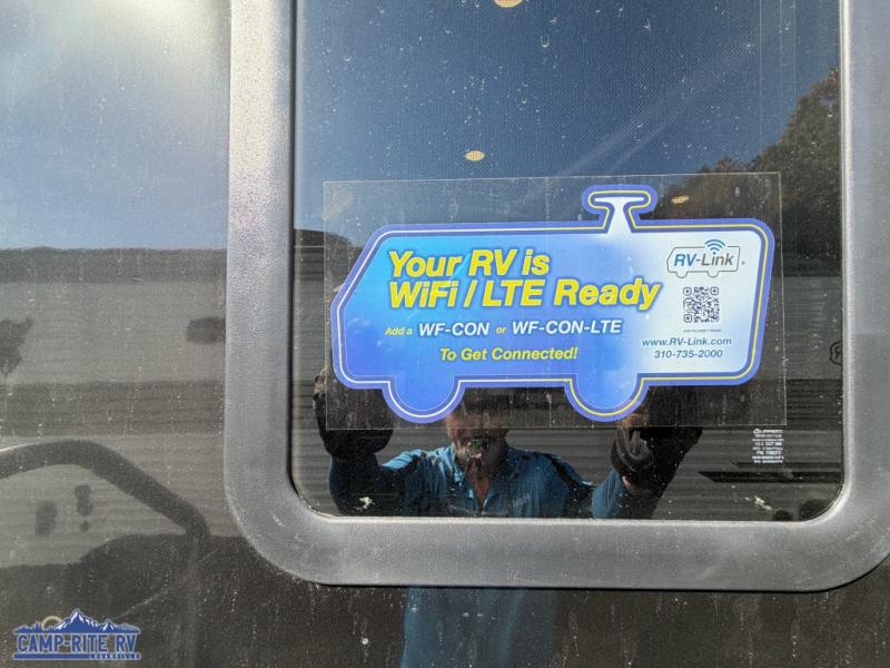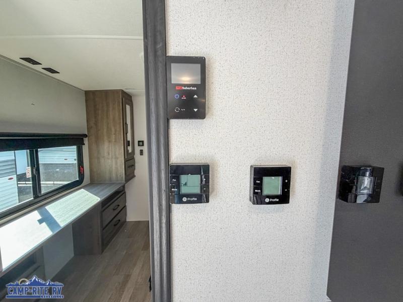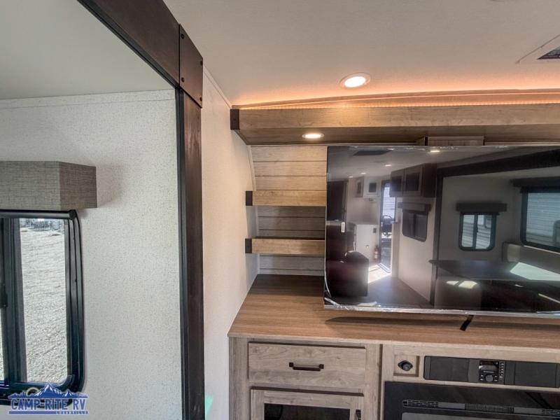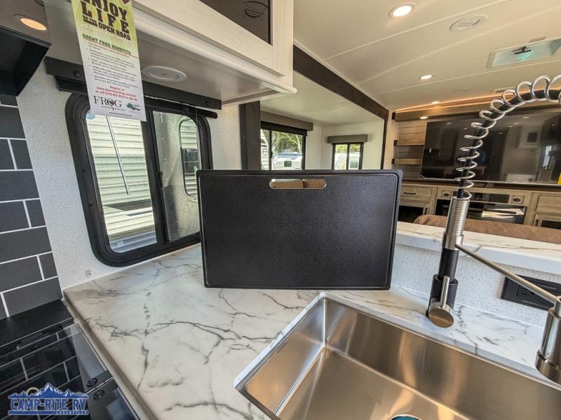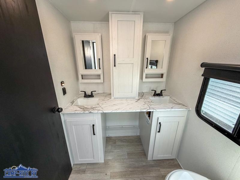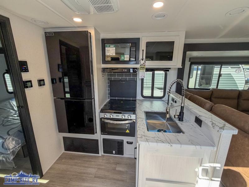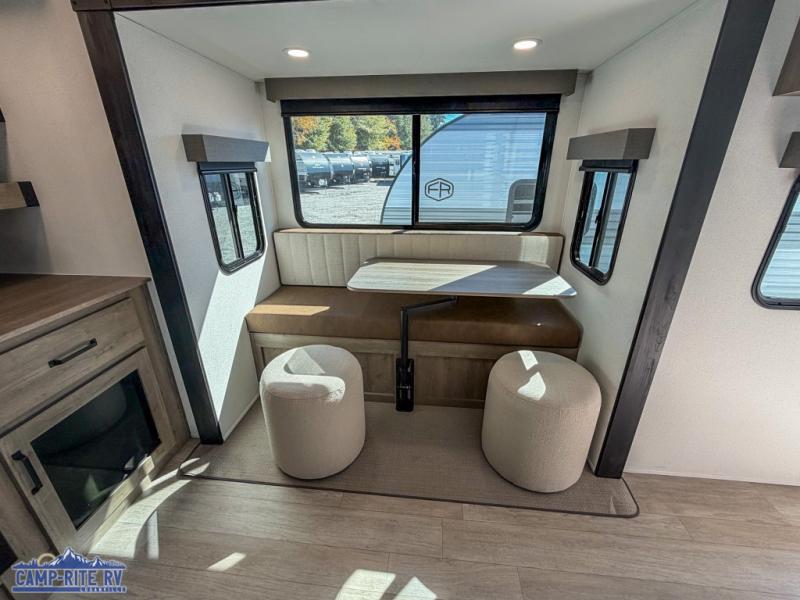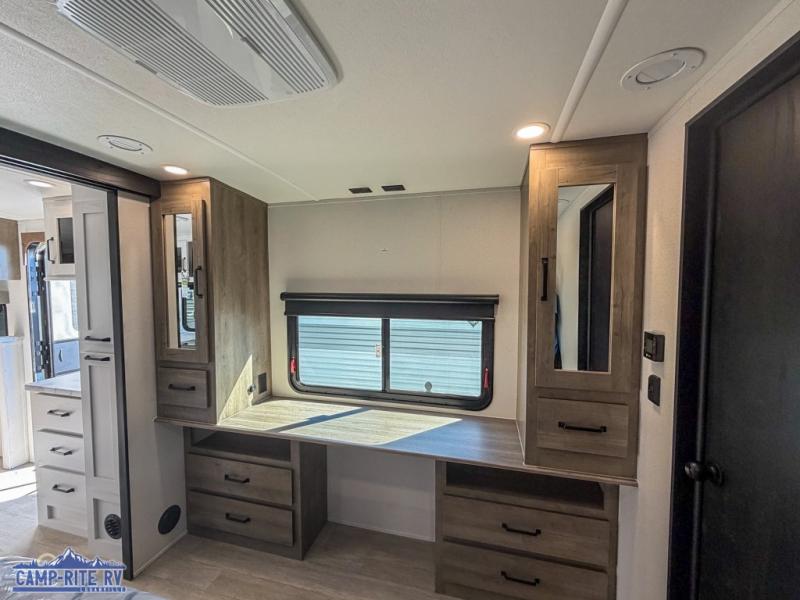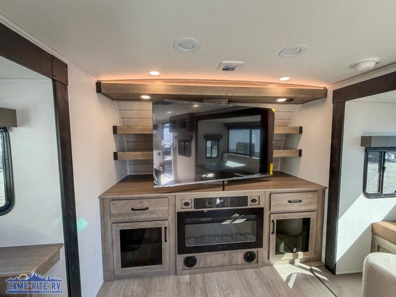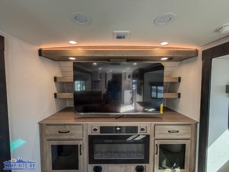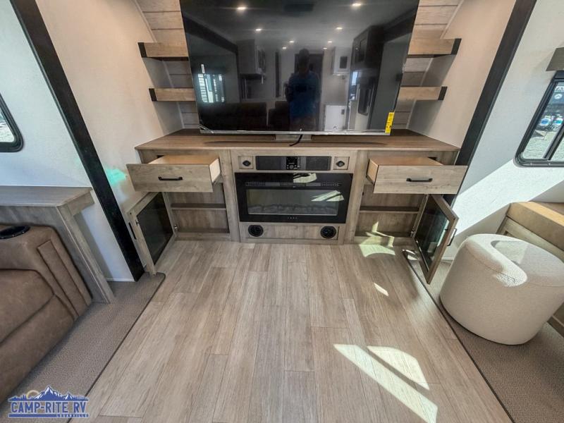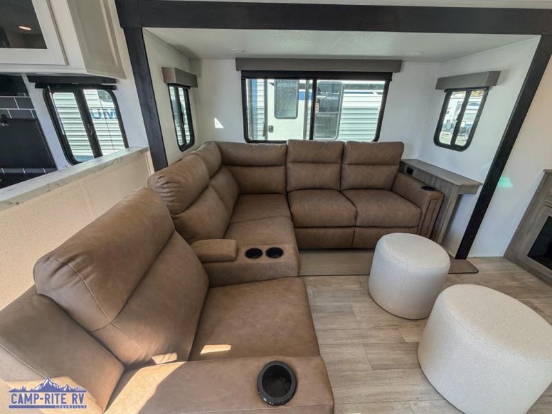 This travel trailer will feel just like home with its front living area, master bedroom, and triple slides for more space! You'll enjoy the L-shaped sofa with a tri-fold on one end and theater seats on the other. And there is a front entertainment center with a TV and fireplace to make it cozier. A middle kitchen includes all the appliances to make meals each day, plus an electric refrigerator and pantry for food storage. Head towards the back to find the master bedroom with a king bed slide out, dual wardrobes, and a desk with drawers if you need to get some work done. And the full rear bath is super accommodating with its dual bath sinks plus washer and dryer prep!