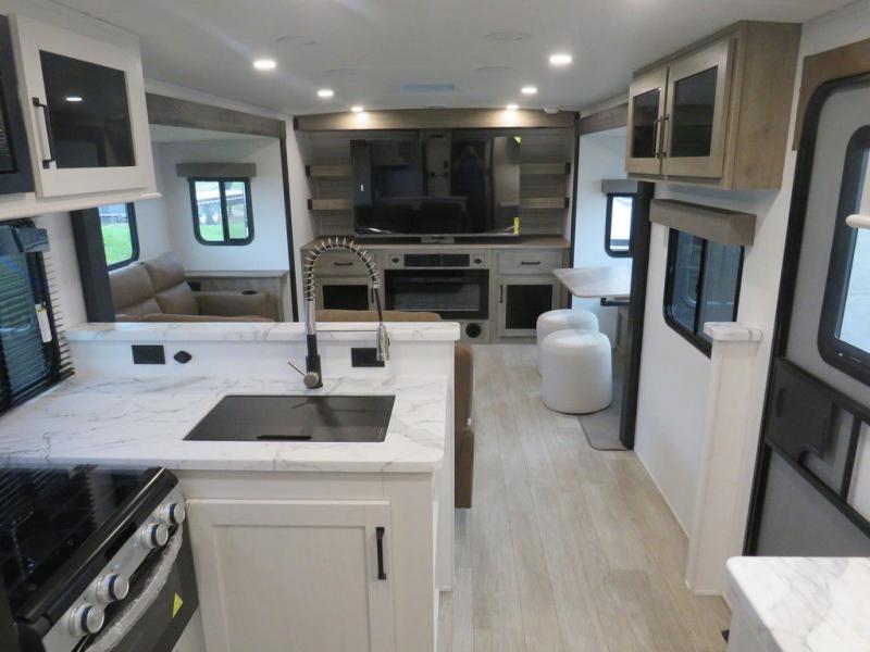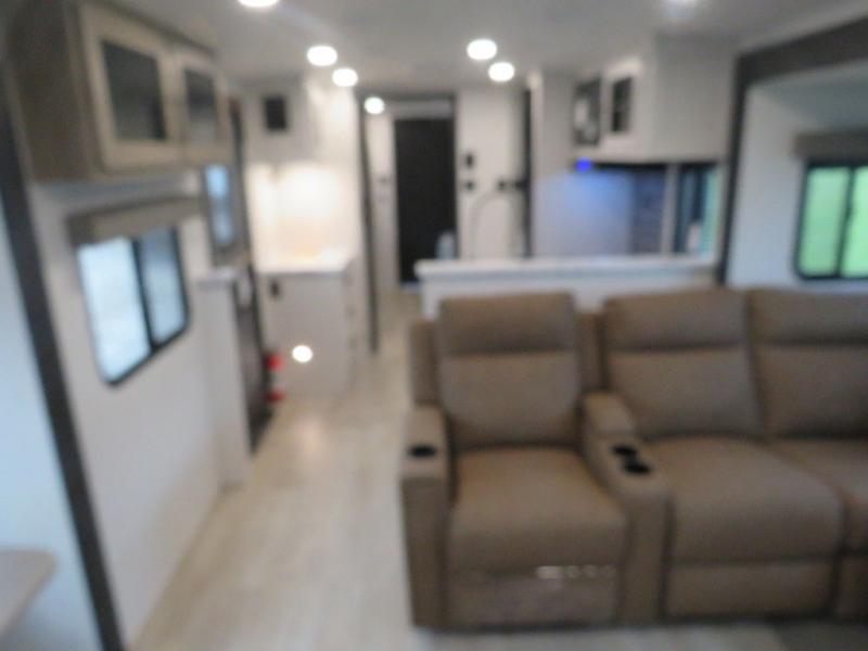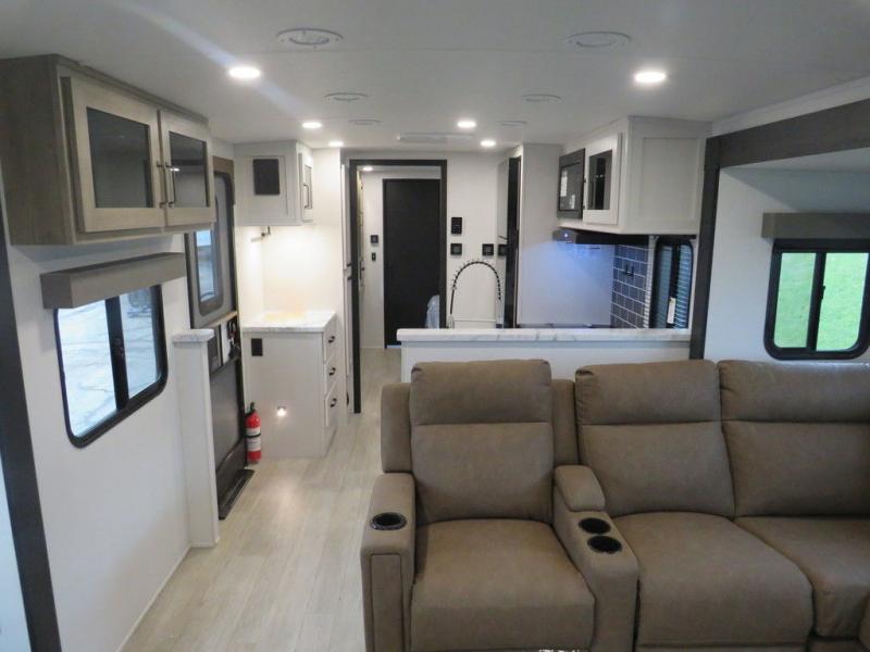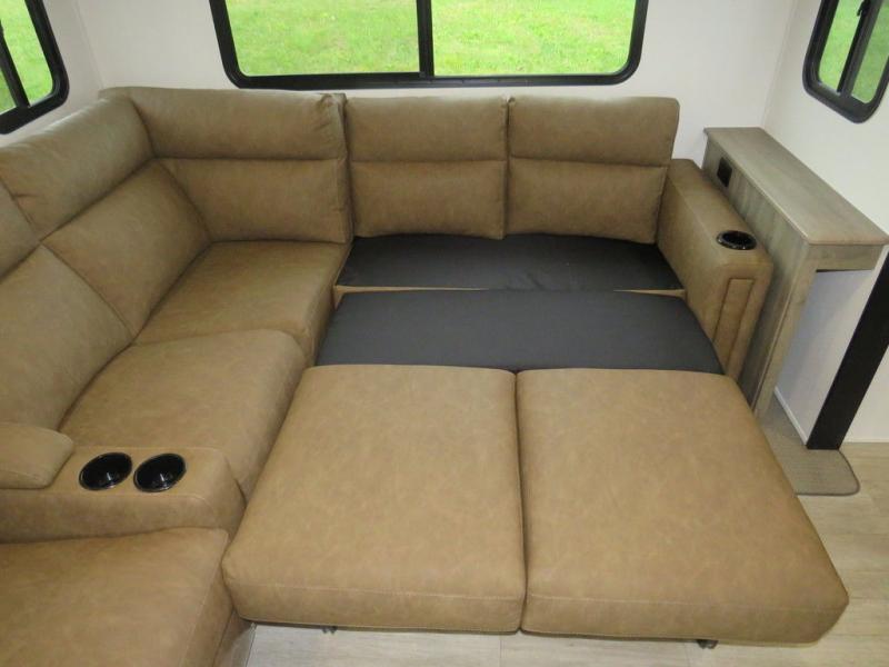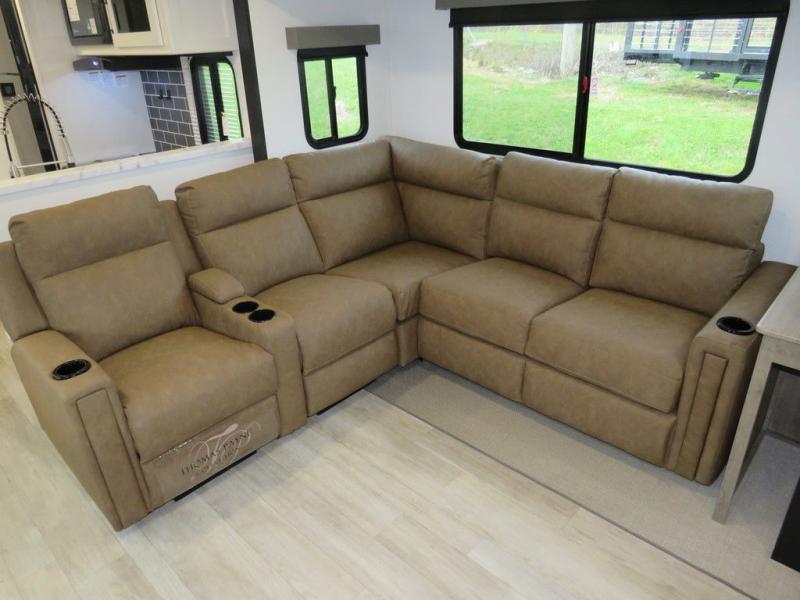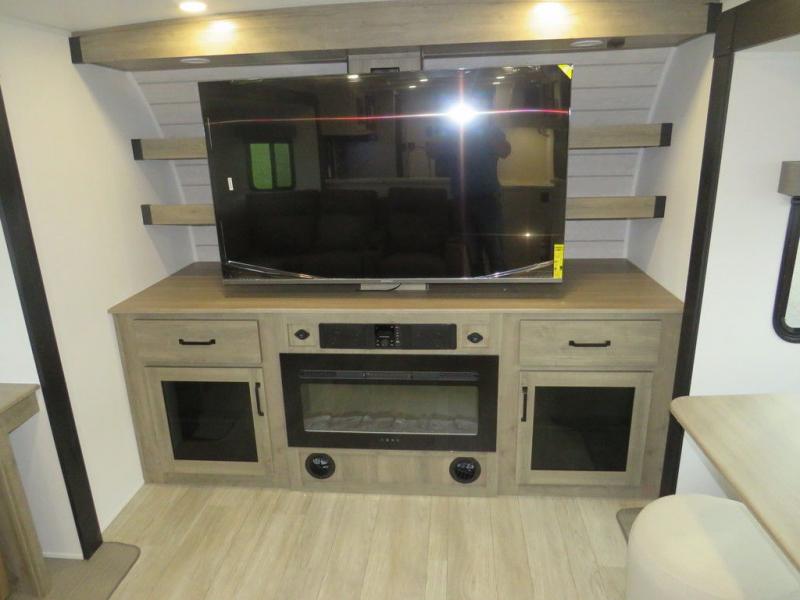 This travel trailer will feel just like home with its front living area, master bedroom, and triple slides for more space! You'll enjoy the L-shaped sofa with a tri-fold on one end and theater seats on the other. And there is a front entertainment center with a TV and fireplace to make it cozier. A middle kitchen includes all the appliances to make meals each day, plus an electric refrigerator and pantry for food storage. Head towards the back to find the master bedroom with a king bed slide out, dual wardrobes, and a desk with drawers if you need to get some work done. And the full rear bath is super accommodating with its dual bath sinks plus washer and dryer prep!
