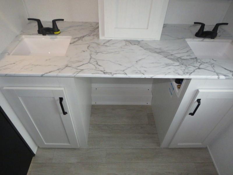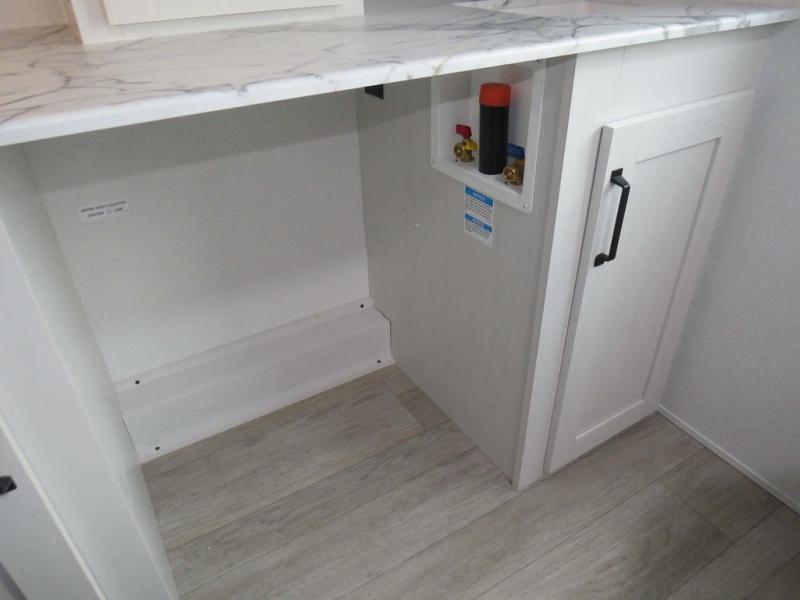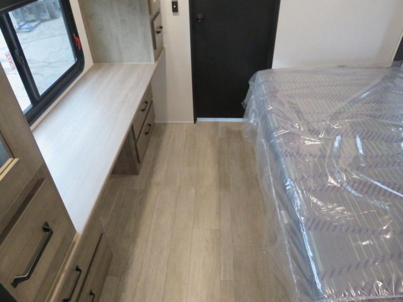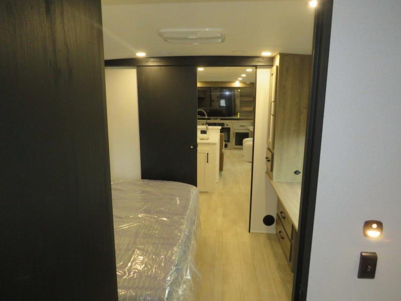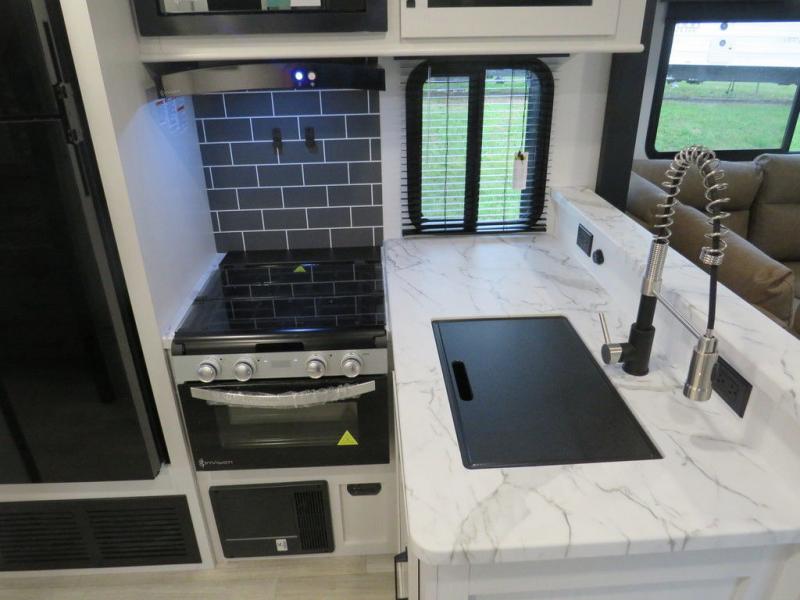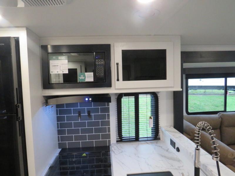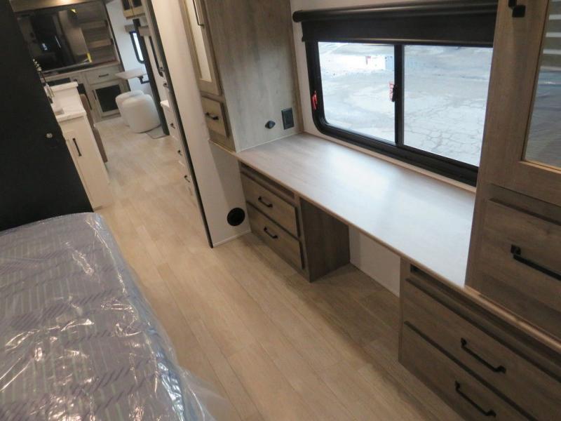 This travel trailer will feel just like home with its front living area, master bedroom, and triple slides for more space! You'll enjoy the L-shaped sofa with a tri-fold on one end and theater seats on the other. And there is a front entertainment center with a TV and fireplace to make it cozier. A middle kitchen includes all the appliances to make meals each day, plus an electric refrigerator and pantry for food storage. Head towards the back to find the master bedroom with a king bed slide out, dual wardrobes, and a desk with drawers if you need to get some work done. And the full rear bath is super accommodating with its dual bath sinks plus washer and dryer prep!