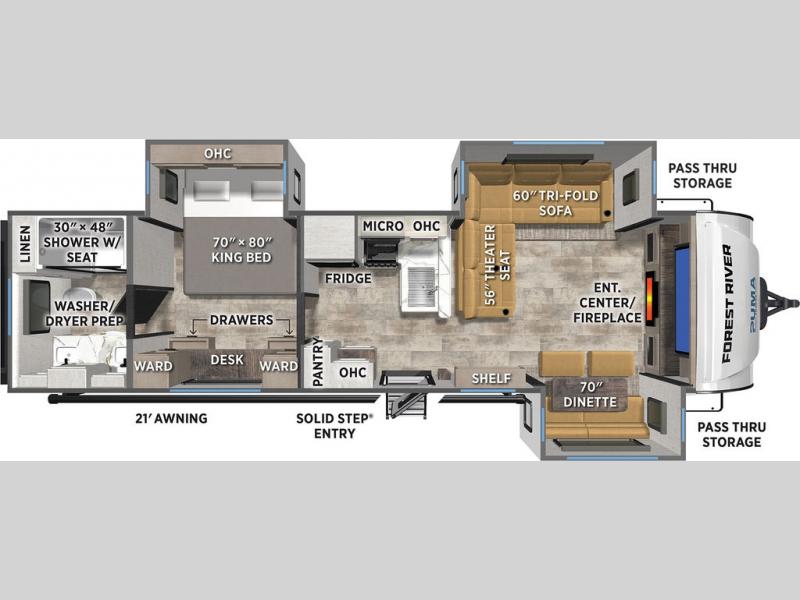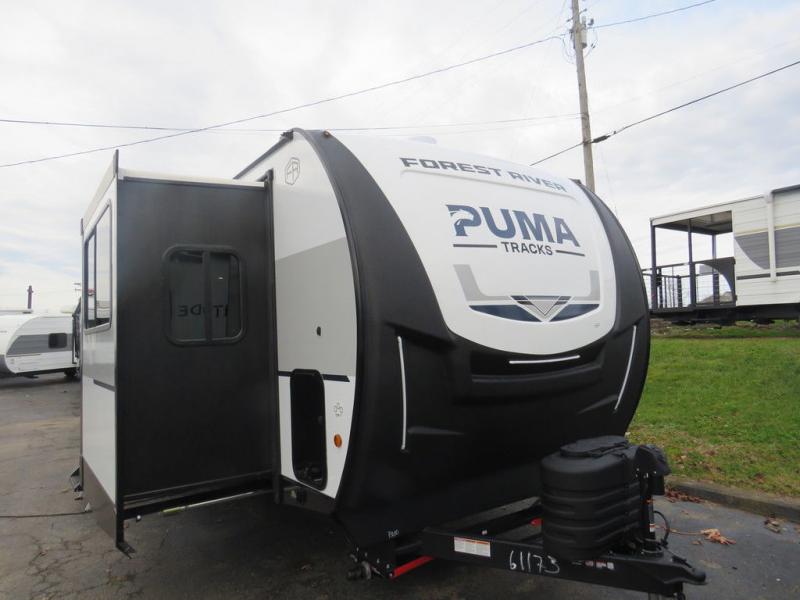 Each Puma Tracks travel trailer by Forest River is constructed with a fully enclosed/heated underbelly for added protection against the elements, plus a fully laminated roof and rear wall for durability. The slam latch baggage doors with magnets will make it easier than ever to pack up your camp gear, and the power awning with LED lights will provide shade during the day and inviting ambiance at night. Head inside to enjoy the roller shades, smoked glass kitchen cabinet doors, stainless-steel sink, and LED lights to keep your space well lit. Some of the available options include a bedroom A/C, a Wi-Fi booster, heated holding tanks, and more!