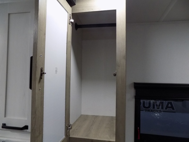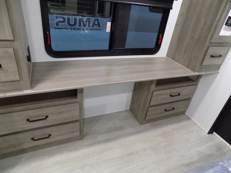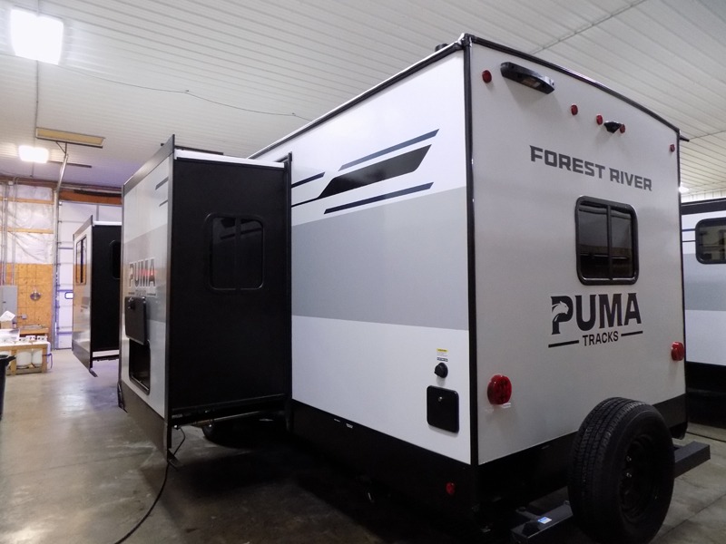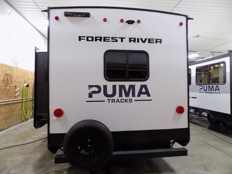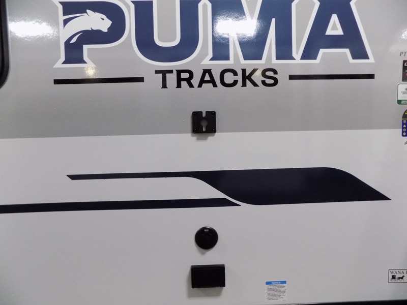 Each Puma Tracks travel trailer by Forest River is constructed with a fully enclosed/heated underbelly for added protection against the elements, plus a fully laminated roof and rear wall for durability. The slam latch baggage doors with magnets will make it easier than ever to pack up your camp gear, and the power awning with LED lights will provide shade during the day and inviting ambiance at night. Head inside to enjoy the roller shades, smoked glass kitchen cabinet doors, stainless-steel sink, and LED lights to keep your space well lit. Some of the available options include a bedroom A/C, a Wi-Fi booster, heated holding tanks, and more!