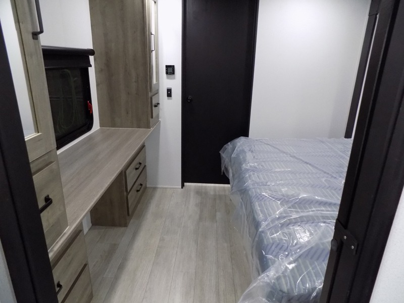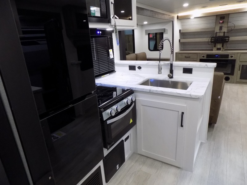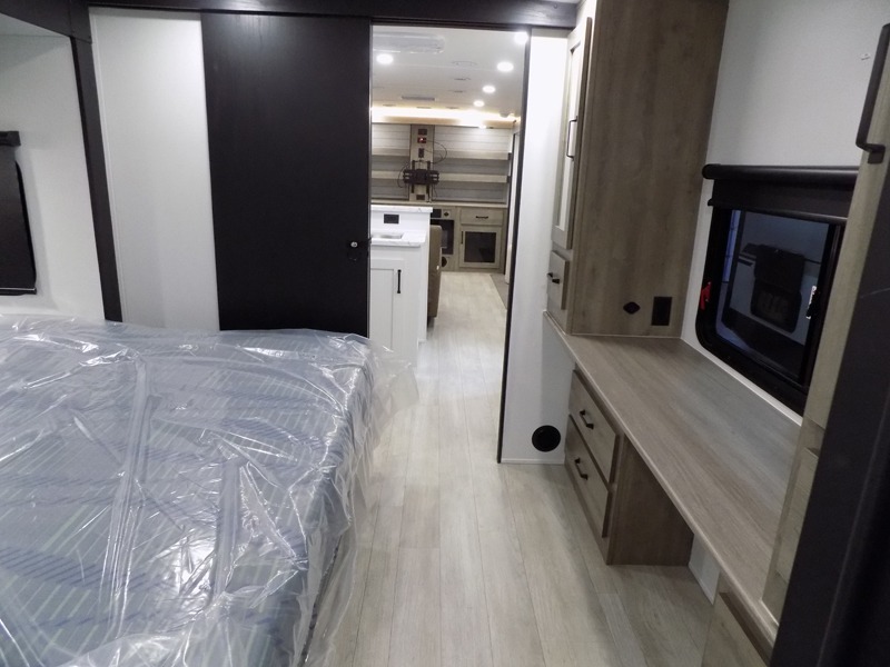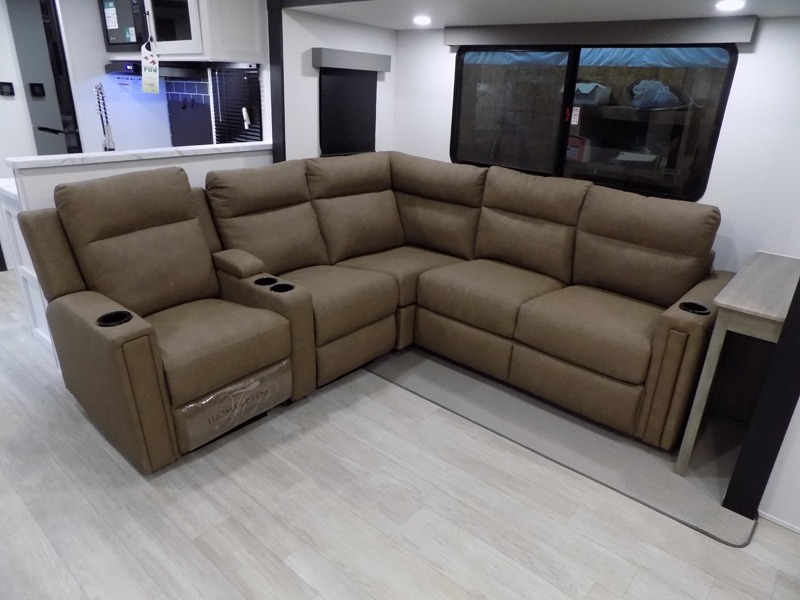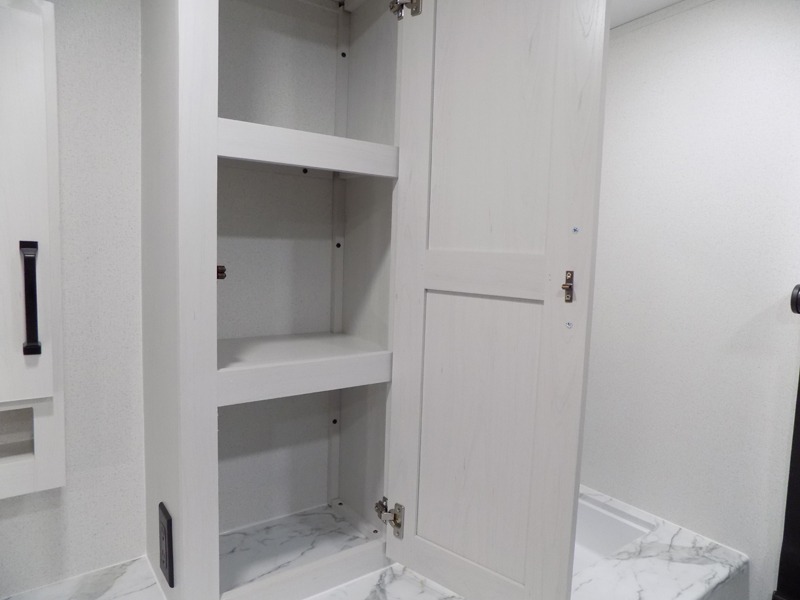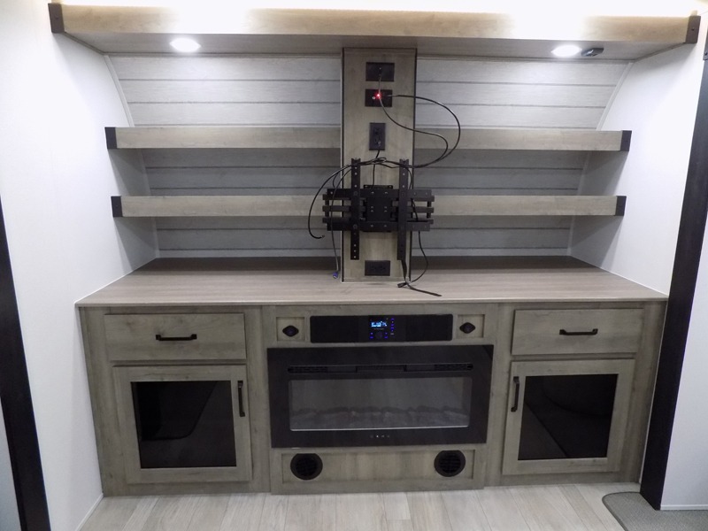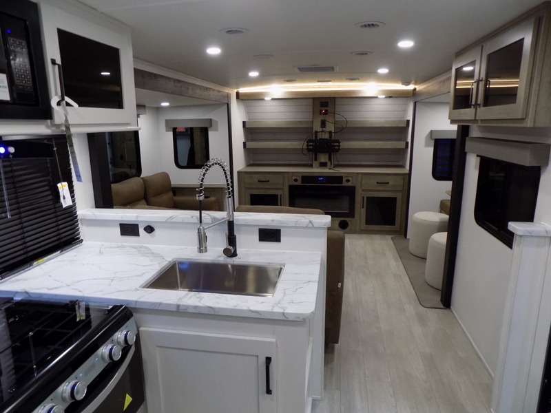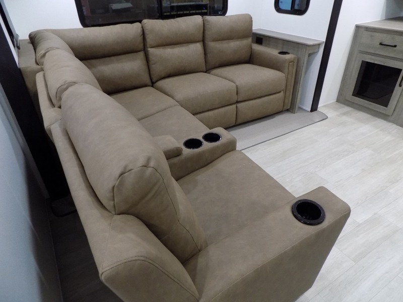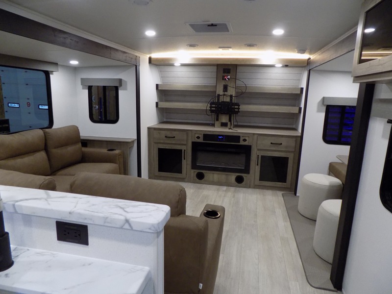 This travel trailer will feel just like home with its front living area, master bedroom, and triple slides for more space! You'll enjoy the L-shaped sofa with a tri-fold on one end and theater seats on the other. And there is a front entertainment center with a TV and fireplace to make it cozier. A middle kitchen includes all the appliances to make meals each day, plus an electric refrigerator and pantry for food storage. Head towards the back to find the master bedroom with a king bed slide out, dual wardrobes, and a desk with drawers if you need to get some work done. And the full rear bath is super accommodating with its dual bath sinks plus washer and dryer prep!