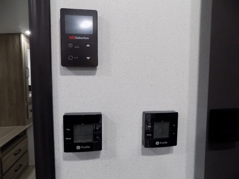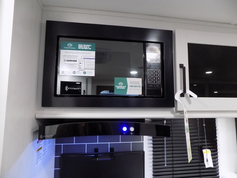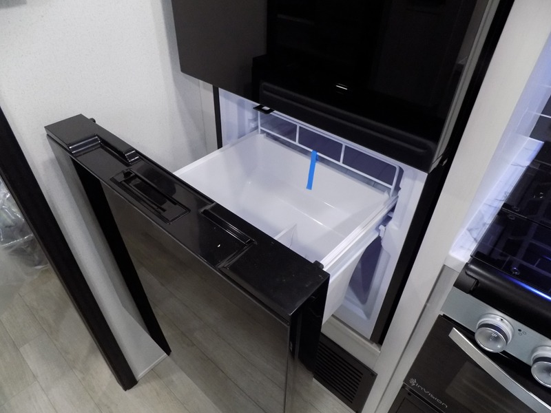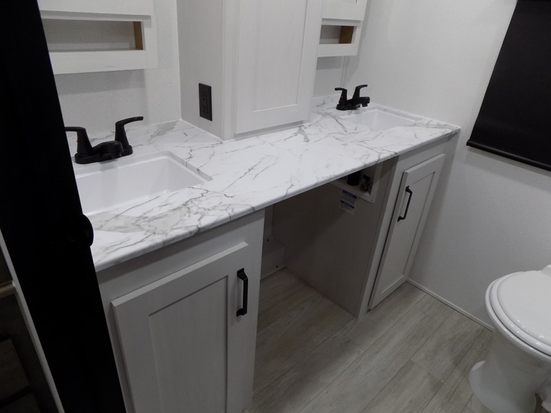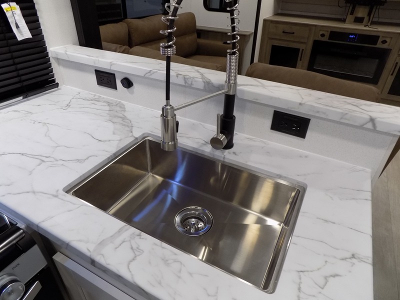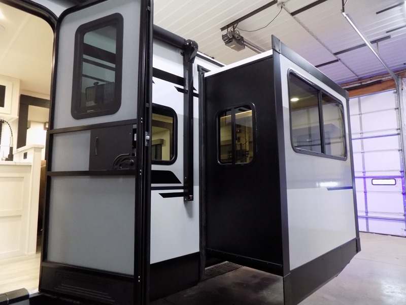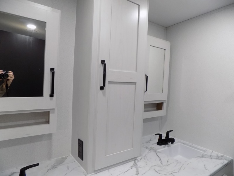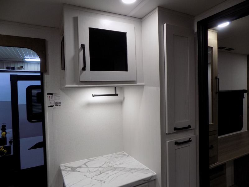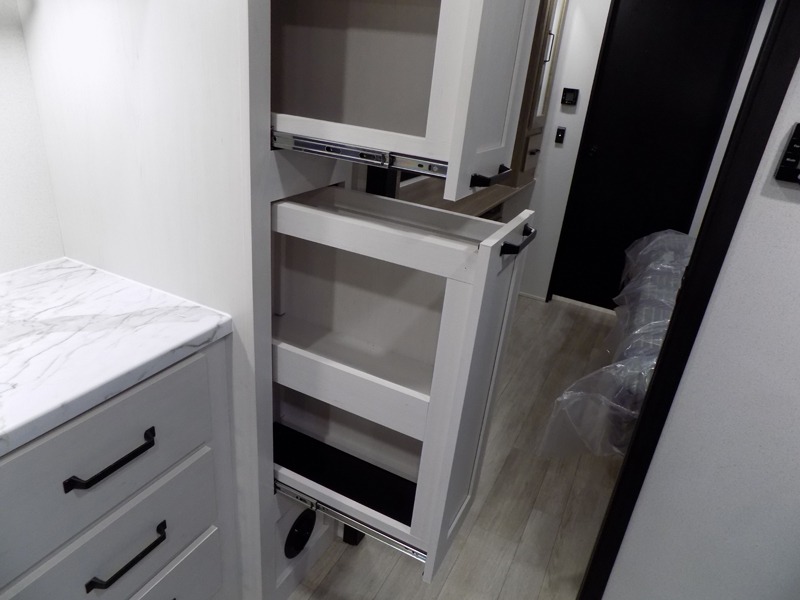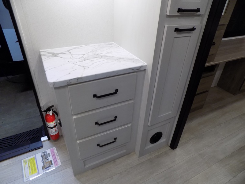 This travel trailer will feel just like home with its front living area, master bedroom, and triple slides for more space! You'll enjoy the L-shaped sofa with a tri-fold on one end and theater seats on the other. And there is a front entertainment center with a TV and fireplace to make it cozier. A middle kitchen includes all the appliances to make meals each day, plus an electric refrigerator and pantry for food storage. Head towards the back to find the master bedroom with a king bed slide out, dual wardrobes, and a desk with drawers if you need to get some work done. And the full rear bath is super accommodating with its dual bath sinks plus washer and dryer prep!