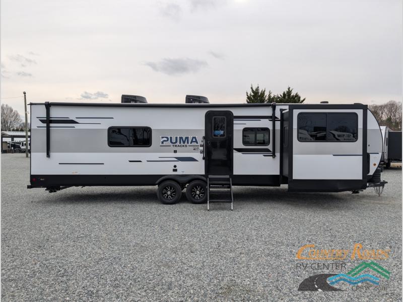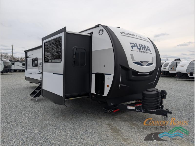 Each Puma Tracks travel trailer by Forest River is constructed with a fully enclosed/heated underbelly for added protection against the elements, plus a fully laminated roof and rear wall for durability. The slam latch baggage doors with magnets will make it easier than ever to pack up your camp gear, and the power awning with LED lights will provide shade during the day and inviting ambiance at night. Head inside to enjoy the roller shades, smoked glass kitchen cabinet doors, stainless-steel sink, and LED lights to keep your space well lit. Some of the available options include a bedroom A/C, a Wi-Fi booster, heated holding tanks, and more!