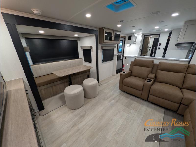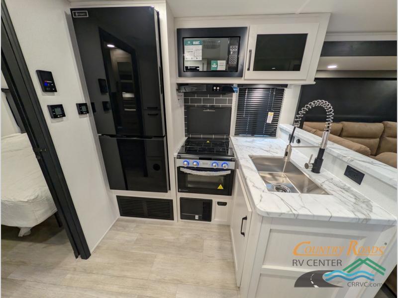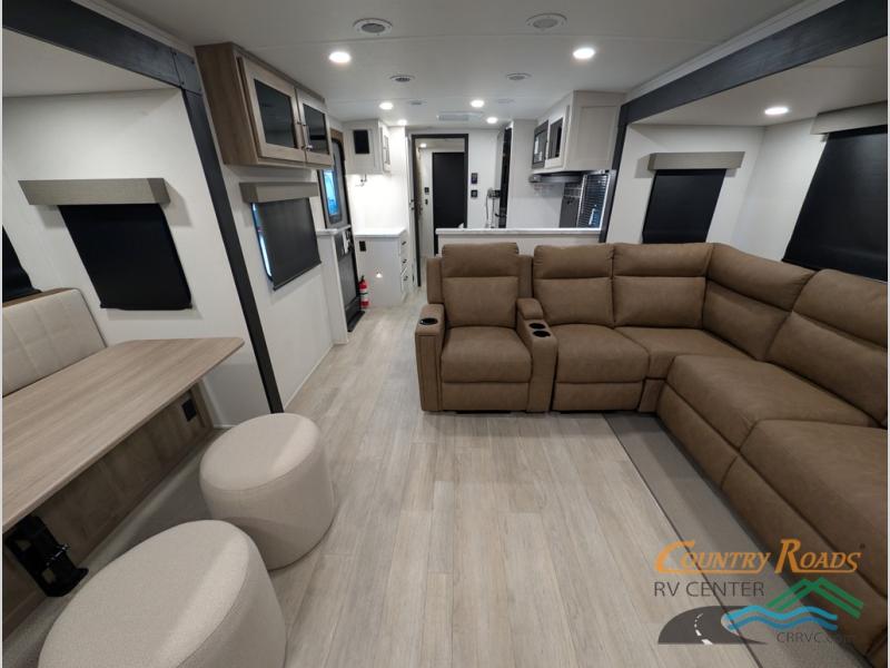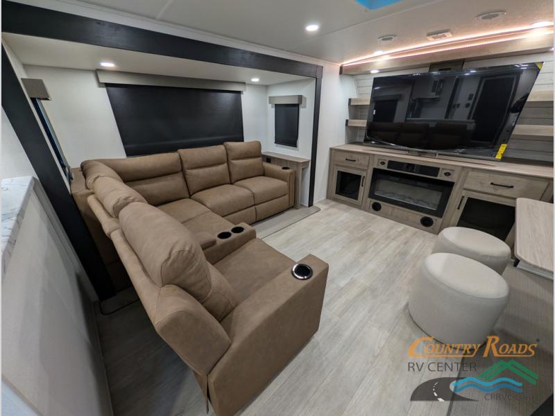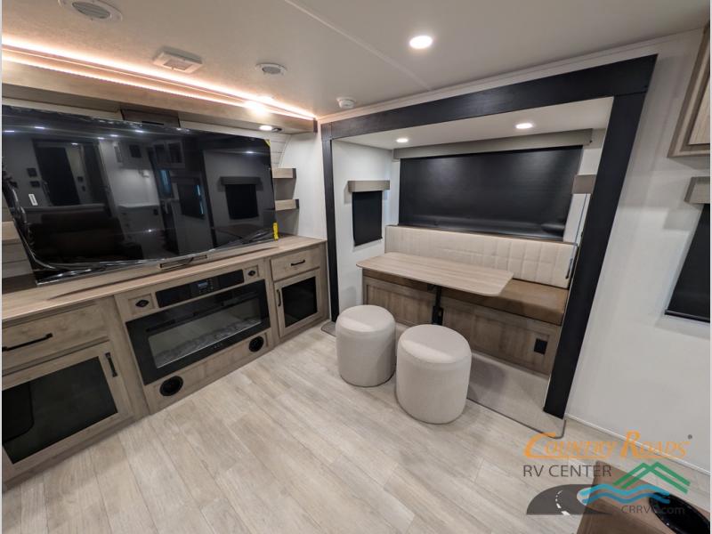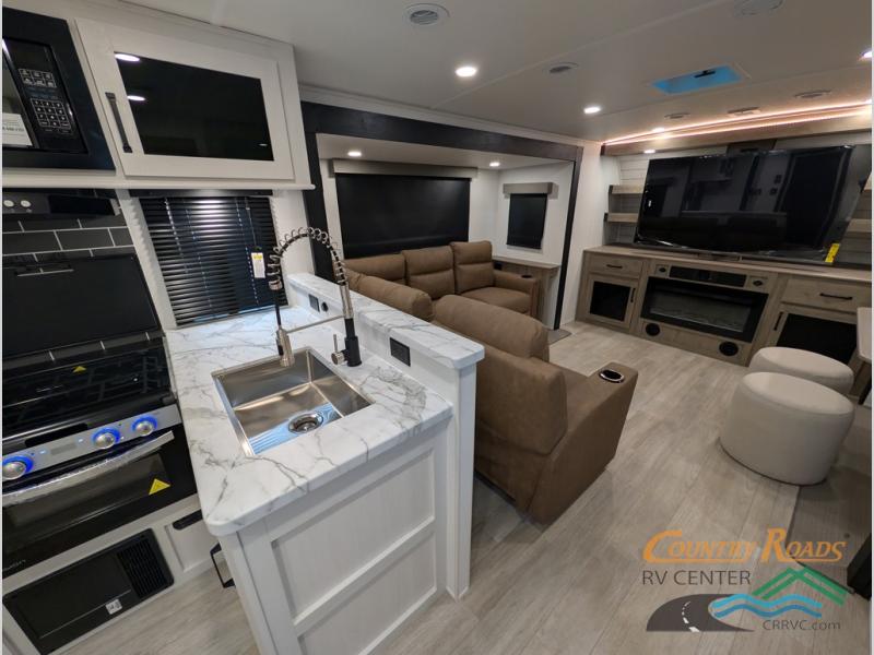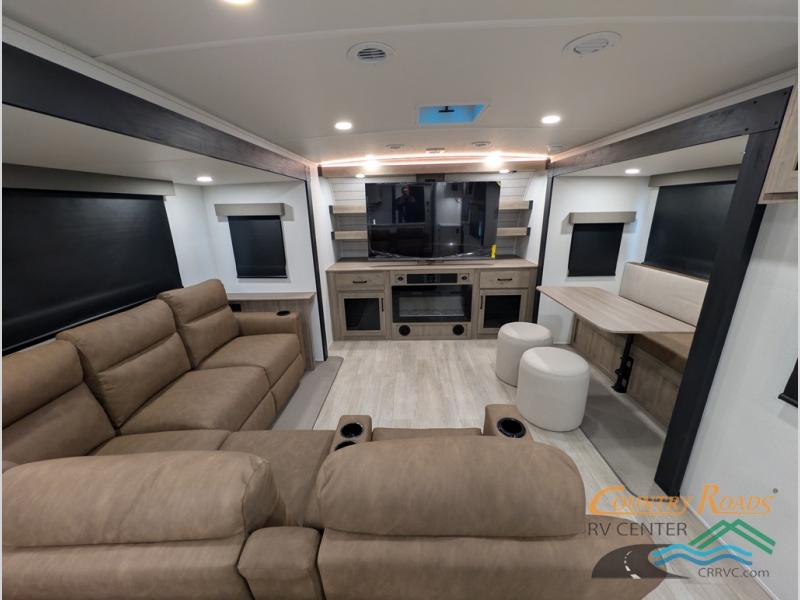 This travel trailer will feel just like home with its front living area, master bedroom, and triple slides for more space! You'll enjoy the L-shaped sofa with a tri-fold on one end and theater seats on the other. And there is a front entertainment center with a TV and fireplace to make it cozier. A middle kitchen includes all the appliances to make meals each day, plus an electric refrigerator and pantry for food storage. Head towards the back to find the master bedroom with a king bed slide out, dual wardrobes, and a desk with drawers if you need to get some work done. And the full rear bath is super accommodating with its dual bath sinks plus washer and dryer prep!