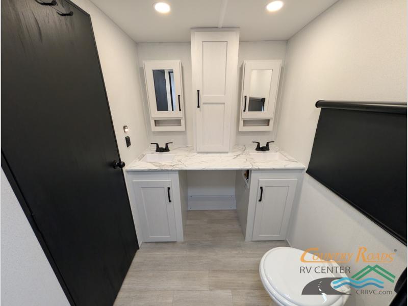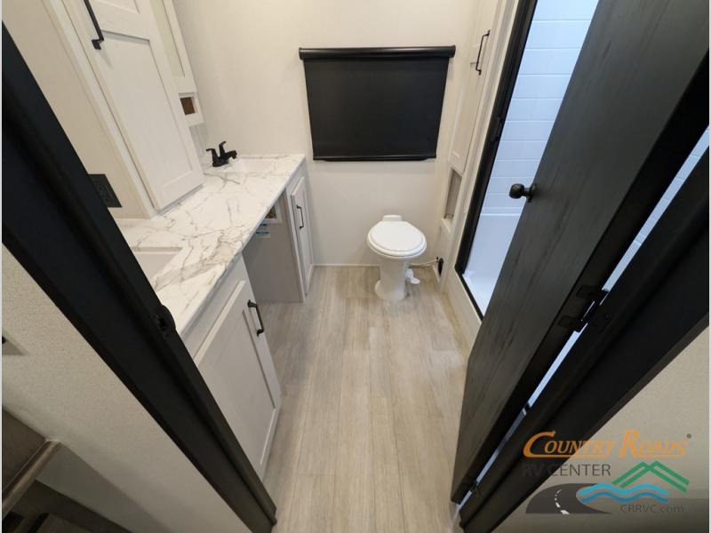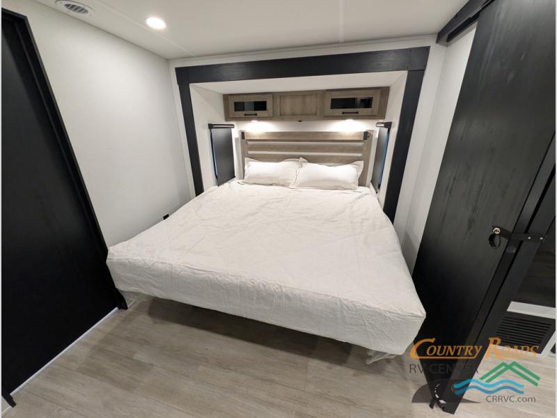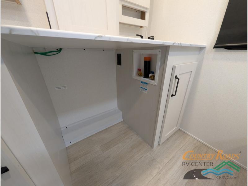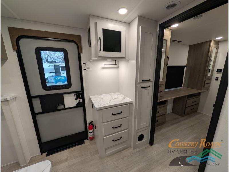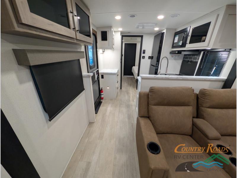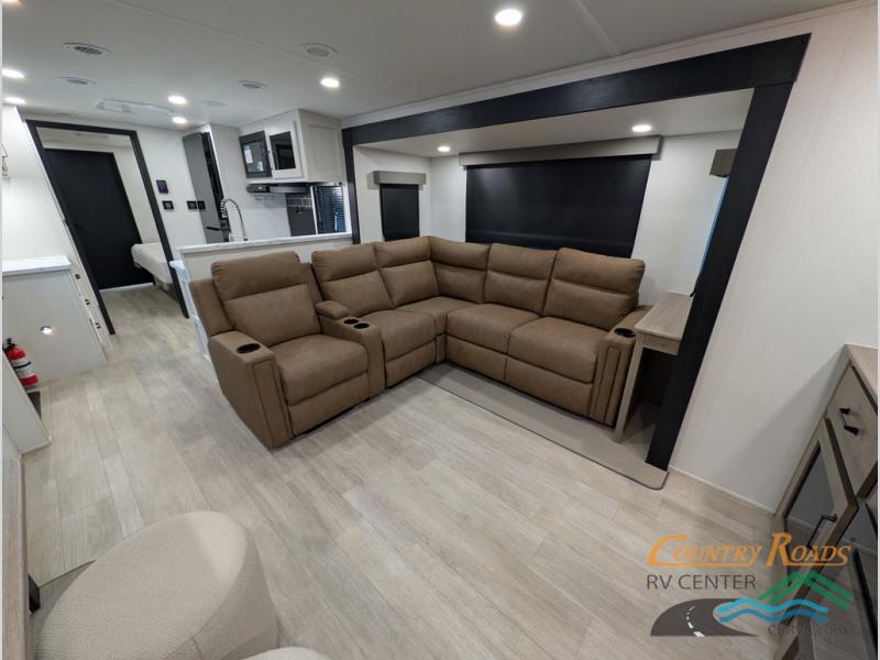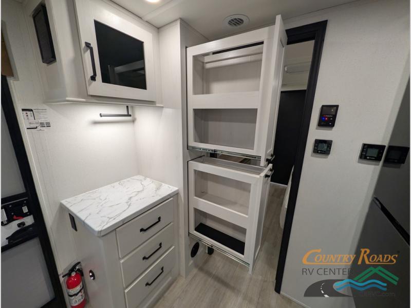 This travel trailer will feel just like home with its front living area, master bedroom, and triple slides for more space! You'll enjoy the L-shaped sofa with a tri-fold on one end and theater seats on the other. And there is a front entertainment center with a TV and fireplace to make it cozier. A middle kitchen includes all the appliances to make meals each day, plus an electric refrigerator and pantry for food storage. Head towards the back to find the master bedroom with a king bed slide out, dual wardrobes, and a desk with drawers if you need to get some work done. And the full rear bath is super accommodating with its dual bath sinks plus washer and dryer prep!