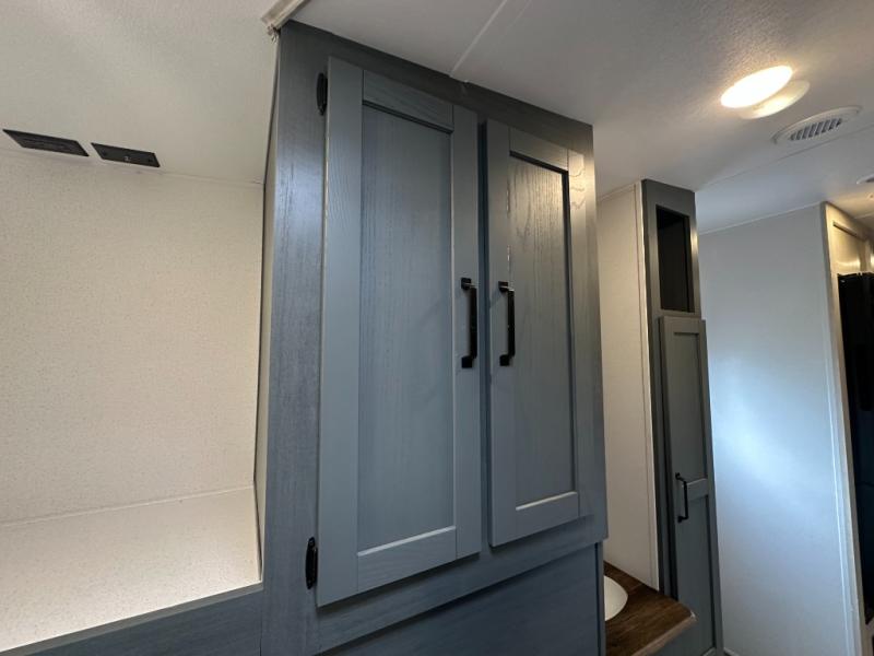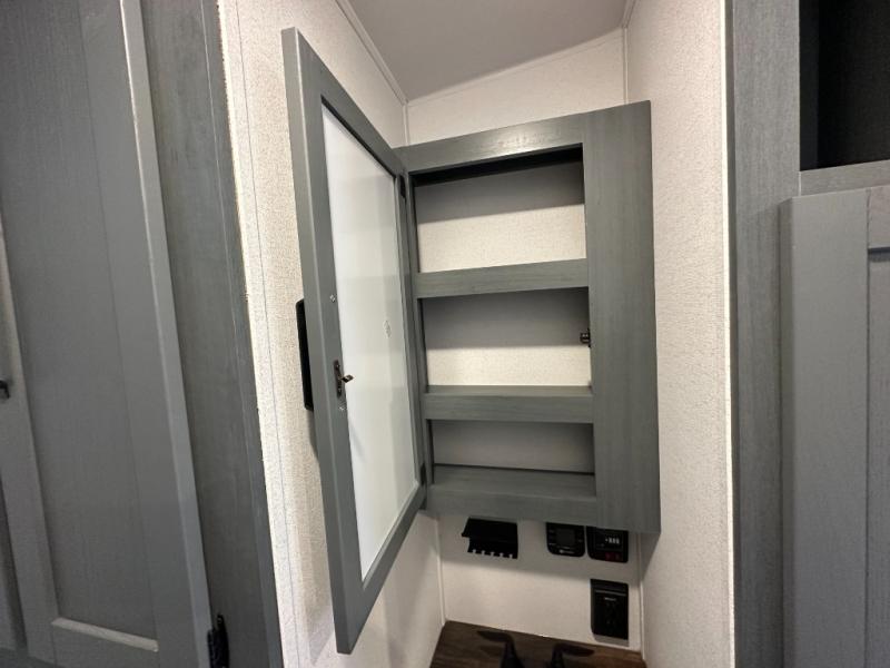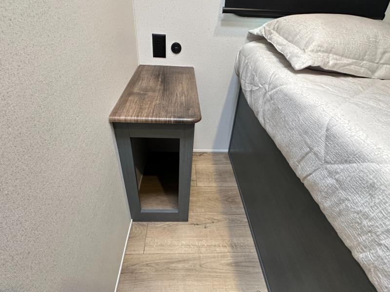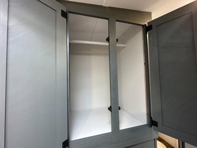 Front Bedroom with RV Queen Bed, wardrobe, and storage shelf