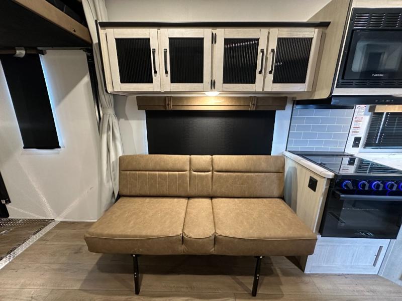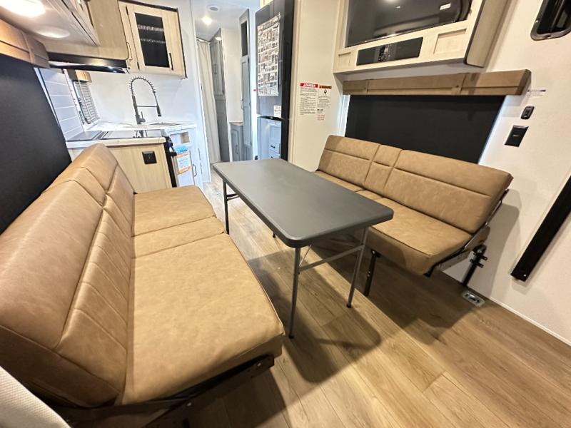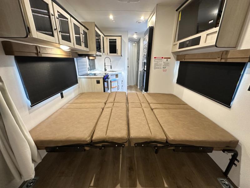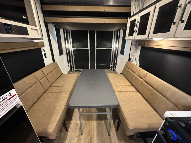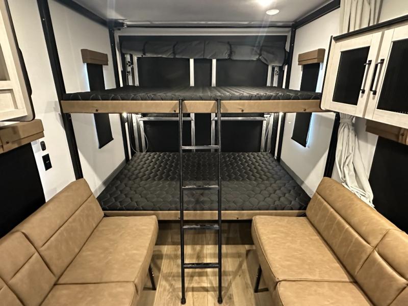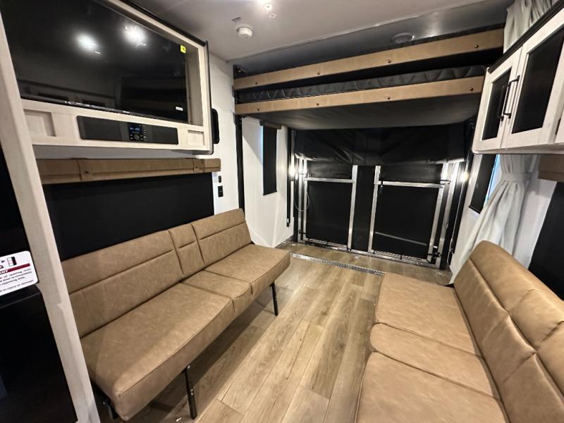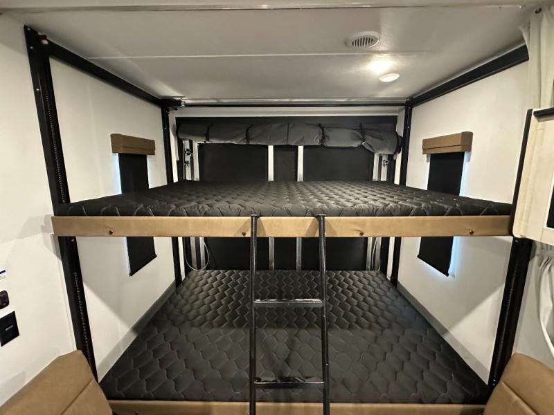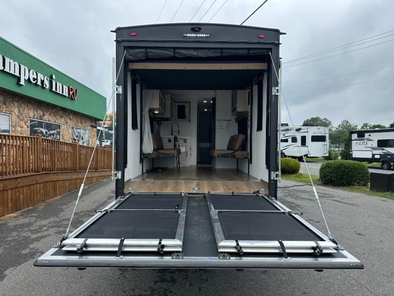 Rear Cargo Area: ~11ft of space to haul bikes or ATVs—transforms into sleeping area via two flip-up sleeper sofas and dinette. Optional electric lift queen bed adds sleeping flexibility