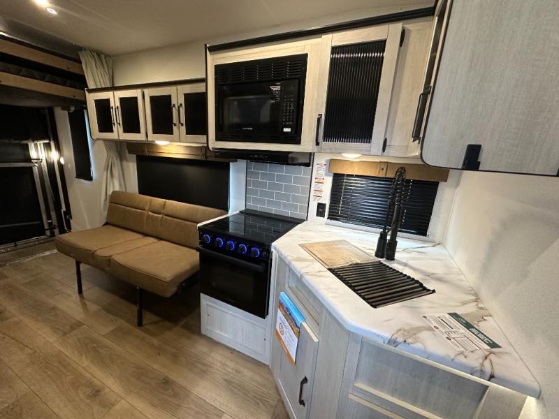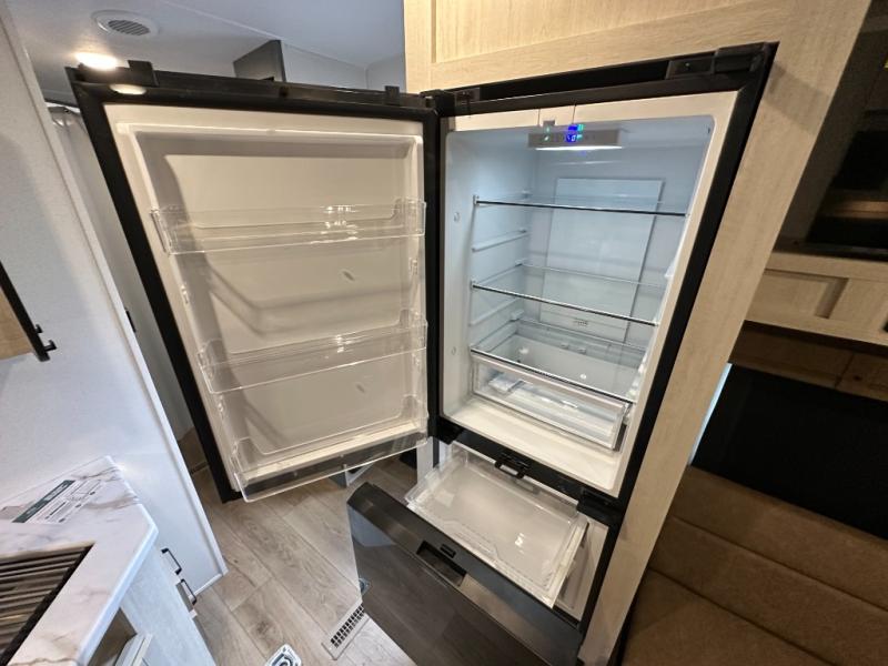 Kitchen: 21" stainless oven, 1.3cuft microwave, and 11cuft residential 12V refrigerator. Optional outside kitchen with griddle for outdoor cooking