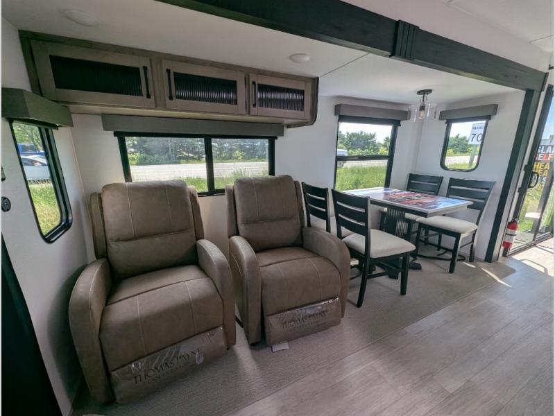 This Puma Destination Trailer features a front living area full of places to relax and feel like you're at home. Opposing slides grant you copious amounts of space in the front. With a sofa, recliners and a dinette, you will not have to fret about where guests can sit. In the rear of this floorplan, a slide out containing a full sized king bed provides a comfortable bedroom. Furthermore, A wardrobe along with a closet with washer/dryer prep can be found very useful for all of your belongings.