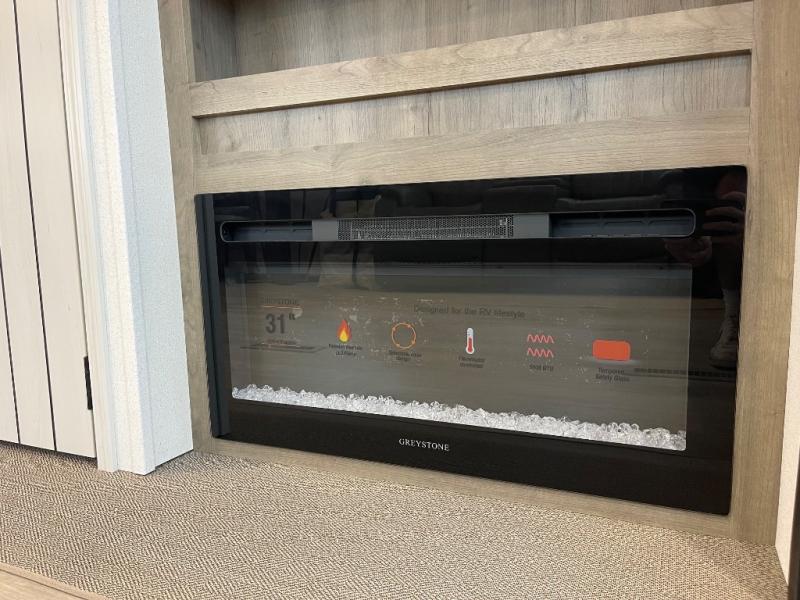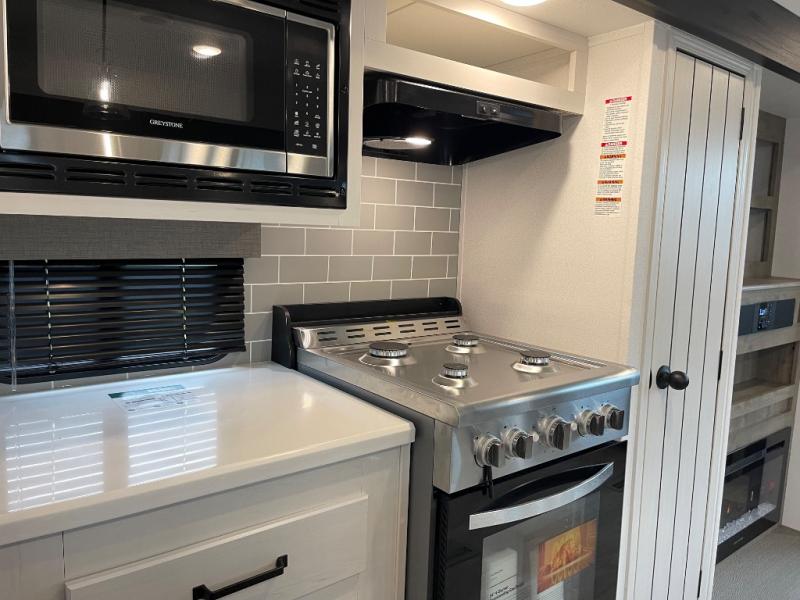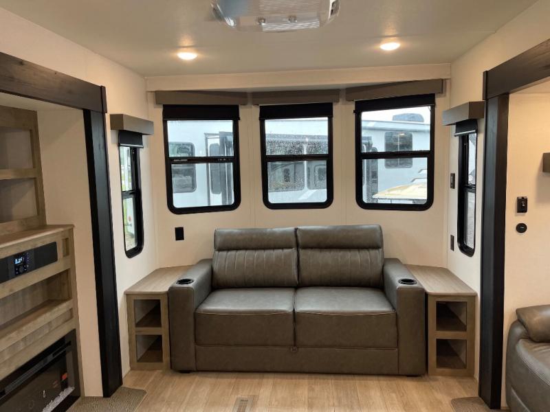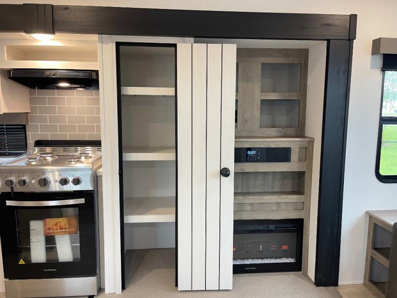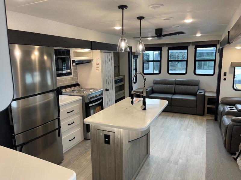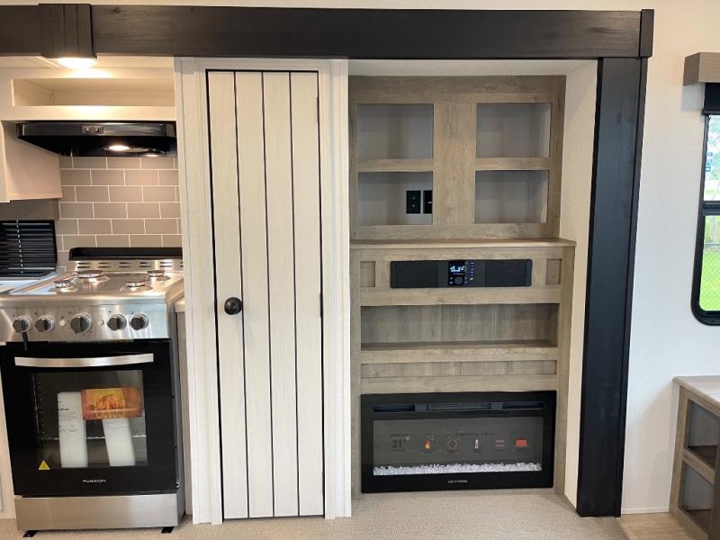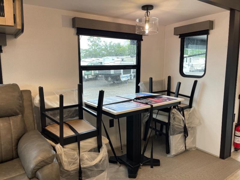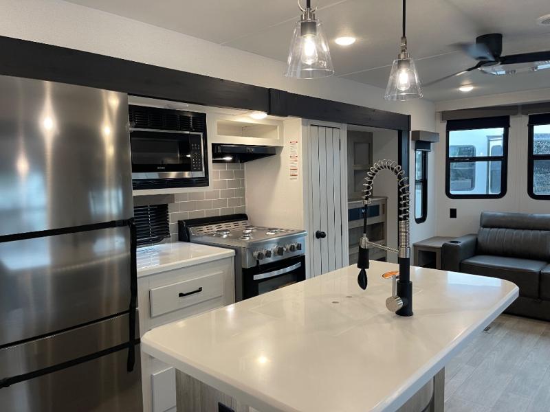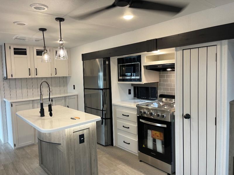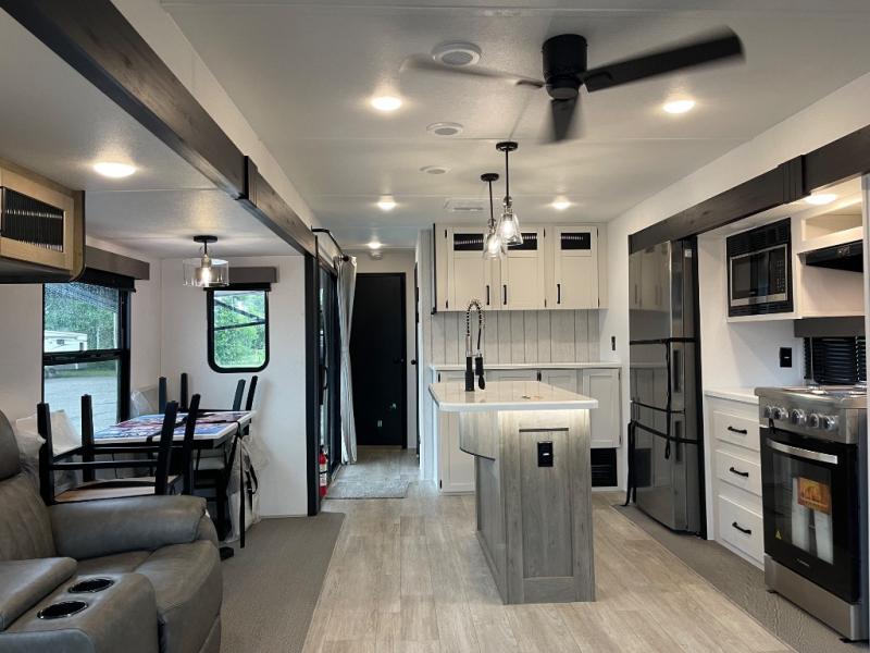 Get ready to enjoy your destination for a weekend or even longer in comfort with the front living and kitchen combined area. The sofa and booth dinette offer relaxing and dining space as well as sleeping space when needed. There are two recliners you are sure to love, as well as a fireplace to make it feel more like home. There is a kitchen island to prepare and serve meals from and wash the dishes. The kitchen offers full amenities including a stainless steel refrigerator and plenty of storage. You will surely enjoy the natural lighting from the patio door, and the second entry/exit is located in the rear private bedroom where you can sleep like a royalty on the king bed. There is also a closet with the option to add washer and dryer prep if you choose!