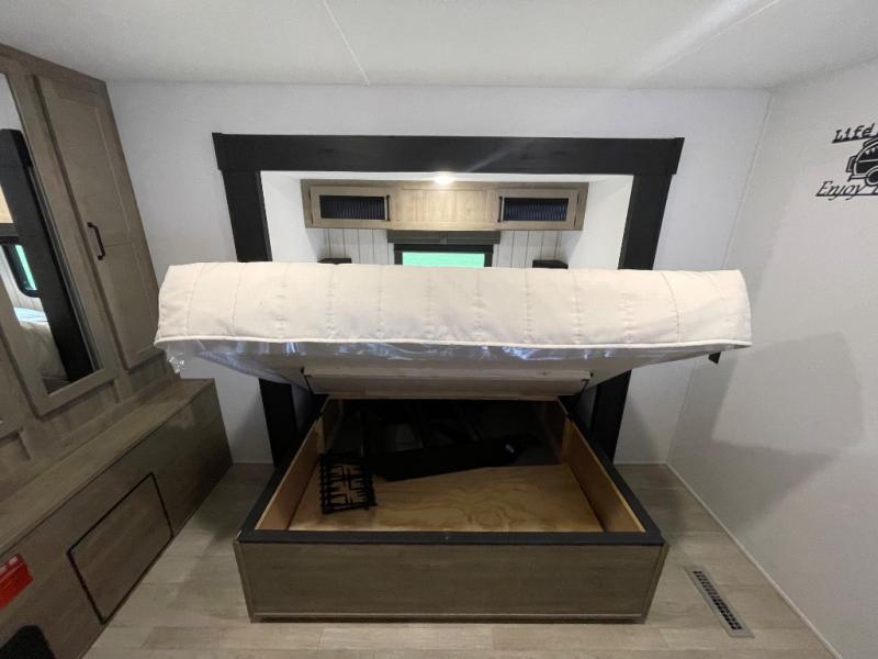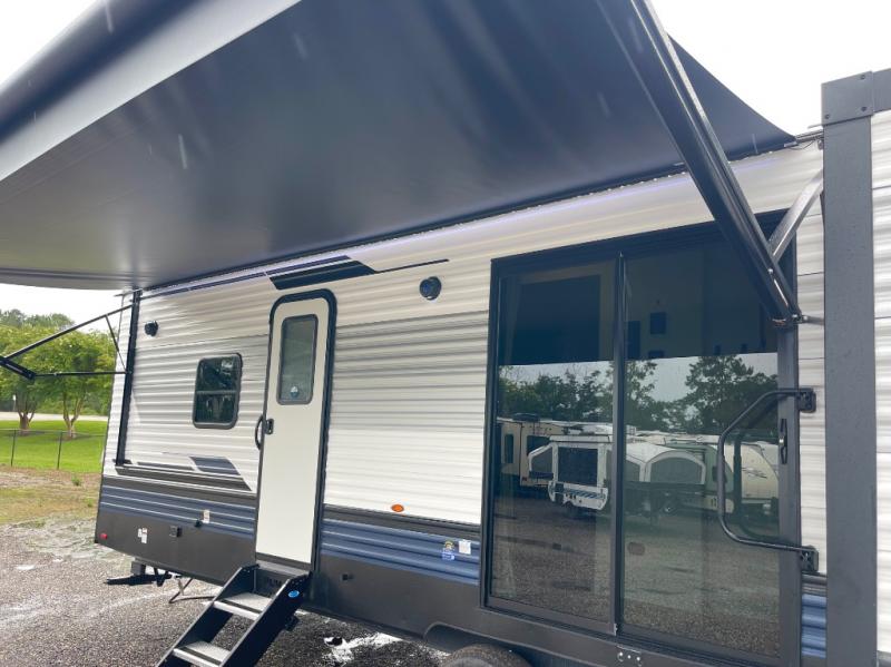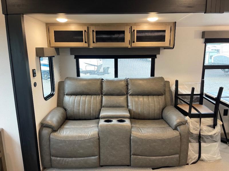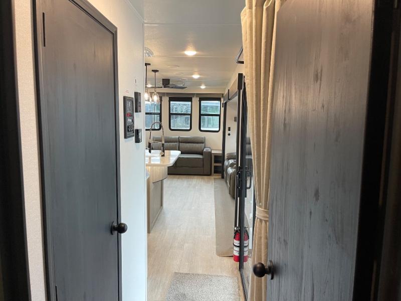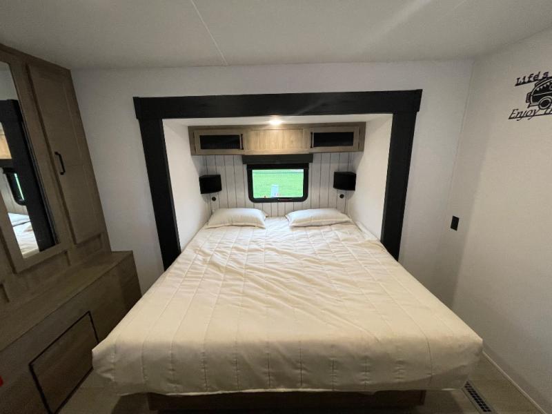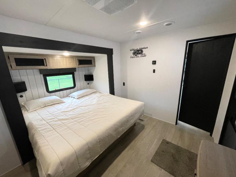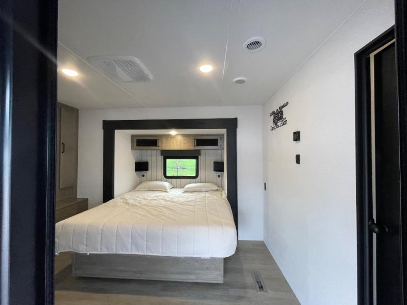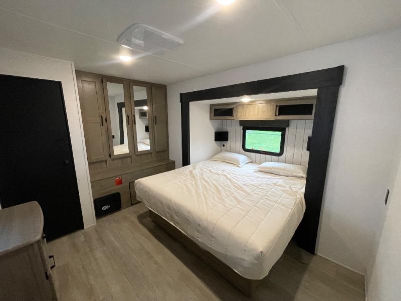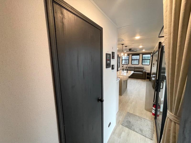 Get ready to enjoy your destination for a weekend or even longer in comfort with the front living and kitchen combined area. The sofa and booth dinette offer relaxing and dining space as well as sleeping space when needed. There are two recliners you are sure to love, as well as a fireplace to make it feel more like home. There is a kitchen island to prepare and serve meals from and wash the dishes. The kitchen offers full amenities including a stainless steel refrigerator and plenty of storage. You will surely enjoy the natural lighting from the patio door, and the second entry/exit is located in the rear private bedroom where you can sleep like a royalty on the king bed. There is also a closet with the option to add washer and dryer prep if you choose!