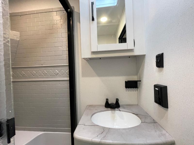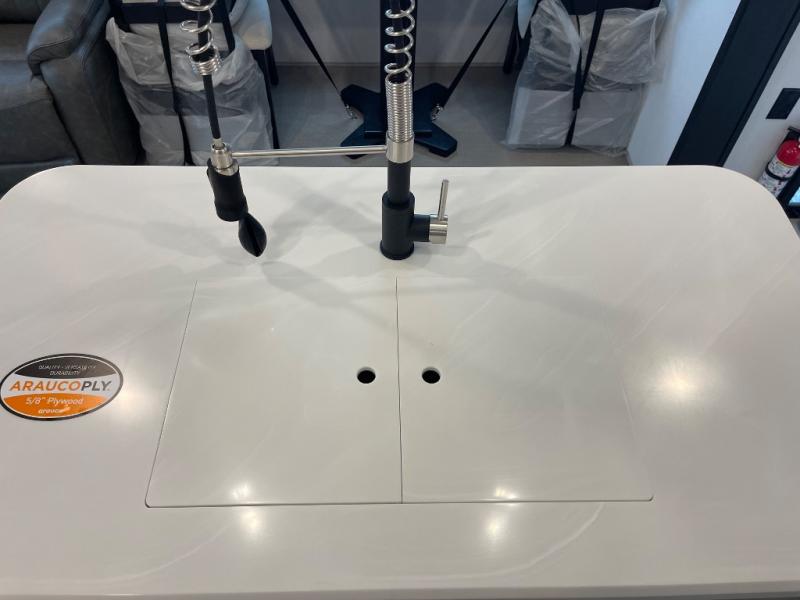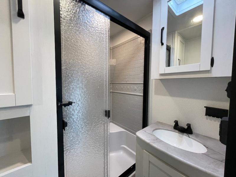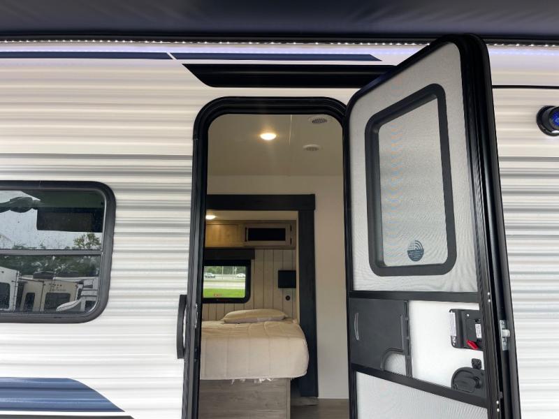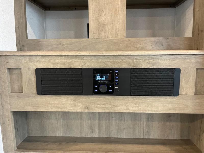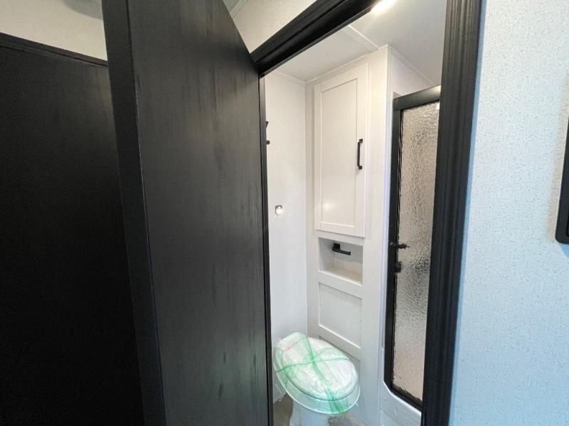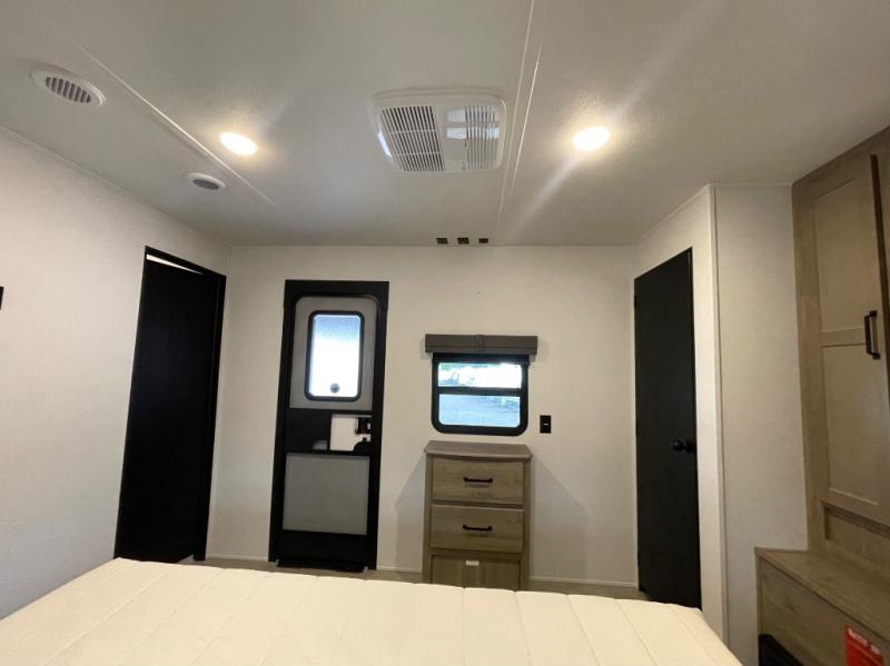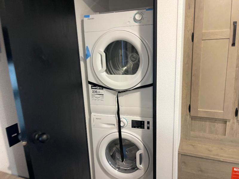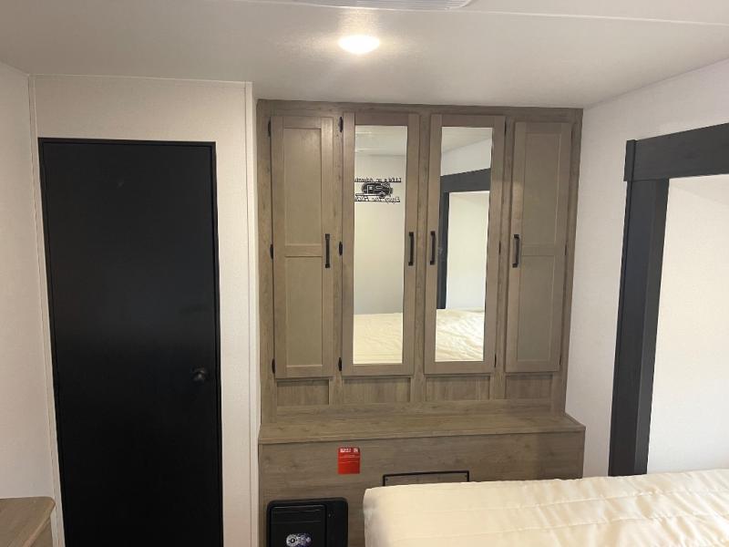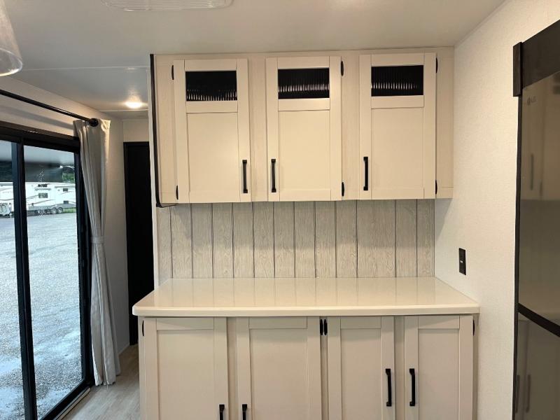 Get ready to enjoy your destination for a weekend or even longer in comfort with the front living and kitchen combined area. The sofa and booth dinette offer relaxing and dining space as well as sleeping space when needed. There are two recliners you are sure to love, as well as a fireplace to make it feel more like home. There is a kitchen island to prepare and serve meals from and wash the dishes. The kitchen offers full amenities including a stainless steel refrigerator and plenty of storage. You will surely enjoy the natural lighting from the patio door, and the second entry/exit is located in the rear private bedroom where you can sleep like a royalty on the king bed. There is also a closet with the option to add washer and dryer prep if you choose!